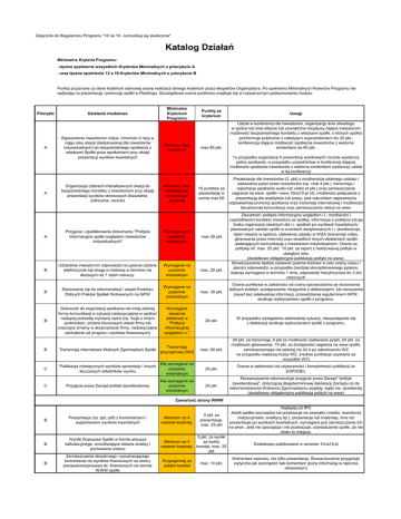 Załącznik do Regulaminu Programu "10 na 10 - komunikuj się skutecznie" Katalog Działań Minimalne Kryteria Programu: - łączne spełnienie wszystkich Kryteriów Minimalnych o priorytecie A - oraz łączne spełnienie 12 z 16 Kryteriów Minimalnych o priorytecie B Punkty przyznane za dane kryterium stanowią ocenę realizacji danego kryterium przez ekspertów Organizatora. Po spełnieniu Minimalnych Kryteriów Programu nie wpływają na prezentację i promocję spółki w Rankingu. Szczegółowa ocena punktowa znajduje się w rozszerzonym podsumowaniu Audytu. Priorytet A A Działanie modelowe Minimalne Kryterium Programu Zapewnienie inwestorom indyw. minimum 2 razy w ciągu roku okazji (dedykowanej dla inwestorów indywidualnych) do bezpośredniego spotkania z władzami Spółki poza spotkaniami przy okazji prezentacji wyników kwartalnych Minimum dwa spotkania* Organizacja czterech interaktywnych okazji do bezpośredniego kontaktu z inwestorami przy okazji prezentacji wyników okresowych (kwartalne, półroczne, roczne) Minimum dwie interaktywne prezentacje wyników Punkty za kryterium max 60 pkt. Uwagi Udział w konferencji dla inwestorów, organizację dnia otwartego w spółce lub inne własne lub zewnętrzne inicjatywy dające inwestorom możliwość bezpośredniego kontaktu z władzami spółki, o których spółka poinformuje publicznie z należytym wyprzedzeniem do 30 pkt.; konferencja dająca możliwość spotkania inwestorów z wieloma emitentami do 60 pkt. *w przypadku organizacji 4 prezentacji wynikowych rocznie wystarczy jedno spotkanie; w przypadku uczestnictwa w konferencji dającej możliwość spotkania inwestorów z wieloma emitentami wystarczy udział w tej konferencji 15 punktów za prezentację w sumie max 60 Prezentacje dla inwestorów (3. pkt) z możliwością zdalnego udziału i zadawania pytań przez inwestorów (np. chat 4 pkt.), transmisja i rejestracja spotkania audio lub video (4 pkt.) oraz zamieszczenie nagrania na www. spółki i www.10na10.pl (4), możliwość połączenia z prezentacją dla analityków lub prasy, pod warunkiem zapewnienia odpowiedniej promocji spotkania oraz transmisji internetowej i możliwości dwustronnej komunikacji oraz zamieszczenia relacji na www. Zawartość: polityka informacyjna względem i.i.; możliwości i częstotliwości kontaktu inwestora ze spółką; informacja o praktyce lub jej braku organizacji otwartych dla i.i. spotkań po wynikach kwartalnych; planowanym udziale spółki w eventach dedykowanych i.i. (konferencje, dzień otwarty w spółce), ułatwienia udziału w WZA (transmisji video, głosowania przez internet) oraz wszelkich innych działaniach spółki ułatwiających komunikację z inwestorem indywidualnym. Ocena za politykę inf. max. 25 pkt; 10 pkt. za raport z realizowanej polityki w ubiegłym roku (dodatkowo obligatoryjna publikacja polityki na www). Stowarzyszenie będzie zadawać pytania testowe w celu oceny czasu i jakości odpowiedzi; w przypadku bardziej skomplikowanego pytania, reakcja wymagana w terminie 1 dnia, odpowiedź merytoryczna do 3 dni roboczych A Przyjęcie i opublikowanie dokumentu "Polityka informacyjna spółki względem inwestorów indywidualnych" Wymagane na poziomie minimalnym max 35 pkt. B Udzielanie inwestorom odpowiedzi na pytania zadane telefonicznie lub drogą e-mailową w terminie nie dłuższym niż 1 dzień roboczy. Wymagane na poziomie minimalnym max. 20 pkt. B Stosowanie się do rekomendacji i zasad Kodeksu Dobrych Praktyk Spółek Notowanych na GPW Wymagane na poziomie minimalnym max. 30 pkt. Ocena punktowa w zależności od oceny sprawozdania ze stosowania dobrych praktyk, postępowanie niezgodne z deklaracjami, lub naruszenie zasad bez adekwatnej informacji, przewidzianej regulaminem GPW, skutkuje wykluczeniem spółki z programu. B Gotowość do organizacji spotkania lub innej zdalnej formy komunikacji w sytuacji nadzwyczajnej w spółce/ rodzącej potrzebę wymiany opinii (np. fuzja z innym podmiotem, zmiana kluczowych władz firmy lub znaczące zmiany w akcjonariacie firmy, nadzwyczajne odchylenie od prognoz i wyników finansowych) Wymagane zawarcie deklaracji w "Polityce informacyjnej względem i.i." 20 pkt. W przypadku wystąpienia adekwatnej sytuacji, niewywiązanie się z deklaracji skutkuje wykluczeniem spółki z programu. max. 60 pkt. 20 pkt. za transmisję, 6 pkt za możliwość zadawania pytań, 24 pkt. za możliwość głosowania, 10 pkt. za dostępność nagrania na www spółki, zamieszczonego nie później niż 24 h po zakończeniu WZ (w przypadku większej liczby WZ, średnia punktacja uzyskana za wszystkie WZ) B Transmisja Transmisja internetowa Walnych Zgromadzeń Spółki przynajmniej ZWZ C Publikacja miesięcznych wyników sprzedaży i innych kluczowych składników wyniku Nie wymagane na poziomie minimalnym 25 pkt. Ocena w zależności od użyteczności i kompletności publikacji (w ESPI/EBI). C Przyjęcie przez Zarząd polityki dywidendowej Nie wymagane na poziomie minimalnym 25 pkt. Stowarzyszenie rekomenduje przyjęcie przez Zarząd "polityki dywidendowej", dotyczącej długoterminowej deklaracji Zarządu co do rekomendowania Walnemu Zgromadzeniu wypłaty, bądź nie, dywidendy (dodatkowo obligatoryjna publikacja polityki na www) Zawartość strony WWW B Prezentacja (np. ppt, pdf) z komentarzem i wyjaśnieniem wyników kwartalnych B Wyniki finansowe Spółki w formie arkusza kalkulacyjnego, umożliwiające własne analizy i porównania wstecz B Zamieszczenie obszernego i wyczerpującego komentarza do wyników finansowych ze strony prezesa/wiceprezesa ds. finansowych na stronie WWW spółki Minimum za 4 ostatnie kwartały, 5 pkt. za prezentację, max. 25 pkt 5 pkt. za wyniki Minimum za 4 za każdy ostatnie kwartały, kwartał, max. 25 pkt Przynajmniej za ostatni kwartał max. 10 pkt. Najlepiej od IPO Jeżeli spółka sporządza lub przekazuje na zewnątrz (media, inwestorzy instytucjonalni, analitycy itp.), prezentacje lub materiały, inne ni