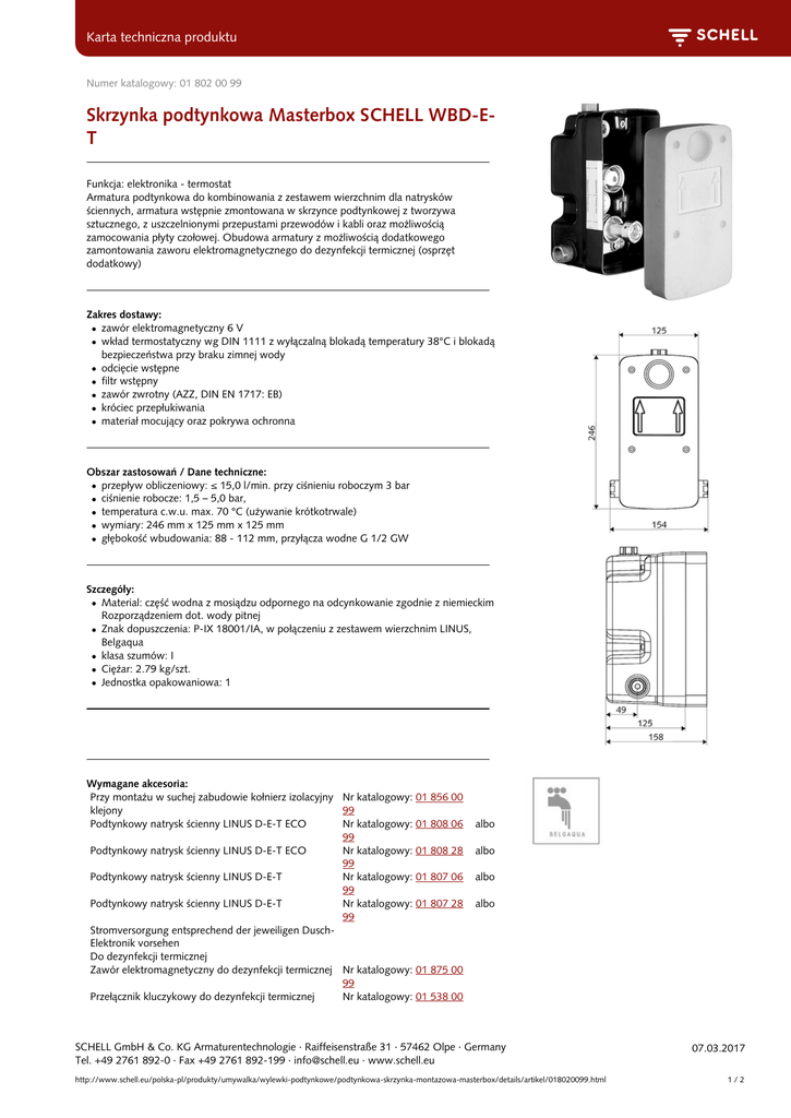 Karta techniczna produktu Numer katalogowy: 01 802 00 99 Skrzynka podtynkowa Masterbox SCHELL WBD-ET Funkcja: elektronika - termostat Armatura podtynkowa do kombinowania z zestawem wierzchnim dla natrysków ściennych, armatura wstępnie zmontowana w skrzynce podtynkowej z tworzywa sztucznego, z uszczelnionymi przepustami przewodów i kabli oraz możliwością zamocowania płyty czołowej. Obudowa armatury z możliwością dodatkowego zamontowania zaworu elektromagnetycznego do dezynfekcji termicznej (osprzęt dodatkowy) Zakres dostawy: zawór elektromagnetyczny 6 V wkład termostatyczny wg DIN 1111 z wyłączalną blokadą temperatury 38°C i blokadą bezpieczeństwa przy braku zimnej wody odcięcie wstępne filtr wstępny zawór zwrotny (AZZ, DIN EN 1717: EB) króciec przepłukiwania materiał mocujący oraz pokrywa ochronna Obszar zastosowań / Dane techniczne: przepływ obliczeniowy: ≤ 15,0 l/min. przy ciśnieniu roboczym 3 bar ciśnienie robocze: 1,5 – 5,0 bar, temperatura c.w.u. max. 70 °C (używanie krótkotrwale) wymiary: 246 mm x 125 mm x 125 mm głębokość wbudowania: 88 - 112 mm, przyłącza wodne G 1/2 GW Szczegóły: Material: część wodna z mosiądzu odpornego na odcynkowanie zgodnie z niemieckim Rozporządzeniem dot. wody pitnej Znak dopuszczenia: P-IX 18001/IA, w połączeniu z zestawem wierzchnim LINUS, Belgaqua klasa szumów: I Ciężar: 2.79 kg/szt. Jednostka opakowaniowa: 1 Wymagane akcesoria: Przy montażu w suchej zabudowie kołnierz izolacyjny Nr katalogowy: 01 856 00 klejony 99 Podtynkowy natrysk ścienny LINUS D-E-T ECO Nr katalogowy: 01 808 06 99 Podtynkowy natrysk ścienny LINUS D-E-T ECO Nr katalogowy: 01 808 28 99 Podtynkowy natrysk ścienny LINUS D-E-T Nr katalogowy: 01 807 06 99 Podtynkowy natrysk ścienny LINUS D-E-T Nr katalogowy: 01 807 28 99 Stromversorgung entsprechend der jeweiligen DuschElektronik vorsehen Do dezynfekcji termicznej Zawór elektromagnetyczny do dezynfekcji termicznej Nr katalogowy: 01 875 00 99 Przełącznik kluczykowy do dezynfekcji termicznej Nr katalogowy: 01 538 00 albo albo albo albo SCHELL GmbH & Co. KG Armaturentechnologie · Raiffeisenstraße 31 · 57462 Olpe · Germany Tel. +49 2761 892-0 · Fax +49 2761 892-199 · [email protected] · www.schell.eu http://www.schell.eu/polska-pl/produkty/umywalka/wylewki-podtynkowe/podtynkowa-skrzynka-montazowa-masterbox/details/artikel/018020099.html 07.03.2017 1/2 Karta techniczna produktu 99 Zasilacz podtynkowy 100 - 240 V, 50 - 60 Hz, 12 V do Nr katalogowy: 01 566 00 1 - 2 zaworów elektromagnetycznych 99 Zasilacz sieciowy 100 - 240 V, 50 - 60 Hz, 12 V dla 1 - Nr katalogowy: 01 490 00 12 zaworów elektromagnetycznych 99 Skrzynka rozdzielcza z zasilaczem sieciowym 100 - 240 Nr katalogowy: 01 537 00 V, 50 - 60 Hz, 12 V dla 1 - 12 zaworów 99 elektromagnetycznych Polecane akcesoria: Moduł montażowy do natrysków LINUS albo albo Nr katalogowy: 03 257 00 99 SCHELL GmbH & Co. KG Armaturentechnologie · Raiffeisenstraße 31 · 57462 Olpe · Germany Tel. +49 2761 892-0 · Fax +49 2761 892-199 · [email protected] · www.schell.eu http://www.schell.eu/polska-pl/produkty/umywalka/wylewki-podtynkowe/podtynkowa-skrzynka-montazowa-masterbox/details/artikel/018020099.html Powered by TCPDF (www.tcpdf.org) 07.03.2017 2/2
