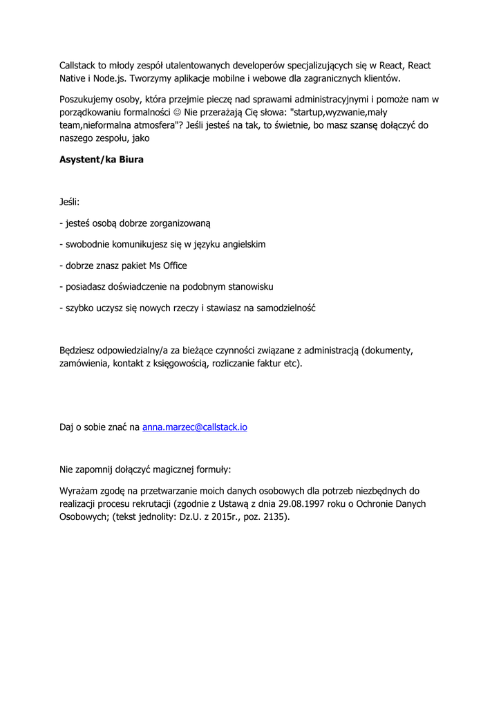 Callstack to młody zespół utalentowanych developerów specjalizujących się w React, React Native i Node.js. Tworzymy aplikacje mobilne i webowe dla zagranicznych klientów. Poszukujemy osoby, która przejmie pieczę nad sprawami administracyjnymi i pomoże nam w porządkowaniu formalności Nie przerażają Cię słowa: "startup,wyzwanie,mały team,nieformalna atmosfera"? Jeśli jesteś na tak, to świetnie, bo masz szansę dołączyć do naszego zespołu, jako Asystent/ka Biura Jeśli: - jesteś osobą dobrze zorganizowaną - swobodnie komunikujesz się w języku angielskim - dobrze znasz pakiet Ms Office - posiadasz doświadczenie na podobnym stanowisku - szybko uczysz się nowych rzeczy i stawiasz na samodzielność Będziesz odpowiedzialny/a za bieżące czynności związane z administracją (dokumenty, zamówienia, kontakt z księgowością, rozliczanie faktur etc). Daj o sobie znać na [email protected] Nie zapomnij dołączyć magicznej formuły: Wyrażam zgodę na przetwarzanie moich danych osobowych dla potrzeb niezbędnych do realizacji procesu rekrutacji (zgodnie z Ustawą z dnia 29.08.1997 roku o Ochronie Danych Osobowych; (tekst jednolity: Dz.U. z 2015r., poz. 2135).