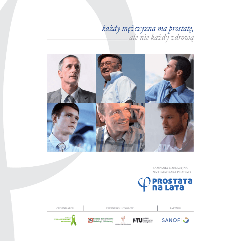 każdy mężczyzna ma prostatę, ale nie każdy zdrową KAMPANIA EDUKACYJNA NA TEMAT RAKA PROSTATY prostata na lata ORGANIZATOR PARTNERZY HONOROWI PARTNER W społeczeństwie pokutuje mit, że prostata to choroba albo stan chorobowy. Tymczasem jest ona jednym z narządów ciała mężczyzny. prostata każdy mężczyzna ma prostatę, ale nie każdy zdrową Stercz/gruczoł krokowy (popularnie zwany prostatą) to gruczoł wielkości kasztana, umiejscowiony poniżej pęcherza moczowego. Pełni funkcje moczowo-płciowe. Jego wydzielina wchodzi w skład spermy i umożliwia plemnikom poruszanie się. Stercz ma około 3-3,5 cm szerokości i może ważyć około 15-20 g, zależnie od budowy mężczyzny. Po urodzeniu stercz jest wielkości groszku i stopniowo wzrasta, najszybciej w okresie dojrzewania. Następnie tempo wzrostu maleje. Mniej więcej w wieku 30 lat narząd osiąga wielkość dojrzałą – typową dla dorosłego mężczyzny. Gruczoł krokowy mężczyzn w wieku od 30 do 50 lat nie zmienia zwykle swojej wielkości. Po 50. roku życia dochodzi zwykle do jego powiększenia, co może być wynikiem procesów starzenia lub zmian w równowadze hormonalnej. rak prostaty Rak prostaty jest to jeden z najczęstszych nowotworów u mężczyzn po 50. roku życia. W Polsce choroba ta zajmuje w populacji męskiej 3 miejsce wśród przyczyn zgonów na choroby nowotworowe. Mikroskopowe elementy tego nowotworu spotyka się już w wieku około 50 lat u prawie 30% mężczyzn i aż u 80% mężczyzn w wieku lat 80. Guz ten rozwija się stosunkowo powoli, niekiedy bezobjawowo. Początkowo objawy mogą sugerować łagodny rozrost stercza, dlatego tak ważne jest wykrycie go w fazie, w której można leczyć go radykalnie i skutecznie. U znacznego odsetka pacjentów, zwłaszcza chorych na nowotwór o niskim stopniu zaawansowania, choroba przebiega bezobjawowo. Wczesnemu wykrywaniu służyć może regularne badanie gruczołu krokowego u urologa. Co najmniej raz w roku zaleca się je osobom, które przekroczyły 50. rok życia lub wcześniej, w przypadku pojawienia się objawów zaburzeń w oddawaniu moczu, lub wówczas, gdy w najbliższej rodzinie (ojciec, brat) odnotowano zachorowanie na raka stercza w młodym wieku. Wielu mężczyzn odwleka wizytę u urologa. Spowodowane jest to zarówno skrępowaniem, jak i brakiem podstawowej wiedzy na temat chorób stercza oraz możliwości ich leczenia. czynniki ryzyka otyłość, siedzący tryb życia, wstrzemięźliwość płciowa, stany zapalne dróg moczowych, czynniki genetyczne. Objawy rozrostu stercza częściej rozpoznaje się u mężczyzn: spożywających dużą ilość mięsa, tłuszczu i małą ilość warzyw, spożywających nadmierne ilości mleka, stosujących używki powodujące obrzęk gruczołu krokowego, w tym alkohol (zwłaszcza wysokoprocentowy), spożywających nadmierną ilość ostrych przypraw, prowadzących stresujący tryb życia. objawy Prawdopodobieństwo zachorowania na raka gruczołu krokowego wzrasta po 50 roku życia. Rak prostaty we wczesnej fazie nie powoduje żadnych dolegliwości. Wykrycie go w tej początkowej, bezobjawowej fazie przez urologa, gwarantuje możliwość zastosowania radykalnej terapii zwiększającej prawdopodobieństwo pełnego wyleczenia. Dopiero zaawansowany rak powoduje dolegliwości podobne do tych, które obserwuje się również w łagodnym rozroście gruczołu krokowego. Należą do nich: częstsze oddawanie moczu w nocy i w dzień, parcie na mocz typu naglącego, zaleganie moczu w pęcherzu, czy też całkowite zatrzymanie moczu. W postaci rozsianej mogą dołączyć się objawy bólowe, związane z przerzutami do układu kostnego. Nie wolno ignorować żadnych dolegliwości ze strony układu moczowego, dlatego każdy mężczyzna po 50 roku życia powinien raz w roku zgłaszać się do urologa na badania kontrolne! badania Bardzo ważne jest badanie stercza przez urologa (DRE czyli badanie per rectum, polegające na ocenie stanu gruczołu palcem przez odbytnicę). Umożliwia ono ocenę wielkości gruczołu krokowego oraz ewentualne wczesne wykrycie zmian w obrębie stercza. Jest to badanie podstawowe, któremu mężczyźni powinni być poddawani raz w roku. Badanie rektalne najszybciej i stosunkowo bezbłędnie wykrywa miejscowe zmiany stercza, o różnym charakterze. Kolejnym krokiem w przypadku podejrzenia raka stercza lub określenia grupy ryzyka jest badanie krwi, w celu oznaczenia czynności nerek i badanie stężenia markera nowotworowego charakterystycznego dla raka stercza - tzw. antygenu PSA. W surowicy krwi PSA ulega wzrostowi w stanach zapalnych i, głównie, w raku stercza. Podwyższone stężenie PSA jest ważnym objawem i może służyć, w przypadku potwierdzenia diagnozy nowotworowej, do monitorowania postępu choroby. Dzięki temu możliwe jest wykrycie choroby w jej bezobjawowej fazie. Umożliwia to wczesne, najlepiej rokujące leczenie raka, zanim pojawią się przerzuty do węzłów chłonnych i kości. Stopień opróżnienia pęcherza i obecność wcześniej opisanych powikłań można przeanalizować w oparciu o ultrasonografię (badanie ultrasonograficzne umożliwia ocenę nerek, pęcherza moczowego, wymiarów stercza i objętości moczu, jaka pozostaje w pęcherzu po zakończeniu jego oddawania). Dokładne pomiary stercza oraz jego budowę można jedynie ocenić w ultrasonograficznym badaniu przezodbytniczym (TRUS). leczenie W leczeniu raka gruczołu krokowego, w zależności od stopnia zaawansowania oraz dodatkowych czynników określanych przez lekarza, możemy stosować: leczenie chirurgiczne, radioterapię, hormonoterapię, chemioterapię. W niektórych, uzasadnionych, wypadkach można również wyłącznie obserwować pacjenta, aby podjąć odpowiednie kroki we właściwym momencie. O wyborze sposobu leczenia decyduje wiele czynników, m.in. stopień zaawansowania choroby, stopień złośliwości nowotworu, schorzenia współistniejące oraz wiek chorego. nowotwór wcześnie wykryty 