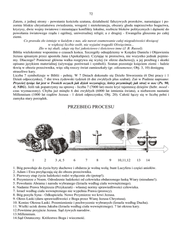72 Zatem, z jednej strony - powstanie kościoła szatana, działalność fałszywych proroków, narastające i pozornie bliskie chrystiaństwu zwiedzenia, wrogość i nietolerancja, obszary głodu naprzeciwko bogactwa, kryzysy, dwie wojny światowe i nieustające konflikty lokalne, rozbicie bloków politycznych i dążność do powołania światowego rządu i ogólnej, uniwersalnej religii; a z drugiej - Ewangelia głoszona po całej ziemi. Co prawda zło istnieje w każdym z nas, ale nawet zsumowanie całej niegodziwości tkwiącej w większej liczbie osób, nie wyjaśni tragedii Oświęcimia... Zło w tej skali, zdaje się być jakościowo i ilościowo inne (J. B. Russel). Biblia wielokrotnie wspomina o czasach końca. Szczegóły odnajdziemy w Księdze Daniela i Objawieniu Jezusa spisanym przez apostoła Jana (Apokalipsie). Czytając te proroctwa, nie wszystko jednak pojmiemy. Dlaczego? Ponieważ główna walka rozgrywa się wyżej (w sferze duchowej), a jej przebieg i skutki opisano językiem materialnej (używając porównań i symboli). Szatan pozostaje księciem ziemi - ludzie tkwią w obozie przeciwnika, więc siłą rzeczy świat zamieszkały (gr. oikoumenee; Obj. 3, 10) dosięgną straszliwe kary. Liczba 7 symbolizuje w Biblii - pełnię. W 7 Dniach dokonało się Dzieło Stworzenia (6 Dni pracy i 1 Dzień odpoczynku), 7 dni trwa żydowski tydzień (6 dni zwykłych plus szabat). Zaś w Psalmie napisano: Przecież tysiąc lat jest w Twoich oczach jak dzień wczorajszy, który przeminął; jak straż w noc (Ps. 90, 4; NBG). Jeśli tak popatrzymy na sprawę - liczba 7 (7000 lat) może kryć tajemnicę dziejów (hebr. moed czas wyznaczony). Chyba już minęło 6 dni zwykłych (6000 lat istnienia świata), a niebawem nastanie Millennium (1000 lat rządów Jezusa - 1 dzień odpoczynku; Obj. 20). Całość łączy się w liczbę pełni i zamyka stary porządek. PRZEBIEG PROCESU 1 2 3 ,4, 5 6 7 8 9 10,11,12 13 14 1. Bóg powołuje do życia byty duchowe i obdarza je wolną wolą; bunt Lucyfera i części aniołów. 2. Adam i Ewa przyłączają się do obozu przeciwnika. 3. Pierwszy etap życia ludzkości rodzi wyłącznie zło (potop!). 4. Przymierze z Noem. Odrodzenie ludzkości od człowieka obdarzonego łaską Wiary (nieudane!). 5. Powołanie Abrama i narodu wybranego (Izraela według ciała wewnętrznego). 6. Nadanie Prawa Mojżesza (Przykazań) - własnej normy sprawiedliwości człowieka. 7. Izrael według ciała wewnętrznego nie wypełnia Prawa (prorocy). 8. Bóg posyła Syna - Odkupiciela. Nowe Przymierze we krwi Jezusa. 9. Okres Łaski (daru sprawiedliwości z Boga przez Wiarę Jezusa Chrystusa). 10. Koniec Okresu Łaski. Przemienienie i pochwycenie wybranych (Izraela według Ducha). 11. Wielki ucisk domu Jakuba (Izraela według ciała wewnętrznego). 7 lat okresu kary. 12.Powtórne przyjście Jezusa. Sąd żywych narodów. 13.Millennium. 14.Sąd Ostateczny. Królestwo Boga i wieczność.