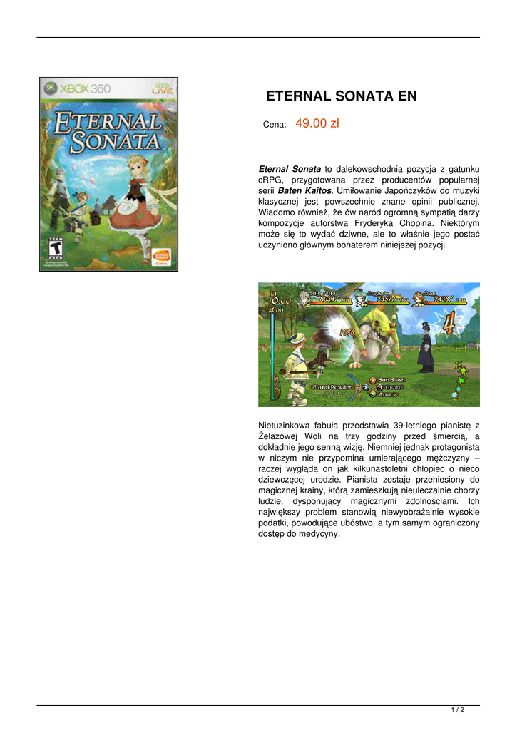 ETERNAL SONATA EN Cena: 49.00 zł Eternal Sonata to dalekowschodnia pozycja z gatunku cRPG, przygotowana przez producentów popularnej serii Baten Kaitos. Umiłowanie Japończyków do muzyki klasycznej jest powszechnie znane opinii publicznej. Wiadomo również, że ów naród ogromną sympatią darzy kompozycje autorstwa Fryderyka Chopina. Niektórym może się to wydać dziwne, ale to właśnie jego postać uczyniono głównym bohaterem niniejszej pozycji. Nietuzinkowa fabuła przedstawia 39-letniego pianistę z Żelazowej Woli na trzy godziny przed śmiercią, a dokładnie jego senną wizję. Niemniej jednak protagonista w niczym nie przypomina umierającego mężczyzny – raczej wygląda on jak kilkunastoletni chłopiec o nieco dziewczęcej urodzie. Pianista zostaje przeniesiony do magicznej krainy, którą zamieszkują nieuleczalnie chorzy ludzie, dysponujący magicznymi zdolnościami. Ich największy problem stanowią niewyobrażalnie wysokie podatki, powodujące ubóstwo, a tym samym ograniczony dostęp do medycyny. 1/2 U boku Fryderyka staje niewiasta o wdzięcznym imieniu Polka oraz jej towarzysz Allegretto, próbujący znaleźć lekarstwo dla młodej kobiety. Z tego względu, że akcja ma miejsce w wyobraźni kompozytora w jego drużynie pojawiają się osoby nazwane w sposób bezpośrednio związany z muzyką, m.in. Salsa, Beat i Viola. Łącznie w zabawie znajduje się dziesięciu bohaterów, biorących w niej czynny udział. Wcielając się w nich i przemierzając wirtualne środowisko należy zwracać uwagę na zbieranie rozmaitych artefaktów oraz pamiętać o rozmawianiu z postaciami pobocznymi. Ponadto nikogo nie powinny dziwić małe smoki, mówiące koty oraz gigantyczne i niezwykle wojownicze cebule. Zobacz wideo: Szczegóły wersja językowa ANGIELSKA 2/2 Powered by TCPDF (www.tcpdf.org)