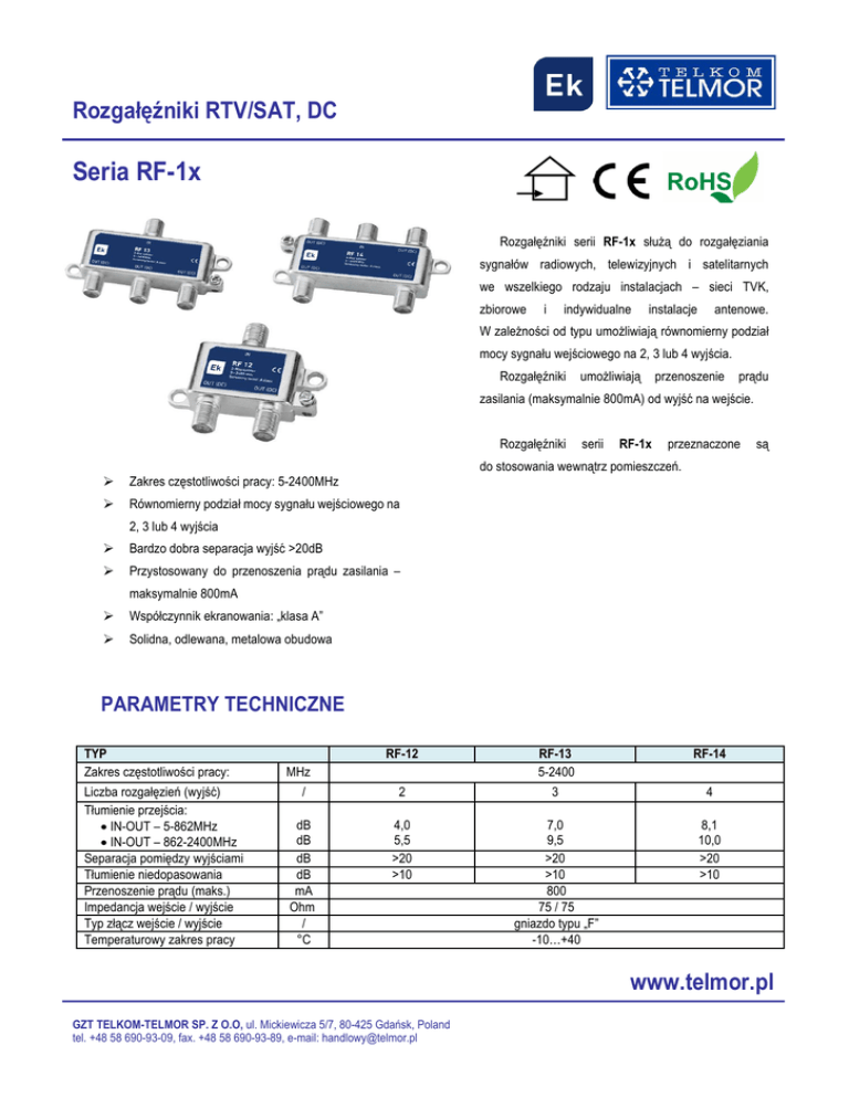 Rozgałęźniki RTV/SAT, DC Seria RF-1x Rozgałęźniki serii RF-1x służą do rozgałęziania sygnałów radiowych, telewizyjnych i satelitarnych we wszelkiego rodzaju instalacjach – sieci TVK, zbiorowe i indywidualne instalacje antenowe. W zależności od typu umożliwiają równomierny podział mocy sygnału wejściowego na 2, 3 lub 4 wyjścia. Rozgałęźniki umożliwiają przenoszenie prądu zasilania (maksymalnie 800mA) od wyjść na wejście. Rozgałęźniki serii RF-1x przeznaczone są do stosowania wewnątrz pomieszczeń. Zakres częstotliwości pracy: 5-2400MHz Równomierny podział mocy sygnału wejściowego na 2, 3 lub 4 wyjścia Bardzo dobra separacja wyjść >20dB Przystosowany do przenoszenia prądu zasilania – maksymalnie 800mA Współczynnik ekranowania: „klasa A” Solidna, odlewana, metalowa obudowa PARAMETRY TECHNICZNE TYP Zakres częstotliwości pracy: Liczba rozgałęzień (wyjść) Tłumienie przejścia: IN-OUT – 5-862MHz IN-OUT – 862-2400MHz Separacja pomiędzy wyjściami Tłumienie niedopasowania Przenoszenie prądu (maks.) Impedancja wejście / wyjście Typ złącz wejście / wyjście Temperaturowy zakres pracy RF-12 RF-13 5-2400 RF-14 / 2 3 4 dB dB dB dB mA Ohm / °C 4,0 5,5 >20 >10 7,0 9,5 >20 >10 800 75 / 75 gniazdo typu „F” -10…+40 8,1 10,0 >20 >10 MHz www.telmor.pl GZT TELKOM-TELMOR SP. Z O.O, ul. Mickiewicza 5/7, 80-425 Gdańsk, Poland tel. +48 58 690-93-09, fax. +48 58 690-93-89, e-mail: [email protected]
