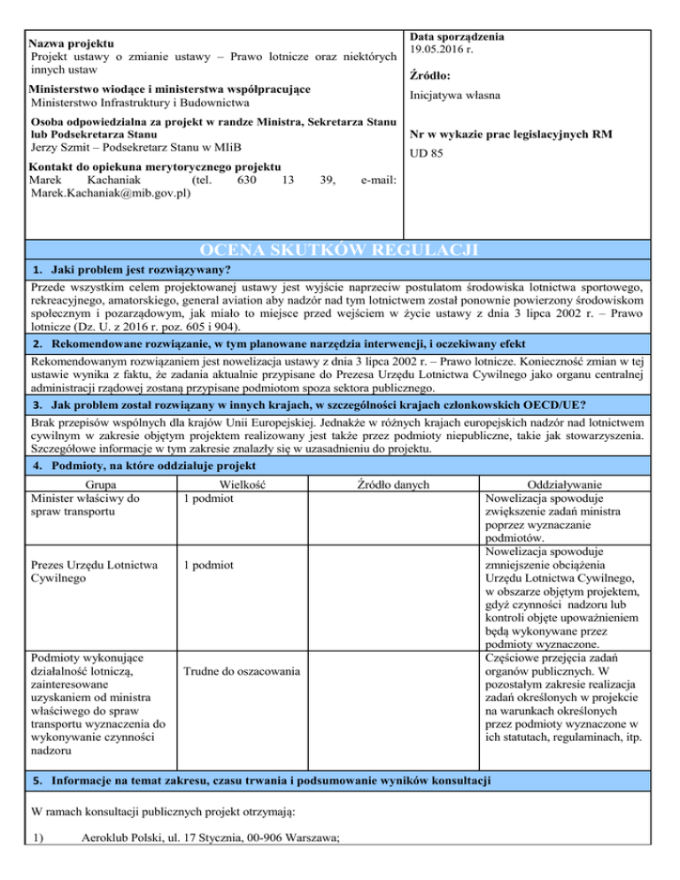 Nazwa projektu Projekt ustawy o zmianie ustawy – Prawo lotnicze oraz niektórych innych ustaw Data sporządzenia 19.05.2016 r. Źródło: Ministerstwo wiodące i ministerstwa współpracujące Ministerstwo Infrastruktury i Budownictwa Inicjatywa własna Osoba odpowiedzialna za projekt w randze Ministra, Sekretarza Stanu lub Podsekretarza Stanu Jerzy Szmit – Podsekretarz Stanu w MIiB Nr w wykazie prac legislacyjnych RM Kontakt do opiekuna merytorycznego projektu Marek Kachaniak (tel. 630 13 [email protected]) 39, UD 85 e-mail: OCENA SKUTKÓW REGULACJI 1. Jaki problem jest rozwiązywany? Przede wszystkim celem projektowanej ustawy jest wyjście naprzeciw postulatom środowiska lotnictwa sportowego, rekreacyjnego, amatorskiego, general aviation aby nadzór nad tym lotnictwem został ponownie powierzony środowiskom społecznym i pozarządowym, jak miało to miejsce przed wejściem w życie ustawy z dnia 3 lipca 2002 r. – Prawo lotnicze (Dz. U. z 2016 r. poz. 605 i 904). 2. Rekomendowane rozwiązanie, w tym planowane narzędzia interwencji, i oczekiwany efekt Rekomendowanym rozwiązaniem jest nowelizacja ustawy z dnia 3 lipca 2002 r. – Prawo lotnicze. Konieczność zmian w tej ustawie wynika z faktu, że zadania aktualnie przypisane do Prezesa Urzędu Lotnictwa Cywilnego jako organu centralnej administracji rządowej zostaną przypisane podmiotom spoza sektora publicznego. 3. Jak problem został rozwiązany w innych krajach, w szczególności krajach członkowskich OECD/UE? Brak przepisów wspólnych dla krajów Unii Europejskiej. Jednakże w różnych krajach europejskich nadzór nad lotnictwem cywilnym w zakresie objętym projektem realizowany jest także przez podmioty niepubliczne, takie jak stowarzyszenia. Szczegółowe informacje w tym zakresie znalazły się w uzasadnieniu do projektu. 4. Podmioty, na które oddziałuje projekt Grupa Minister właściwy do spraw transportu Wielkość 1 podmiot Prezes Urzędu Lotnictwa Cywilnego 1 podmiot Podmioty wykonujące działalność lotniczą, zainteresowane uzyskaniem od ministra właściwego do spraw transportu wyznaczenia do wykonywanie czynności nadzoru Trudne do oszacowania Źródło danych Oddziaływanie Nowelizacja spowoduje zwiększenie zadań ministra poprzez wyznaczanie podmiotów. Nowelizacja spowoduje zmniejszenie obciążenia Urzędu Lotnictwa Cywilnego, w obszarze objętym projektem, gdyż czynności nadzoru lub kontroli objęte upoważnieniem będą wykonywane przez podmioty wyznaczone. Częściowe przejęcia zadań organów publicznych. W pozostałym zakresie realizacja zadań określonych w projekcie na warunkach określonych przez podmioty wyznaczone w ich statutach, regulaminach, itp. 5. Informacje na temat zakresu, czasu trwania i podsumowanie wyników konsultacji W ramach konsultacji publicznych projekt otrzymają: 1) Aeroklub Polski, ul. 17 Stycznia, 00-906 Warszawa; 2) Aeroklub Rzeczypospolitej Polskiej, ul. Orła Białego 12, 78-449 Borne Sulinowo; 3) Business Center Club – Związek Pracodawców, Plac Żelaznej Bramy 10, 00-136 Warszawa; 4) Forum Związków Zawodowych, Plac Teatralny 4, 85–069 Bydgoszcz; 5) IATA Polska, ul. Szpitalna 6/1b, 00-031 Warszawa; 6) Instytut Meteorologii i Gospodarki Wodnej PIB, ul. Podleśna 61, 01-673 Warszawa; 7) Krajowa Rada Lotnictwa ul. Fabryczna16-22/23, 00-446 Warszawa; 8) Krajowe Towarzystwo Lotnicze AOPA POLAND, Lotnisko Babice, ul. Gen. Kaliskiego 57 lok. 11, 01-146; 9) NSZZ „Solidarność”, ul. Wały Piastowskie 24, 80–855 Gdańsk; 10) Ogólnopolskie Porozumienie Związków Zawodowych, ul. Kopernika 36/40, 00–924 Warszawa; 11) Pracodawcy Rzeczypospolitej Polskiej, ul. Brukselska 7, 03-973 Warszawa; 12) Polska Konfederacja Pracodawców Prywatnych – Lewiatan, ul. Zbyszka Cybulskiego 3, 00–727 Warszawa; 13) Polska Agencja Żeglugi Powietrznej, ul. Wieżowa 8, 02-147 Warszawa; 14) Polski Klub Lotniczy ul. Świeradowska 43, 02-662 Warszawa (Uczelnia Łazarskiego); 15) Polskie Centrum Kształcenia Lotniczego, ul. Dębowa 6, 96-321 Skuły – Żabia Wola; 16) Polskie Centrum Badań i Certyfikacji, ul. Kłobucka 23A, 02-699 Warszawa; 17) Polskie Stowarzyszenie Motoszybowcowe, ul. Ustrzycka 1 , 61-324 Poznań; 18) Polskie Stowarzyszenie Paralotniowe, ul. Nad Wisłą 4A, 04-987 Warszawa; 19) Stowarzyszenie Lotnictwa Eksperymentalnego EAA 991, ul. Mikołaja Kopernika 5, 33-300 Nowy Sącz; 20) Stowarzyszenie Instruktorów Lotniowych i Paralotniowych, Rydygiera 11/4, 50-248 Wrocław; 21) Stowarzyszenie Mechaników Lotniczych „SML”, ul. Szkolna 28, 05-822 Milanówek; 22) Związek Polskich Spadochroniarzy, ul. 11 listopada 17/19, blok 1, 03-446 Warszawa; 23) Związek Rzemiosła Polskiego, skr. poczt. 54, 00–952 Warszawa; 24) Związek Regionalnych Portów Lotniczych, ul. Złota 59, 00-120 Warszawa; 25) RFgroup Kancelaria Ułatwień Lotniczych, ul. Rogalskiego 2 lok. 70, 03-982 Warszawa, 26) Aeroklub Krainy Jezior, ul. Olsztyńska 15 A, 11-500 Giżycko. 6. Wpływ na sektor finansów publicznych (ceny stałe z …… r.) Dochody ogółem budżet państwa Skutki w okresie 10 lat od wejścia w życie zmian [mln zł] 3 4 5 6 7 8 9 10 Łącznie (0-10) 0 1 2 0,35 1 0,35 1 0,35 1 0,35 1 0,35 1 0,35 1 0,35 1 0,35 1 0,35 1 0,35 1 0,35 1 0,35 1 0,35 1 0,35 1 0,35 1 0,35 1 0,35 1 0,35 1 0,35 1 0,35 1 0,35 1 0,35 1 3,861 3,861 JST pozostałe jednostki (oddzielnie) Wydatki ogółem budżet państwa JST pozostałe jednostki (oddzielnie) Saldo ogółem budżet państwa JST pozostałe jednostki (oddzielnie) Źródła finansowania Budżet państwa Dodatkowe informacje, w tym wskazanie źródeł danych i przyjętych do obliczeń założeń Zmniejszenie dochodów budżetu państwa wynika z planowanego usunięcia z przepisów ustawy Prawo lotnicze tytułów do pobierania tej opłaty związanych z wykonywanymi do tej pory czynnościami urzędowymi dotyczącymi urządzeń latających. Szacuje się, że zmniejszenie wpływów dochodów budżetu państwa z tytułu omawianej zmiany wyniesie ok
