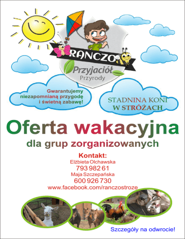 Gwarantujemy niezapomnianą przygodę i świetną zabawę! STADNINA KONI W STRÓŻACH Oferta wakacyjna dla grup zorganizowanych Kontakt: Elżbieta Olchawska 793 982 61 Maja Szczepańska 600 926 730 www.facebook.com/ranczostroze Szczegóły na odwrocie! Plan dnia na naszym RANCZO: 1. Poznajemy zwierzęta • KONIE Dzieci wraz z opiekunem będą miały możliwość obejrzenia wszystkich pomieszczeń stajni (boksy, myjnia, ujeżdżalnia, paszarnia, siodlarnia). Dowiedzą się jak karmić i pielęgnować konie (dla chętnych, starszych przewidziano zajęcia praktyczne). • KOZY karmienie i głaskanie • KURY Kurnik z wybiegiem- kury, koguty, bażanty • PSY HUSKY 2. Przejażdżka na wybranym koniu Możliwość wy najęcia autobusu 3. Gry i zabawy na świeżym powietrzu Do wyboru m. in. trampolina, przeciąganie liny, robienie baniek mydlanych, trambambula, badminton, skoki na piłkach i inne. 4. Malowanie twarzy 5. Ognisko CENA: 25 ZŁ/OS OPIEKUNOWIE GRATIS!!! (prowiant we własnym zakresie) 6. Wręczenie każdemu dziecku dyplomu przyjaciela przyrody Obejrzyj zdjęcia z wycieczek na stronie www.facebook.com/ranczostroze