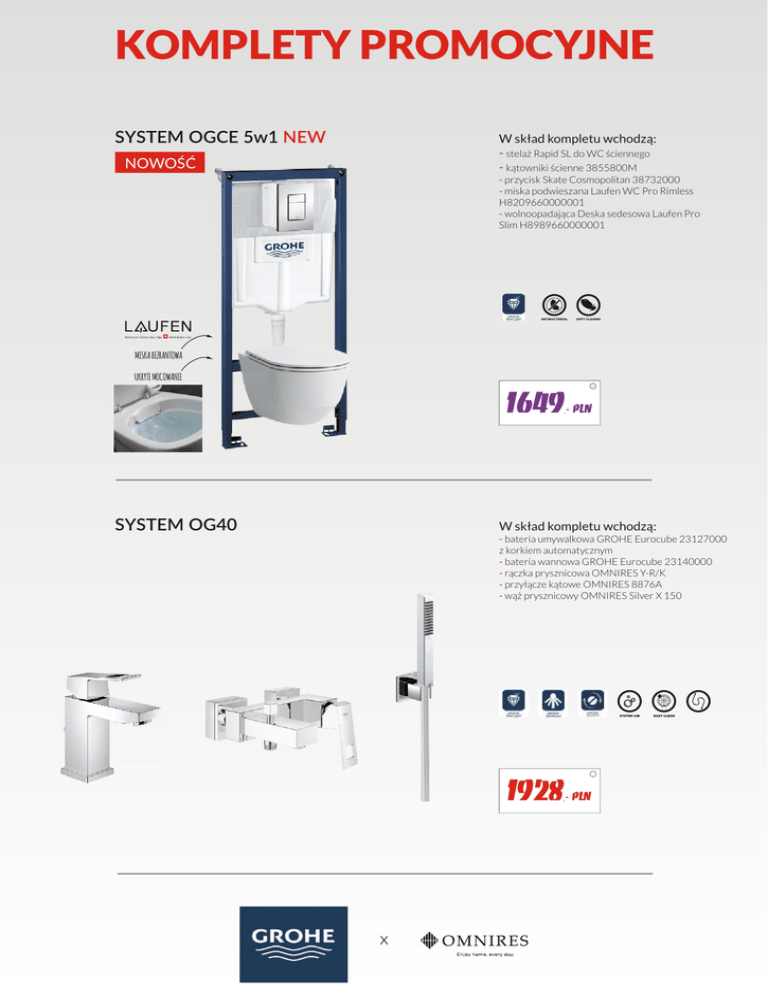 SYSTEM OGCE 5w1 NEW NOWOŚĆ W skład kompletu wchodzą: - stelaż Rapid SL do WC ściennego - kątowniki ścienne 3855800M - przycisk Skate Cosmopolitan 38732000 - miska podwieszana Laufen WC Pro Rimless H8209660000001 - wolnoopadająca Deska sedesowa Laufen Pro Slim H8989660000001 ANTIBACTERIAL SOFT CLOSING MISKA BEZRANTOWA UKRYTE MOCOWANIE 1649,- PLN SYSTEM OG40 W skład kompletu wchodzą: - bateria umywalkowa GROHE Eurocube 23127000 z korkiem automatycznym - bateria wannowa GROHE Eurocube 23140000 - rączka prysznicowa OMNIRES Y-R/K - przyłącze kątowe OMNIRES 8876A - wąż prysznicowy OMNIRES Silver X 150 1928,- PLN SYSTEM OG20P W skład kompletu wchodzą: - bateria umywalkowa GROHE Eurocube 23132000 - korek klik-klak OMNIRES Q706 - bateria wannowa podtynkowa GROHE Eurocube 19896000 - element podtynkowy GROHE Rapido E 35501000 - ramię prysznicowe OMNIRES RA12 - deszczownica OMNIRES SlimLine WG225 - rączka prysznicowa OMNIRES Y-R/K - przyłącze kątowe OMNIRES 8876 - wąż prysznicowy OMNIRES Silver X 150 2535,- PLN SYSTEM OG30P W skład kompletu wchodzą: - bateria umywalkowa GROHE Eurocube 23132000 - korek klik-klak OMNIRES Q706 - bateria wannowa podtynkowa GROHE Eurocube 19896000 - element podtynkowy GROHE Rapido E 35501000 - ramię prysznicowe OMNIRES RA12 - deszczownica OMNIRES SlimLine WG225 - rączka prysznicowa OMNIRES Y-R/K - przyłącze kątowe OMNIRES 8870 - drążek prysznicowy OMNIRES DR08 - wąż prysznicowy OMNIRES Silver X 150 2601,- PLN SYSTEM OG23P W skład kompletu wchodzą: 20 x 20 cm - bateria wannowa podtynkowa (część podtynkowa i natynkowa) GROHE Eurosmart 33305002 - ramię prysznicowe OMNIRES RA01 - deszczownica OMNIRES Ultra SlimLine WGU120 - rączka prysznicowa OMNIRES Yosemite-R 5-funkcyjna - przyłącze kątowe OMNIRES 8873 - wąż prysznicowy OMNIRES Silver X 150 1091,- PLN SYSTEM OG33P W skład kompletu wchodzą: 20 x 20 cm - bateria wannowa podtynkowa (część podtynkowa i natynkowa) GROHE Eurosmart 33305002 - ramię prysznicowe OMNIRES RA01 - deszczownica OMNIRES Ultra SlimLine WGU120 - zestaw prysznicowy 3-funkcyjny na drążku suwanym GROHE New Tempesta 27794000 - przyłącze kątowe Omnires S008 1204,- PLN