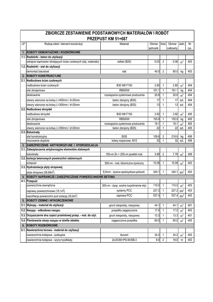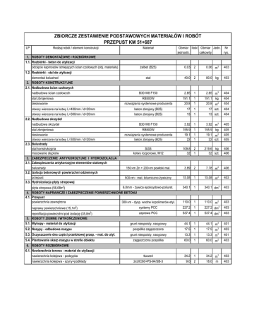 ZBIORCZE ZESTAWIENIE PODSTAWOWYCH MATERIAŁÓW I ROBÓT PRZEPUST KM 51+687 LP Rodzaj robót / element konstrukcji Materiał Obmiar Ilość Obmiar Jedn. Nr jednostk. całkowity rys. 1. ROBOTY DEMONTAśOWE I ROZBIÓRKOWE 1.1. Rozbiórki - beton do utylizacji odcięcie kapinosów istniejących ścian czołowych (obj. materiału) Ŝelbet (B25) 0.03 2 0.06 m3 403 stal 40.0 2 80.0 kg 403 B30 W8 F150 2.85 1 RB500W rozwiązania systemowe producenta 191.1 1 20.8 1 2.85 m3 191.1 kg 20.8 m2 404 404 beton zbrojony (B25) beton zbrojony (B25) 17 13 1 1 17 szt. 13 szt. 404 404 B30 W8 F150 3.92 1 RB500W rozwiązania systemowe producenta beton zbrojony (B25) 155.9 1 19.1 1 22 1 3.92 m3 155.9 kg 19.1 m2 22 szt. 405 405 405 St3S kotwy rozporowe, M12 109.8 2 32 1 219.6 kg 32 szt. 406 406 150µm Zn + 200µm powłoki mal. 3.89 2 7.78 m2 406 500µm - mat. bitumiczno-Ŝywiczny 15.08 1 15.08 m2 403 340.1 1 340.1 dm3 403 110.0 1 110.0 m2 227.2 dm3 403 3 403 1.2. Rozbiórki - stal do utylizacji demontaŜ balustrad 2. ROBOTY KONSTRUKCYJNE 2.1. Nadbudowa ścian czołowych nadbudowa ścian czołowych stal zbrojeniowa deskowanie otwory wiercone na kotwy L=400mm / d=20mm otwory wiercone na kotwy L=300mm / d=20mm 2.2. Nadbudowa skrzydeł nadbudowa skrzydeł stal zbrojeniowa deskowanie otwory wiercone na kotwy L=300mm / d=20mm 2.3. Balustrady stal konstrukcyjna mocowanie słupków 3. ZABEZPIECZENIE ANTYKOROZYJNE I HYDROIZOLACJA 3.1. Zabezpieczenia antykorozyjne elementów stalowych balustrady 3.2. Izolacja betonowych powierzchni odziemnych przepust 3.3. Hydroizolacja płyty stropowej 6,0mm - Ŝywica epoksydowo-poliuret. płyta stropowa (56,68m2) 4. ROBOTY NAPRAWCZE I ZABEZPIECZENIE POWIERZCHNIOWE BETONU 4.1. Przepust powierzchnia zewnętrzna 300µm - dysp. wodne kopolimerów etyl. 2 systemy PCC naprawy powierzchniowe (15,1m ) 2 reprofilacja powierzchni pod izolację (35,8m ) 5. ROBOTY ZIEMNE I WYKOŃCZENIOWE 5.1. Wykopy - materiał do utylizacji 5.2. Nasypy - odbudowa nasypu 5.3. Oczyszczenie dna części przelotowej przep. - mat. do utyl. 5.4. Plantowanie skarp nasypu w strefie obiektu 227.2 1 404 405 403 zaprawa PCC 537.4 1 537.4 dm grunt niespoisty, nasypowy 44.1 1 44.1 m3 17.5 m3 401 13.3 m3 60.0 m2 401 34.2 m3 18.0 m 403 pospółka zagęszczona 17.5 1 grunt niespoisty, nasypowy 13.3 1 zagęszczona pospółka 60.0 1 tłuczeń 34.2 1 403 403 6. ROBOTY ROZBIÓRKOWE 6.1. Nawierzchnia torowa - materiał do utylizacji nawierzchnia kolejowa - podsypka nawierzchnia kolejowa - szyny+podkłady 2xUIC60+PS-94/SB-3 9.0 2 403