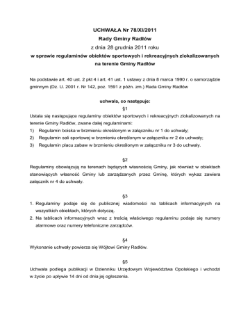 UCHWAŁA Nr 78/XI/2011 Rady Gminy Radłów z dnia 28 grudnia 2011 roku w sprawie regulaminów obiektów sportowych i rekreacyjnych zlokalizowanych na terenie Gminy Radłów Na podstawie art. 40 ust. 2 pkt 4 i art. 41 ust. 1 ustawy z dnia 8 marca 1990 r. o samorządzie gminnym (Dz. U. 2001 r. Nr 142, poz. 1591 z późn. zm.) Rada Gminy Radłów uchwala, co następuje: §1 Ustala się następujące regulaminy obiektów sportowych i rekreacyjnych zlokalizowanych na terenie Gminy Radłów, zwane dalej regulaminami: 1) Regulamin boiska w brzmieniu określonym w załączniku nr 1 do uchwały; 2) Regulamin sali sportowej w brzmieniu określonym w załączniku nr 2 do uchwały; 3) Regulamin placu zabaw w brzmieniu określonym w załączniku nr 3 do uchwały. §2 Regulaminy obowiązują na terenach będących własnością Gminy, jak również w obiektach stanowiących własność Gminy lub zarządzanych przez Gminę, których wykaz zawiera załącznik nr 4 do uchwały. §3 1. Regulaminy podaje się do publicznej wiadomości na tablicach informacyjnych na wszystkich obiektach, których dotyczą. 2. Na tablicach informacyjnych wraz z treścią właściwego regulaminu podaje się numery alarmowe oraz numery telefoniczne zarządców. §4 Wykonanie uchwały powierza się Wójtowi Gminy Radłów. §5 Uchwała podlega publikacji w Dzienniku Urzędowym Województwa Opolskiego i wchodzi w życie po upływie 14 dni od dnia jej ogłoszenia. Załącznik nr 1 do uchwały Nr78/XI/2011 Rady Gminy Radłów z dnia 28 grudnia 2011 r. REGULAMIN BOISKA §1 Boisko to ogólnodostępny obiekt służący do rozgrywania meczów i innych zawodów oraz przeprowadzania zajęć sportowych i rekreacyjnych. §2 1. Boisko czynne jest codziennie. 2. Boisko jest nieczynne w godzinach nocnych. §3 Wstęp na teren boiska jest bezpłatny. §4 Z zastrzeżeniem § 5 regulaminu, z boiska mogą korzystać osoby małoletnie. §5 Dzieci poniżej 7 roku życia korzystają z boiska wyłącznie pod opieką osób pełnoletnich. §6 Korzystanie z boiska nie może stwarzać zagrożenia dla innych osób. §7 Na terenie boiska zabrania się: 1) huśtania się na bramkach i innych metalowych elementach wyposażenia boiska oraz użytkowania ich w inny sposób niezgodny z przeznaczeniem; 2) montowania sprzętu lub urządzeń własnej konstrukcji; 3) wjazdu na teren boiska wszelkich pojazdów mechanicznych z wyjątkiem pojazdów uprzywilejowanych, obsługi technicznej i innych pojazdów za zgodą zarządcy boiska; 4) jazdy na rolkach lub deskorolkach; 5) używania materiałów pirotechnicznych albo innych niebezpiecznych materiałów lub substancji chemicznych, z zastrzeżeniem uzyskania pisemnej zgody zarządcy boiska. Niniejszy paragraf nie ma zastosowania w czasie zawodów sportowych lub treningów zorganizowanych zgodnie z odrębnymi przepisami. §8 Osoby niszczące sprzęt lub urządzenia znajdujące się na boisku ponoszą odpowiedzialność materialną za wyrządzone szkody. Załącznik nr 2 do uchwały78/XI/2011 Rady Gminy Radłów z dnia 28 grudnia 2011 r. REGULAMIN SALI SPORTOWEJ §1 1. Sala sportowa jest obiektem służącym do przeprowadzania zajęć i rozgrywek sportowych oraz innych imprez rekreacyjno-sportowych i kulturalnych. 2. Sala sportowa nie jest powszechnie dostępna. Zajęcia w sali odbywają się według wcześniej ustalonego harmonogramu. 3. Sala sportowa jest czynna w godzinach ustalonych przez dyrektora lub kierownika gminnej jednostki organizacyjnej, na której terenie sala 00 z zastrzeżeniem, iż w dni powszednie w godzinach od 8 jest 00 do 15 zlokalizowana, sala sportowa udostępniona jest przede wszystkim na realizację zajęć dydaktycznych z zakresu wychowania fizycznego dla szkół gminnych. 4. Z zastrzeżeniem ust. 3 sala sportowa udostępniana jest osobom fizycznym lub zorganizowanym grupom. §2 1. Za udostępnianie sali sportowej, o którym mowa w § 1 ust. 4 pobierane są opłaty według stawki godzinowej lub miesięcznej, ustalonej Zarządzeniem Wójta Gminy, a w przypadku oddania obiektu w trwały zarząd - jednostce organizacyjnej Gminy Radłów ustalonej, przez dyrektora lub kierownika tej jednostki, na której terenie sala jest zlokalizowana. 2. W uzasadnionych przypadkach osoba wymieniona w ust. 1 może zwolnić z odpłatności osoby korzystające z sali sportowej. §3 Z sali sportowej mogą korzystać: 1) dzieci i młodzież szkolna pod nadzorem nauczycieli lub instruktorów; 2) kluby, sekcje i związki sportowe pod nadzorem instruktora lub trenera; 3) zakłady pracy, instytucje, organizacje; 4) osoby, które wykupiły bilet, karnet lub biorą udział w zorganizowanych zawodach lub zajęciach. §4 1. Korzystający z sali sportowej zobowiązani są używać strojów sportowych oraz obuwia sportowego. 2. Osoby korzystające z sali sportowej oraz prowadzące zajęcia zobowiązuje się do: 1) punktualnego rozpoczynania i kończenia zajęć; 2) przestrzegania przepisów bhp, ppoż. i porządkowych; 3) podporządkowania się poleceniom personelu obiektów sportowych i prowadzącego zajęcia. 3. Na terenie sali sportowej obowiązuje nakaz zachowania porządku i czystości. 4. Osoby korzystające z sali sportowej powinny zabezpieczyć we własnym zakresie należące do nich mienie wartościowe. 5. O wszelkich przypadkach uszkodzenia sprzętu, wyposażenia, urządzeń oraz występujących zagrożeniach należy natychmiast powiadomić osoby prowadzące zajęcia i obsługę sali sportowej. 6. Za bezpieczeństwo i przestrzeganie regulaminu sali sportowej odpowiedzialni są prowadzący zajęcia oraz organizatorzy zawodów, imprez sportowych i innych zajęć. §5 Zabrania się wnoszenia na salę sportową: 1) wszelkiego rodzaju niebezpiecznych przedmiotów, materiałów wybuchowych, wyrobów pirotechnicznych i materiałów stwarzających niebezpieczeństwo pożaru, 2) puszek, butelek i innych przedmiotów wykonanych z kruchego lub twardego materiału. §6 Zakazuje się wchodzenia na salę bez uzgodnienia z zarządcą 