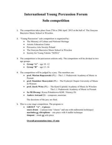 International Young Percussion Forum Solo competition 1. The competition takes place from 27th to 29th April 2015 at the hall of The Grazyna Bacewicz Music School in Wrocław. 2. “Young Percussion” solo competition is organized by: The Ministry of Culture and National Heritage Artistic Education Center Percussive Arts Society Poland The Grazyna Bacewicz Music School in Wroclaw Society for Young Talents “NONA” 3. The competition is for percussion soloists only. The competitors will be divided in two age groups: Group “A” – age 10 -12 Group “B” – age 13 -16 4. The competition will be judged by a jury. The members are: prof. Marian Rapczewski (PL) – The I. J. Pederewski Academy of Music in Poznań prof. Stanisław Skoczyński (PL) – The Fryderyk Chopin University of Music in Warsaw prof. Jacek Wota (PL) – The Karol Lipinski Academy of Music In Wrocław The I. J. Pederewski Academy of Music in Poznań Se-Mi Hwang ( Korea Południowa KOR / Niemcy D) Anders Astrand (S) – composer, musician The decisions of the jury are final. 5. This is a one stage competition. The program is: GROUP “A” – 4 pieces: snare drum – 2 pieces (one “classic” and one with rudimental technique) marimba or vibraphone – one piece with 4 mallet technique timpani – etude or solo piece Overall presentation time: 15 min GROUP “B” – 5 pieces: snare drum – 2 pieces (one “classic” and one with rudimental technique) marimba – one piece with 4 mallet technique vibraphone – one piece with 4 mallet technique timpani – etude or solo piece Overall presentation time: 20 min 6. Registration fee is 150 PLN or 50 EUR for competitors from other countries. It is nonrefundable, except the situation where the competition is cancelled. The fee covers admission to workshops, presentations, instrument shows and concerts. 7. Registration form with photo and payment receipt should be sent by mail to: Szkoła Muzyczna I st. im. Grażyny Bacewicz Pl. Powstańców Śl. 12 53-314 Wrocław POLAND The non-negotiable deadline is March 21th 2015. Registration is also available on-line: [email protected] Bank transfers to: NBPLPLPW (SWIFT) 93 1010 1674 0024 3713 9134 0000 Konkurs perkusyjny 8. The participation confirmation will be sent via e-mail. The competition schedule will be announced on : www.sm1st.wroclaw.pl till Apirl 10th 2015. 9. During the competition every competitor has to begin with presenting 5 legible copies of his/her program. Every competitor has to own the original of the performed piece for the jury to review. Unauthorized copies won’t be honored. 10. All the competitors will be honored with certificate of participation and for the winners there are special prizes from sponsors. 11. All the competitors have to make their accommodation reservations by themselves and bear all the costs regarding traveling, accommodation and alimentation. 12. Submitting for this competition means accepting this rules. Original version of terms and regulations is in polish. More information: The list of instruments available for competitors, rehearsal schedule, information on accommodation options can be found on www.sm1st.wroclaw.pl For any questions please contact the competition coordinator : Andrzej Waloszczyk [email protected]
