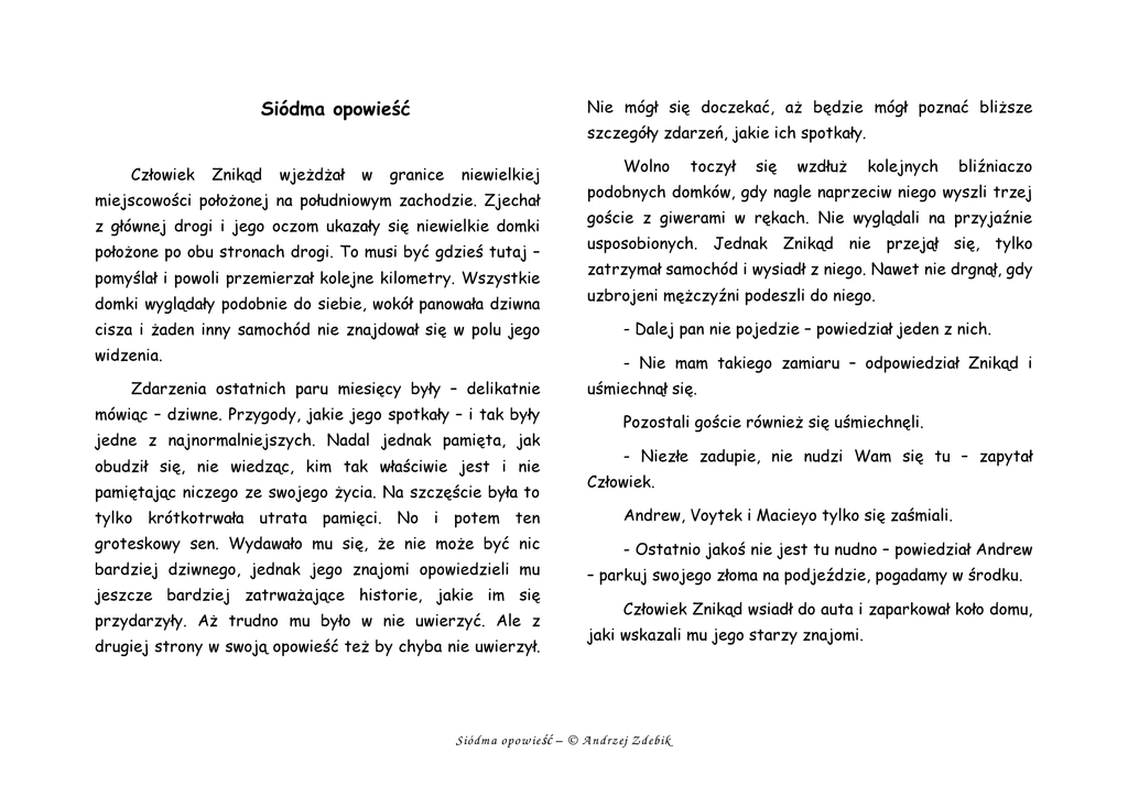 Nie mógł się doczekać, aż będzie mógł poznać bliższe Siódma opowieść szczegóły zdarzeń, jakie ich spotkały. Człowiek Znikąd wjeżdżał w granice niewielkiej miejscowości położonej na południowym zachodzie. Zjechał z głównej drogi i jego oczom ukazały się niewielkie domki położone po obu stronach drogi. To musi być gdzieś tutaj – pomyślał i powoli przemierzał kolejne kilometry. Wszystkie domki wyglądały podobnie do siebie, wokół panowała dziwna Wolno toczył się wzdłuż kolejnych bliźniaczo podobnych domków, gdy nagle naprzeciw niego wyszli trzej goście z giwerami w rękach. Nie wyglądali na przyjaźnie usposobionych. Jednak Znikąd nie przejął się, tylko zatrzymał samochód i wysiadł z niego. Nawet nie drgnął, gdy uzbrojeni mężczyźni podeszli do niego. cisza i żaden inny samochód nie znajdował się w polu jego - Dalej pan nie pojedzie – powiedział jeden z nich. widzenia. - Nie mam takiego zamiaru – odpowiedział Znikąd i Zdarzenia ostatnich paru miesięcy były – delikatnie mówiąc – dziwne. Przygody, jakie jego spotkały – i tak były jedne z najnormalniejszych. Nadal jednak pamięta, jak obudził się, nie wiedząc, kim tak właściwie jest i nie pamiętając niczego ze swojego życia. Na szczęście była to uśmiechnął się. Pozostali goście również się uśmiechnęli. - Niezłe zadupie, nie nudzi Wam się tu – zapytał Człowiek. tylko krótkotrwała utrata pamięci. No i potem ten Andrew, Voytek i Macieyo tylko się zaśmiali. groteskowy sen. Wydawało mu się, że nie może być nic - Ostatnio jakoś nie jest tu nudno – powiedział Andrew bardziej dziwnego, jednak jego znajomi opowiedzieli mu jeszcze bardziej zatrważające historie, jakie im się przydarzyły. Aż trudno mu było w nie uwierzyć. Ale z drugiej strony w swoją opowieść też by chyba nie uwierzył. – parkuj swojego złoma na podjeździe, pogadamy w środku. Człowiek Znikąd wsiadł do auta i zaparkował koło domu, jaki wskazali mu jego starzy znajomi. Siódm a opow ieść – © A ndrzej Z debik - Chodź do domu - zaproponował mu Voytek - tam Ci Dom był otoczony wysokim na ponad 2 metry murem z wysoką bramą i furtką. Woytek zaczął otwierać furtkę, gdy wszystko opowiemy. nagle stojący obok Macieyo w mgnieniu oka podniósł shotguna w kierunku Człowieka i wypalił. Kula świsnęła koło Weszli do środka i Znikąd się uśmiechnął, bo zobaczył tam swoich starych znajomych. jego głowy i utkwiła w paszczy czegoś, co przypominało - Siemanko! - zawołał Ralf - kopę lat! zmutowanego psa. Wszyscy pospiesznie przeszli przez furtkę, rozglądając się dookoła, czy inne stwory nie czekają w pobliżu. Za nim pojawili się Emily i Bobby oraz Eleonora i również się przywitali. Znali się od dawna i Człowiek był bardzo rad widząc ich. - Chodźcie do salonu - zaproponował Andrew - wygląda, Weszli za ogrodzenie i zamknęli drzwi. że mamy sobie wiele do opowiedzenia. - Co to było? - zapytał Człowiek - w życiu nic takiego nie widziałem! Przeszli do dużego salonu, w którym były wysokie okna od podłogi po sufit i rozciągał się widok na park. Liście na - My już widzieliśmy takich kilka - odpowiedział Andrew. drzewach mieniły się różnymi kolorami, jesień była już za pasem i jakby symbolizowała zmierzch czegoś, tylko czego? - I to w różnych odmianach - zażartował Macieyo. - zastanawiał się Znikąd. Wszyscy rozsiedli się na wygodnych kanapach i zaczęli Nikomu nie było jednak do śmiechu, bo wiedzieli, że stwory się gromadzą i jeśli przypuszczą zmasowany atak, po nie będzie tak wesoło. czytelniku, już te historie dobrze znasz - z poprzednich Człowiek rozejrzał się dookoła - dom był otoczony wysokim na 2 metry murem i wydawał się bezpieczną przystanią. kolei opowieści o swoich przygodach. Ty, drogi opowiadań. Ralf opowiedział o swoim demonicznym skrócie, z którego już na pewno nigdy nie skorzysta. Eleonora o sąsiadach z mieszkania piętro wyżej. Bobby i Emily o Siódm a opow ieść – © A ndrzej Z debik górskiej przygodzie. Andrew, Voytek i Macieyo natomiast o Andrew nie poddawał się i węszył dalej. W archiwum miejskim przekopał wszystkie papiery, które mogły mu swoim "zwierzątku". Po wysłuchaniu tych opowieści Człowiek zdał relacje ze swoich przygód w mieście Nowhere. Wszyscy zastanawiali się, co to może oznaczać, że wszystkich spotkały dziwne zdarzenia i teraz każdy z nich znalazł się w tym domu. Historia tego domu również była tajemnicza i dziwna. Obecnie należał on do Andrew, który go odziedziczył po jakimś stryjecznym wujku, o którym nawet w życiu nie słyszał. Więc skąd on go znał? Andrew nie mógł dojść do tego i nikt z żyjących członków jego rodziny nie potrafił mu pomóc w rozwiązaniu tej zagadki. Zgłębił natomiast historię dostarczyć informacji. Niestety nadal miał niepełne dane. Historia przytaczała losy świątyni do pewnego momentu, a potem były już zdarzenia związane z posiadłością. A w środku jakby czarna dziura. Nie zraziło go to jednak i dotarł do pewnego ekscentrycznego staruszka, który zbierał od wielu lat ciekawostki na temat Miasteczka. W jego archiwum dokopał się do brakującego fragmentu historii - którego zapewne wolałby nie znać. Dom, w którym teraz mieszkał, został wzniesiony na zgliszczach świątyni. Okazała się ona miejscem kultu tego domu - i ta go przeraziła. Był on wybudowany przed zaledwie 50laty. Skąd więc tutaj, w centrum miasta, było miejsce na taką rozległą posiadłość ze sporym ogrodem? Andrew powędrował do ratusza i tutaj dokopał się do kronik miasta, w których należącym do sekty, której członkowie powołali do życia umarłych, których w prawie żaden sposób nie można było zabić. Wyjątkiem było pozbawienie ich głowy lub spalenie. Kiedy eksperyment wymknął się spod kontroli widniały informacje na temat tego, co było p