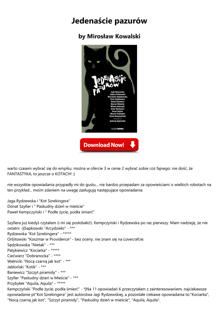 Jedenaście pazurów by Mirosław Kowalski warto czasem wybrać się do empiku. można w ofercie 3 w cenie 2 wybrać sobie coś fajnego: nie dość, że FANTASTYKA, to jeszcze o KOTACH! :) nie wszystkie opowiadania przypadły mi do gustu... nie bardzo przepadam za opowieściami o wielkich robotach na ten przykład... moim zdaniem na uwagę zasługują następujące opowiadania: Jaga Rydzewska i "Kot Szrekingera" Donat Szyller i " Paskudny dzień w mieście" Paweł Kempczyński i " Podłe życie, podła śmierć" Szyllera już kiedyś czytałam (i mi się podobało!). Kempczyński i Rydzewska po raz pierwszy. Mam nadzieję, że nie ostatni -)|Sapkowski "Arcydzieło" - *** Rydzewska "Kot Szrekingera" - ***** Orbitowski "Koszmar w Providence" - bez oceny. nie znam się na Lovecrafcie. Sędzikowska "Nietak" - *** Patykiewicz "Kociarka" - ***** Ciećwierz "Dobranocka" - **** Wełnicki "Nocą czarną jak kot" - *** Jabłoński "Kotik" - *** Baniewicz "Szczyt piramidy" - *** Szyller "Paskudny dzień w Mieście" - *** Przybyłek "Aquila, Aquila" - ***** Kempczyński "Podłe życie, podła śmierć" - *|Na 11 opowiadań 6 przeczytałam z zainteresowaniem, najciekawsze opowiadanie pt"Kot Szrekingera" jest autorstwa Jagi Rydzewskiej, a pozostałe ciekawe opowiadania to:"Kociarka", "Nocą czarną jak kot", "Szczyt piramidy", "Paskudny dzień w mieście", "Aquila, Aquila". opowiadanie pt"Kot Szrekingera" jest autorstwa Jagi Rydzewskiej, a pozostałe ciekawe opowiadania to:"Kociarka", "Nocą czarną jak kot", "Szczyt piramidy", "Paskudny dzień w mieście", "Aquila, Aquila".