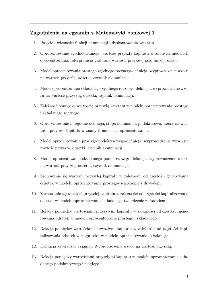 Zagadnienia na egzamin z Matematyki bankowej 1 1. Pojęcie i własności funkcji akumulacji i dyskontowania kapitału. 2. Oprocentowanie zgodne-definicja, wartość przyszła kapitału w znanych modelach oprocentowania, interpretacja graficzna wartości przyszłej jako funkcji czasu. 3. Model oprocentowania prostego zgodnego rocznego-definicja, wyprowadzenie wzoru na wartość przyszłą, odsetki, czynnik akumulacji. 4. Model oprocentowania składanego zgodnego rocznego-definicja, wyprowadzenie wzoru na wartość przyszłą, odsetki, czynnik akumulacji. 5. Zależność pomiędzy wartością przyszłą kapitału w modelu oprocentowania prostego i składanego rocznego. 6. Oprocentowanie niezgodne-definicja, stopa nominalna, podokresowa, wzory na wartości przyszłe kapitału w znanych modelach oprocentowania. 7. Model oprocentowania prostego podokresowego-definicja, wyprowadzenie wzoru na wartość przyszłą, odsetki, czynnik akumulacji. 8. Model oprocentowania składanego podokresowego-definicja, wyprowadzenie wzoru na wartość przyszłą, odsetki, czynnik akumulacji. 9. Zachowanie się wartości przyszłej kapitału w zależności od częstości generowania odsetek w modelu oprocentowania prostego-twierdzenie z dowodem. 10. Zachowanie się wartości przyszłej kapitału w zależności od częstości kapitalizowania odsetek w modelu oprocentowania składanego-twierdzenie z dowodem. 11. Relacja pomiędzy wartościami przyszłymi kapitału w zależności od częstości generowania odsetek w modelu oprocentowania prostego i składanego. 12. Relacja pomiędzy wartościami przyszłymi kapitału w zależności od częstości kapitalizowania odsetek w ciągu roku w modelu oprocentowania składanego. 12. Definicja kapitalizacji ciągłej; Wyprowadzenie wzoru na wartość przyszłą. 13. Relacja pomiędzy wartościami przyszłymi kapitału w modelu oprocentowania składanego podokresowego i ciągłego. 1 14. Relacja pomiędzy wartościami przyszłymi kapitału w poznanych modelach oprocentowania. 15. Relacja pomiędzy czynnikami akumulacji w poznanych modelach oprocentowania 16. Relacja pomiędzy czynnikami akumulacji w modelu oprocentowania składanego w zależności od częstości kapitalizowania odsetek 17. Zasada równoważności warunków oprocentowania i stóp procentowych w modelu oprocentowania prostego. 18. Zasada równoważności warunków oprocentowania i stóp procentowych w modelu oprocentowania składanego podokresowego. 19. Zasada równoważności warunków oprocentowania i stóp procentowych w modelu oprocentowania składanego ciągłego. 20. Efektywna stopa procentowa-definicja i własności. 21. Efektywna stopa procentowa a stopa równoważna. 22. Wartość przyszła kapitału po czasie t w modelu oprocentowania prostego jako skokowa i ciągła funkcja czasu-zależności i różnice. 23. Wartość przyszła kapitału po czasie t w modelu oprocentowania składanego jako skokowa i ciągła funkcja czasu-zależności i różnice. 24. Wartość przyszła kapitału po czasie t w modelu mieszanym. 25. Oprocentowanie proste przy zmiennej stopie procentowej. 26. Oprocentowanie składane podokresowe przy zmiennej stopie procentowej. 27. Oprocentowanie składane ciągłe przy zmiennej stopie procentowej. 28. Postać stopy przeciętnej rocznej w znanych modelach oprocentowania. 29. Dyskonto proste rzeczywiste. 30. Dyskonto proste handlowe. 31. Zasada równoważności stóp dyskontowej i procentowej. 2 32. Rachunek weksli. 33. Rachunek bonów skarbowych. 34. Dyskonto składane rzeczywiste. 35. Dyskonto składane handlowe. 36. Zasada równoważności stóp dyskontowej i procentowej. 37. Stopa dyskontowa a czynnik dyskontowania kapitału. 38. Inflacja, stopa inflacji, przeciętna stopa inflacji. 39. Wartość realna kapitału w czasie. Osetki realne i realna wartość odsetek nominalnych. 40. Aktualizacja wartości kapitału na dowolny moment czasu w znanych modelach oprocentowania. 3