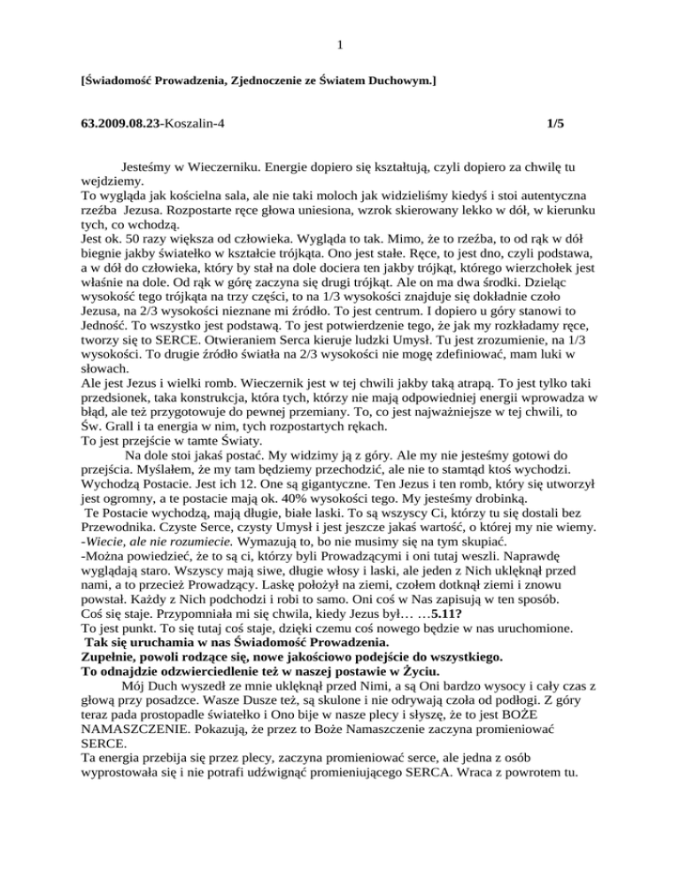 1 [Świadomość Prowadzenia, Zjednoczenie ze Światem Duchowym.] 63.2009.08.23-Koszalin-4 1/5 Jesteśmy w Wieczerniku. Energie dopiero się kształtują, czyli dopiero za chwilę tu wejdziemy. To wygląda jak kościelna sala, ale nie taki moloch jak widzieliśmy kiedyś i stoi autentyczna rzeźba Jezusa. Rozpostarte ręce głowa uniesiona, wzrok skierowany lekko w dół, w kierunku tych, co wchodzą. Jest ok. 50 razy większa od człowieka. Wygląda to tak. Mimo, że to rzeźba, to od rąk w dół biegnie jakby światełko w kształcie trójkąta. Ono jest stałe. Ręce, to jest dno, czyli podstawa, a w dół do człowieka, który by stał na dole dociera ten jakby trójkąt, którego wierzchołek jest właśnie na dole. Od rąk w górę zaczyna się drugi trójkąt. Ale on ma dwa środki. Dzieląc wysokość tego trójkąta na trzy części, to na 1/3 wysokości znajduje się dokładnie czoło Jezusa, na 2/3 wysokości nieznane mi źródło. To jest centrum. I dopiero u góry stanowi to Jedność. To wszystko jest podstawą. To jest potwierdzenie tego, że jak my rozkładamy ręce, tworzy się to SERCE. Otwieraniem Serca kieruje ludzki Umysł. Tu jest zrozumienie, na 1/3 wysokości. To drugie źródło światła na 2/3 wysokości nie mogę zdefiniować, mam luki w słowach. Ale jest Jezus i wielki romb. Wieczernik jest w tej chwili jakby taką atrapą. To jest tylko taki przedsionek, taka konstrukcja, która tych, którzy nie mają odpowiedniej energii wprowadza w błąd, ale też przygotowuje do pewnej przemiany. To, co jest najważniejsze w tej chwili, to Św. Grall i ta energia w nim, tych rozpostartych rękach. To jest przejście w tamte Światy. Na dole stoi jakaś postać. My widzimy ją z góry. Ale my nie jesteśmy gotowi do przejścia. Myślałem, że my tam będziemy przechodzić, ale nie to stamtąd ktoś wychodzi. Wychodzą Postacie. Jest ich 12. One są gigantyczne. Ten Jezus i ten romb, który się utworzył jest ogromny, a te postacie mają ok. 40% wysokości tego. My jesteśmy drobinką. Te Postacie wychodzą, mają długie, białe laski. To są wszyscy Ci, którzy tu się dostali bez Przewodnika. Czyste Serce, czysty Umysł i jest jeszcze jakaś wartość, o której my nie wiemy. -Wiecie, ale nie rozumiecie. Wymazują to, bo nie musimy się na tym skupiać. -Można powiedzieć, że to są ci, którzy byli Prowadzącymi i oni tutaj weszli. Naprawdę wyglądają staro. Wszyscy mają siwe, długie włosy i laski, ale jeden z Nich uklęknął przed nami, a to przecież Prowadzący. Laskę położył na ziemi, czołem dotknął ziemi i znowu powstał. Każdy z Nich podchodzi i robi to samo. Oni coś w Nas zapisują w ten sposób. Coś się staje. Przypomniała mi się chwila, kiedy Jezus był… …5.11? To jest punkt. To się tutaj coś staje, dzięki czemu coś nowego będzie w nas uruchomione. Tak się uruchamia w nas Świadomość Prowadzenia. Zupełnie, powoli rodzące się, nowe jakościowo podejście do wszystkiego. To odnajdzie odzwierciedlenie też w naszej postawie w Życiu. Mój Duch wyszedł ze mnie uklęknął przed Nimi, a są Oni bardzo wysocy i cały czas z głową przy posadzce. Wasze Dusze też, są skulone i nie odrywają czoła od podłogi. Z góry teraz pada prostopadle światełko i Ono bije w nasze plecy i słyszę, że to jest BOŻE NAMASZCZENIE. Pokazują, że przez to Boże Namaszczenie zaczyna promieniować SERCE. Ta energia przebija się przez plecy, zaczyna promieniować serce, ale jedna z osób wyprostowała się i nie potrafi udźwignąć promieniującego SERCA. Wraca z powrotem tu. 2 Nie była w stanie, nie była gotowa, za dużo nieprzerobionych rzeczy. Po prostu nie osiągnęła tego poziomu, więc sama wibracja z powrotem ją tu przyniosła. Dziewięć osób z nas po kolei już wstaje, a dziesiąta jakby dołączała, nie dołączała. Te osoby stoją teraz już wyprostowane, a ich cienie skulone na podłodze znikają. Te osoby rosną. Stają się takie same wielkie. Ustawiamy się w rządek. Powstaje jakby jedna wielka energia. Tamte postacie i my stajemy się jakby pionową, kreskowaną jedną energią, taką chmurką, torcikiem. I te kreski my i wszystko stało się szatą JEZUSA, sięgająca wysokości trzeciej czakry. Nasza głowa jest na wysokości Jego 3-ciej czakry. I On ma ręce rozciągnięte. Jesteśmy Jego działaniem. Trzy osoby stały się jakby takimi małymi Jezusami, czwarta się zatrzymała, piąta się cofa. Te trzy osoby wychodzą też z rozpostartymi rękami. Są wielkości ¼, może 1/3 Jezusa, wychodzą mają taką postać jak On i stają z boku. Reszta była niegotowa -I nie musiała. Nie wszystkie cele są takie same. –Usłyszałem. Mówią mi teraz o celach jednostkowych, o przeznaczeniu itp. Teraz te trzy osoby siedzą jakby przy małym ognisku, gotują coś w garnku. Tak jakby nie wiedząc o tym, błyskawicznie przeżywały czas. Jakby upływały godziny, dni. To coś już jest ugotowane i podając sobie to karmią się drewnianą łyżką. Osoba po prawej stronie podaje tej po lewej. Ona skosztowała, uniosła się i stała się taką chmurką, energią. Druga na palec wzięła, polizała, stało się to samo, a trzecia to wszystko sobie wylała na głowę. Tak samo stała się energią. Wszystkie się roztopiły i stały się energią. To jest Zjednoczenie ze Światem Duchowym. Całkowite. Nieodwracalne. O Ojcu tu nie mówimy. Pokazują Ostatnią Wieczerzę, Jezus tu siedzi na środku, te trzy postacie są przy stole. Zasłonili kurtynę. Pojawiła się Matka Boska i wszystkich ciągnie za sobą. Prowadzi nas do Drugich Drzwi, to jest Wieża. Ona wygląda jak szachowa. To dziwnie wygląda jakby taka dźwignia tu była, taka pochodnia. Matka Boska to nacisnęła w dół. To wszystko zaczyna się zmieniać, tak jakby ta wieża była tylko symbolem, zapisem energetycznym. To zaczyna znikać, a z mgły wyłania się Bóg Stwórca. Daje mi do zrozumienia telepatycznie, że On nie mówi, a ja myślałem, że coś 