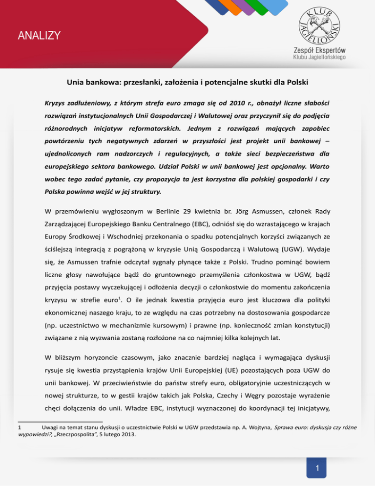 ANALIZY Unia bankowa: przesłanki, założenia i potencjalne skutki dla Polski Kryzys zadłużeniowy, z którym strefa euro zmaga się od 2010 r., obnażył liczne słabości rozwiązań instytucjonalnych Unii Gospodarczej i Walutowej oraz przyczynił się do podjęcia różnorodnych inicjatyw reformatorskich. Jednym z rozwiązań mających zapobiec powtórzeniu tych negatywnych zdarzeń w przyszłości jest projekt unii bankowej – ujednoliconych ram nadzorczych i regulacyjnych, a także sieci bezpieczeństwa dla europejskiego sektora bankowego. Udział Polski w unii bankowej jest opcjonalny. Warto wobec tego zadać pytanie, czy propozycja ta jest korzystna dla polskiej gospodarki i czy Polska powinna wejść w jej struktury. W przemówieniu wygłoszonym w Berlinie 29 kwietnia br. Jörg Asmussen, członek Rady Zarządzającej Europejskiego Banku Centralnego (EBC), odniósł się do wzrastającego w krajach Europy Środkowej i Wschodniej przekonania o spadku potencjalnych korzyści związanych ze ściślejszą integracją z pogrążoną w kryzysie Unią Gospodarczą i Walutową (UGW). Wydaje się, że Asmussen trafnie odczytał sygnały płynące także z Polski. Trudno pominąć bowiem liczne głosy nawołujące bądź do gruntownego przemyślenia członkostwa w UGW, bądź przyjęcia postawy wyczekującej i odłożenia decyzji o członkostwie do momentu zakończenia kryzysu w strefie euro1. O ile jednak kwestia przyjęcia euro jest kluczowa dla polityki ekonomicznej naszego kraju, to ze względu na czas potrzebny na dostosowania gospodarcze (np. uczestnictwo w mechanizmie kursowym) i prawne (np. konieczność zmian konstytucji) związane z nią wyzwania zostaną rozłożone na co najmniej kilka kolejnych lat. W bliższym horyzoncie czasowym, jako znacznie bardziej nagląca i wymagająca dyskusji rysuje się kwestia przystąpienia krajów Unii Europejskiej (UE) pozostających poza UGW do unii bankowej. W przeciwieństwie do państw strefy euro, obligatoryjnie uczestniczących w nowej strukturze, to w gestii krajów takich jak Polska, Czechy i Węgry pozostaje wyrażenie chęci dołączenia do unii. Władze EBC, instytucji wyznaczonej do koordynacji tej inicjatywy, 1 Uwagi na temat stanu dyskusji o uczestnictwie Polski w UGW przedstawia np. A. Wojtyna, Sprawa euro: dyskusja czy różne wypowiedzi?, „Rzeczpospolita”, 5 lutego 2013. 1 ANALIZY oczekują od władz poszczególnych krajów decyzji o uczestnictwie w unii bankowej do lipca 2013 r. Z tej perspektywy warto przyjrzeć się bliżej celom, projektowanej strukturze i działaniu unii bankowej, a także podsumować związane z nią zagrożenia i korzyści oraz podjąć próbę ustalenia ich względnego znaczenia dla Polski. Idea unii bankowej Bezpośrednią przyczyną leżącą u podstaw debaty na temat unii bankowej stały się luki w „architekturze” europejskich rynków finansowych ujawnione przez trwający od maja 2010 r. kryzys strefy euro. Wydarzenia te mają z kolei swoje źródła w odnotowywanym od momentu utworzenia UGW zjawisku przepływu znacznych strumieni kapitału wewnątrz unii (np. z Niemiec do Grecji), które spowodowały narastanie nierównowagi, zarówno w sektorze publicznym, jak i prywatnym. Kiedy kierunek tych przepływów uległ odwróceniu po wydarzeniach na amerykańskich rynkach finansowych, a banki dużych krajów strefy euro zaczęły „oczyszczać” swoje bilanse z bardziej ryzykownych aktywów, koszt zaciągania kolejnych pożyczek przez sektor prywatny i publiczny wielu krajów gwałtownie wzrósł. W przypadku drugiego z sektorów trend ten przełożył się niemal natychmiastowo na wzrost oprocentowania obligacji, a tym samym spadek możliwości finansowania narastających deficytów budżetowych. Kryzys unaocznił konieczność rewizji dotychczasowego sposobu myślenia o nadzorze bankowym z perspektywy oddolnej (bottom-up), a więc analizy ryzyka systemu finansowego z pozycji poszczególnych instytucji wchodzących w jego skład. Od kilku lat ekonomiści postulują uzupełnienie tradycyjnego nadzoru o tzw. podejście makroostrożnościowe (macroprudential), oparte na całościowej analizie ryzyka systemowego. Centralną rolę w tym podejściu odgrywa więc nie tylko problem instytucji finansowych „zbyt dużych, by upaść” (too big to fail), ale także „włączonych w zbyt gęstą sieć połączeń, by upaść” ( too interconnected to fail). W przypadku UE połączenia te mają dodatkowo charakter transgraniczny, co utrudnia ich właściwą diagnozę i odpowiedź władz krajowych na wydarzenia na rynkach finansowych. Jak wynika z danych Banku Rozliczeń Międzynarodowych, który na bieżąco monitoruje zagraniczne zaangażowanie banków 2 ANALIZY komercyjnych, już w 2008 r. wartość aktywów ulokowanych w bankach irlandzkich, do jakich rościły sobie prawa banki niemieckie, wynosiła 83% irlandzkiego PKB. W tym samym okresie banki francuskie mogły wymagać od banków greckich aktywów o łącznej wartości 22% ówczesnego greckiego PKB. Ma to szczególne znaczenie dla polityki pieniężnej EBC, gdyż stabilność finansowa jest jednym z gwarantów skuteczności działania mechanizmu transmisji bodźców monetarnych poprzez system bankowy i tzw. kanał kredytowy do sfery realnej gospodarek krajów UGW. Czytałem 3 razy ale nic z tego. Da radę jaśniej? Ze względu na tak zarysowane cele unia bankowa może być w końcu postrzegana jako element szerszej idei – zintegrowanych ram finansowych, będących z założenia kolejnym krokiem na drodze integracji gospodarczej. Jej konstrukcja obejmuje kilka kluczowych elementów z dziedziny regulacji i nadzoru finansowego. Mechanizm działania unii bankowej Plan wprowadzenia w życie unii bankowej został przedstawiony przez Komisję Europejską we wrześniu 2012 r. i zakładał harmonizację regulacji oraz standardów ustalanych dla krajowych instytucji finansowych przez poszczególne instytucje nadzorcze. Konkretne ustalenia dotyczące s