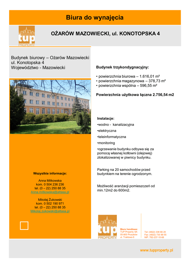 Biura do wynajęcia OŻARÓW MAZOWIECKI, ul. KONOTOPSKA 4 Budynek biurowy – Ożarów Mazowiecki ul. Konotopska 4 Województwo - Mazowiecki Budynek trzykondygnacyjny: • powierzchnia biurowa – 1.616,01 m² • powierzchnia magazynowa – 378,73 m² • powierzchnia wspólna – 596,55 m² Powierzchnia użytkowa łączna 2.756,54 m2 Instalacje: •wodno - kanalizacyjna •elektryczna •teleinformatyczna •monitoring •ogrzewanie budynku odbywa się za pomocą własnej kotłowni (olejowej) zlokalizowanej w piwnicy budynku. Wszystkie informacje: Anna Mitkowska kom. 0 504 236 236 tel. (0 – 22) 250 88 35 [email protected] Parking na 20 samochodów przed budynkiem na terenie ogrodzonym. Możliwość aranżacji pomieszczeń od min.12m2 do 600m2. Mikołaj Żukowski kom. 0 502 190 971 tel. (0 – 22) 250 88 35 [email protected] Biuro handlowe: TUP Property SA 05-800 Pruszków ul. Traktowa 6 Tel: (4822) 338 66 20 Fax: (4822) 730 89 55 NIP: 782-237-10-68 www.tupproperty.pl