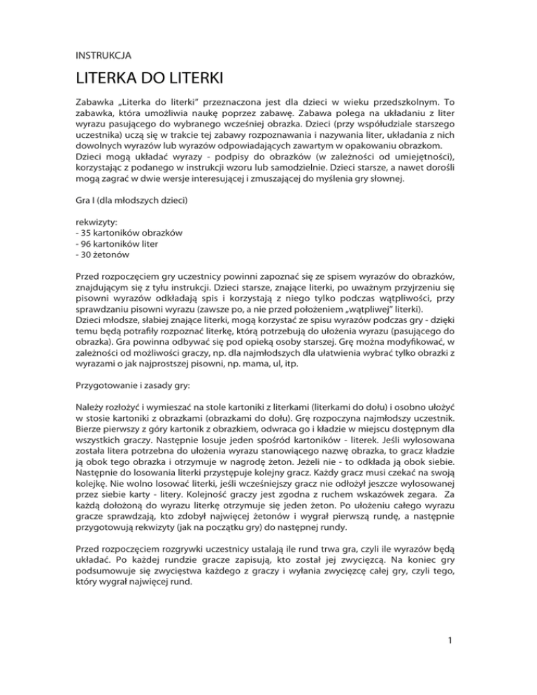 INSTRUKCJA LITERKA DO LITERKI Zabawka „Literka do literki” przeznaczona jest dla dzieci w wieku przedszkolnym. To zabawka, która umożliwia naukę poprzez zabawę. Zabawa polega na układaniu z liter wyrazu pasującego do wybranego wcześniej obrazka. Dzieci (przy współudziale starszego uczestnika) uczą się w trakcie tej zabawy rozpoznawania i nazywania liter, układania z nich dowolnych wyrazów lub wyrazów odpowiadających zawartym w opakowaniu obrazkom. Dzieci mogą układać wyrazy - podpisy do obrazków (w zależności od umiejętności), korzystając z podanego w instrukcji wzoru lub samodzielnie. Dzieci starsze, a nawet dorośli mogą zagrać w dwie wersje interesującej i zmuszającej do myślenia gry słownej. Gra I (dla młodszych dzieci) rekwizyty: - 35 kartoników obrazków - 96 kartoników liter - 30 żetonów Przed rozpoczęciem gry uczestnicy powinni zapoznać się ze spisem wyrazów do obrazków, znajdującym się z tyłu instrukcji. Dzieci starsze, znające literki, po uważnym przyjrzeniu się pisowni wyrazów odkładają spis i korzystają z niego tylko podczas wątpliwości, przy sprawdzaniu pisowni wyrazu (zawsze po, a nie przed położeniem „wątpliwej” literki). Dzieci młodsze, słabiej znające literki, mogą korzystać ze spisu wyrazów podczas gry - dzięki temu będą potrafiły rozpoznać literkę, którą potrzebują do ułożenia wyrazu (pasującego do obrazka). Gra powinna odbywać się pod opieką osoby starszej. Grę można modyfikować, w zależności od możliwości graczy, np. dla najmłodszych dla ułatwienia wybrać tylko obrazki z wyrazami o jak najprostszej pisowni, np. mama, ul, itp. Przygotowanie i zasady gry: Należy rozłożyć i wymieszać na stole kartoniki z literkami (literkami do dołu) i osobno ułożyć w stosie kartoniki z obrazkami (obrazkami do dołu). Grę rozpoczyna najmłodszy uczestnik. Bierze pierwszy z góry kartonik z obrazkiem, odwraca go i kładzie w miejscu dostępnym dla wszystkich graczy. Następnie losuje jeden spośród kartoników - literek. Jeśli wylosowana została litera potrzebna do ułożenia wyrazu stanowiącego nazwę obrazka, to gracz kładzie ją obok tego obrazka i otrzymuje w nagrodę żeton. Jeżeli nie - to odkłada ją obok siebie. Następnie do losowania literki przystępuje kolejny gracz. Każdy gracz musi czekać na swoją kolejkę. Nie wolno losować literki, jeśli wcześniejszy gracz nie odłożył jeszcze wylosowanej przez siebie karty - litery. Kolejność graczy jest zgodna z ruchem wskazówek zegara. Za każdą dołożoną do wyrazu literkę otrzymuje się jeden żeton. Po ułożeniu całego wyrazu gracze sprawdzają, kto zdobył najwięcej żetonów i wygrał pierwszą rundę, a następnie przygotowują rekwizyty (jak na początku gry) do następnej rundy. Przed rozpoczęciem rozgrywki uczestnicy ustalają ile rund trwa gra, czyli ile wyrazów będą układać. Po każdej rundzie gracze zapisują, kto został jej zwycięzcą. Na koniec gry podsumowuje się zwycięstwa każdego z graczy i wyłania zwycięzcę całej gry, czyli tego, który wygrał najwięcej rund. 1