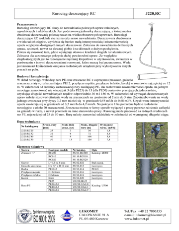 Rurociąg deszczujący RC J220,RC Przeznaczenie Rurociąg deszczujący RC służy do nawadniania polowych upraw rolniczych, ogrodniczych i szkółkarskich. Jest podstawową jednostką deszczującą, z której można zbudować deszczownię polową nawet na wielkoobszarowych uprawach. Rurociągi deszczujące RC rozkłada się raz na cały sezon nawadniania. Deszczownia zbudowana z wielu takich ciągów, wyróżnia się bardzo małą intensywnością i równomiernością opadu względem dostępnych innych deszczowni. Zalecana do nawadniania delikatnych upraw, wsiewek, nawet na zlewnej glebie i na skłonach o dużym pochyleniu. Poleca się stosować tam, gdzie występuje obawa o kradzież drogich rur aluminiowych. Zalecana dla sezonowego pokrycia dużej powierzchni upraw. Ze względów eksploatacyjnych jest to rozwiązanie najmniej kłopotliwe w użytkowaniu, zwłaszcza w porównaniu z innymi deszczowniami rurowymi, które muszą być przenoszone. Wadą jest natomiast konieczność omijania rozłożonych urządzeń przy wykonywaniu innych pracach na polu. Budowa i kompletacja W skład rurociągu wchodzą: rura PE oraz zraszacze RC z osprzętem (zraszacz, gniazdo zraszacza, statyw, rurka zasilająca PE12, przyłącze męskie, przyłącze żeńskie, korek) w rozstawie najczęściej co 12 m. W zależności od średnicy zastosowanej rury zasilającej PE, dla zachowania równomierności opadu, na jednym rurociągu zamontować nie więcej jak 3 (dla PE25) do 13 (dla PE50) zestawów pracujących jednocześnie, uzyskując długości nawadnianych rzędów odpowiednio 36 m i 156 m. W zależności od wymagań deszczowanych upraw należy stosować ciśnienia wody na zraszaczach na poziomie od 2 atm do 3 atm. Zapotrzebowanie na wodę jednego zraszacza przy dyszy 3,2 mm mieści się w granicach 0,55 m3/h do 0,68 m3/h. Uzyskiwane intensywności opadu zawierają się w granicach od 3,5 mm/h do 4,2 mm/h. Na pokrycie 1 ha potrzebne będzie rozłożenie rurociągów z około 70 zraszaczami. Zraszacza można w łatwy sposób wyłączyć z pracy poprzez założenie zaślepki na gniazdo w rurze, a nawet przenieść na inne stanowisko pracy. Rurociąg może pracować na różnych średnicach rur PE, najczęściej od 25 do 50 mm. Rurę należy zamawiać oddzielnie w zależności od wymaganej długości ciągu. Dane techniczne Nr katalogowy J220.RC25 J220.RC32 J220.RC40 J220.RC50 Średn. rury [mm] 25 32 40 50 Maks ilość zrasz. [szt] 3 6 9 13 Maks. długość Wydajność rury [m] ruroc. [m3/h] 36 1,8 72 3,6 108 5,4 156 7,8 Elementy składowe Nazwa Zraszacz ½” Statyw Gniazdo zraszacza Rurka Przyłącze męskie Przyłącze żeńskie Korek Rura PE Dostępne modele RC200 RC010 RC020 L=1,2 m, 8 mm Gw ½” x D 12 mm PE12x2 D12x8mm D2x8mm 8mm PE25 PE32x2,0 PE40x2,3 PE50x2,9 Nr katalog. M211.RC200 M110.RC010 M110.RC020 M212,022 M212,012 M212,014 M212,016 M212,018 M212,020 UF220,IR,25 UF210.32x2,0 UF210.40x2,3 UF210,50x2,9 Opis Katalog: M000 Stal ocynk. tworzywo PELD tworzywo tworzywo tworzywo Katalog: UF00 ŁUKOMET CAŁOWANIE 91 A PL 05-480 Karczew Tel./Fax +48 22 7806355 e-mail: [email protected] www.lukomet.pl