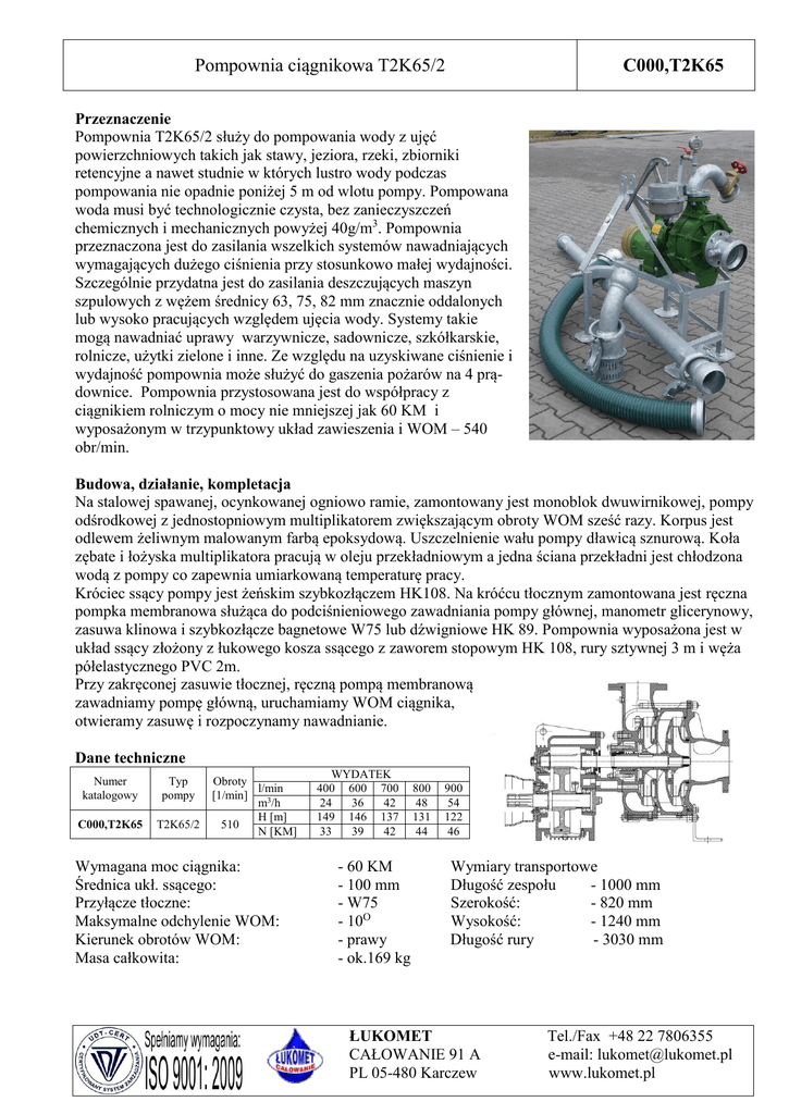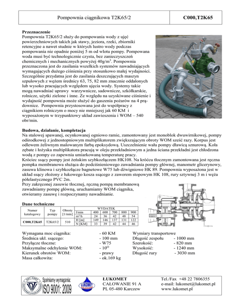 Pompownia ciągnikowa T2K65/2 C000,T2K65 Przeznaczenie Pompownia T2K65/2 służy do pompowania wody z ujęć powierzchniowych takich jak stawy, jeziora, rzeki, zbiorniki retencyjne a nawet studnie w których lustro wody podczas pompowania nie opadnie poniżej 5 m od wlotu pompy. Pompowana woda musi być technologicznie czysta, bez zanieczyszczeń chemicznych i mechanicznych powyżej 40g/m3. Pompownia przeznaczona jest do zasilania wszelkich systemów nawadniających wymagających dużego ciśnienia przy stosunkowo małej wydajności. Szczególnie przydatna jest do zasilania deszczujących maszyn szpulowych z wężem średnicy 63, 75, 82 mm znacznie oddalonych lub wysoko pracujących względem ujęcia wody. Systemy takie mogą nawadniać uprawy warzywnicze, sadownicze, szkółkarskie, rolnicze, użytki zielone i inne. Ze względu na uzyskiwane ciśnienie i wydajność pompownia może służyć do gaszenia pożarów na 4 prądownice. Pompownia przystosowana jest do współpracy z ciągnikiem rolniczym o mocy nie mniejszej jak 60 KM i wyposażonym w trzypunktowy układ zawieszenia i WOM – 540 obr/min. Budowa, działanie, kompletacja Na stalowej spawanej, ocynkowanej ogniowo ramie, zamontowany jest monoblok dwuwirnikowej, pompy odśrodkowej z jednostopniowym multiplikatorem zwiększającym obroty WOM sześć razy. Korpus jest odlewem żeliwnym malowanym farbą epoksydową. Uszczelnienie wału pompy dławicą sznurową. Koła zębate i łożyska multiplikatora pracują w oleju przekładniowym a jedna ściana przekładni jest chłodzona wodą z pompy co zapewnia umiarkowaną temperaturę pracy. Króciec ssący pompy jest żeńskim szybkozłączem HK108. Na króćcu tłocznym zamontowana jest ręczna pompka membranowa służąca do podciśnieniowego zawadniania pompy głównej, manometr glicerynowy, zasuwa klinowa i szybkozłącze bagnetowe W75 lub dźwigniowe HK 89. Pompownia wyposażona jest w układ ssący złożony z łukowego kosza ssącego z zaworem stopowym HK 108, rury sztywnej 3 m i węża półelastycznego PVC 2m. Przy zakręconej zasuwie tłocznej, ręczną pompą membranową zawadniamy pompę główną, uruchamiamy WOM ciągnika, otwieramy zasuwę i rozpoczynamy nawadnianie. Dane techniczne Numer katalogowy Typ pompy C000,T2K65 T2K65/2 Obroty l/min [1/min] m3/h H [m] 510 N [KM] Wymagana moc ciągnika: Średnica ukł. ssącego: Przyłącze tłoczne: Maksymalne odchylenie WOM: Kierunek obrotów WOM: Masa całkowita: WYDATEK 400 600 700 24 36 42 149 146 137 33 39 42 - 60 KM - 100 mm - W75 - 10O - prawy - ok.169 kg 800 48 131 44 900 54 122 46 Wymiary transportowe Długość zespołu - 1000 mm Szerokość: - 820 mm Wysokość: - 1240 mm Długość rury - 3030 mm ŁUKOMET CAŁOWANIE 91 A PL 05-480 Karczew Tel./Fax +48 22 7806355 e-mail: [email protected] www.lukomet.pl