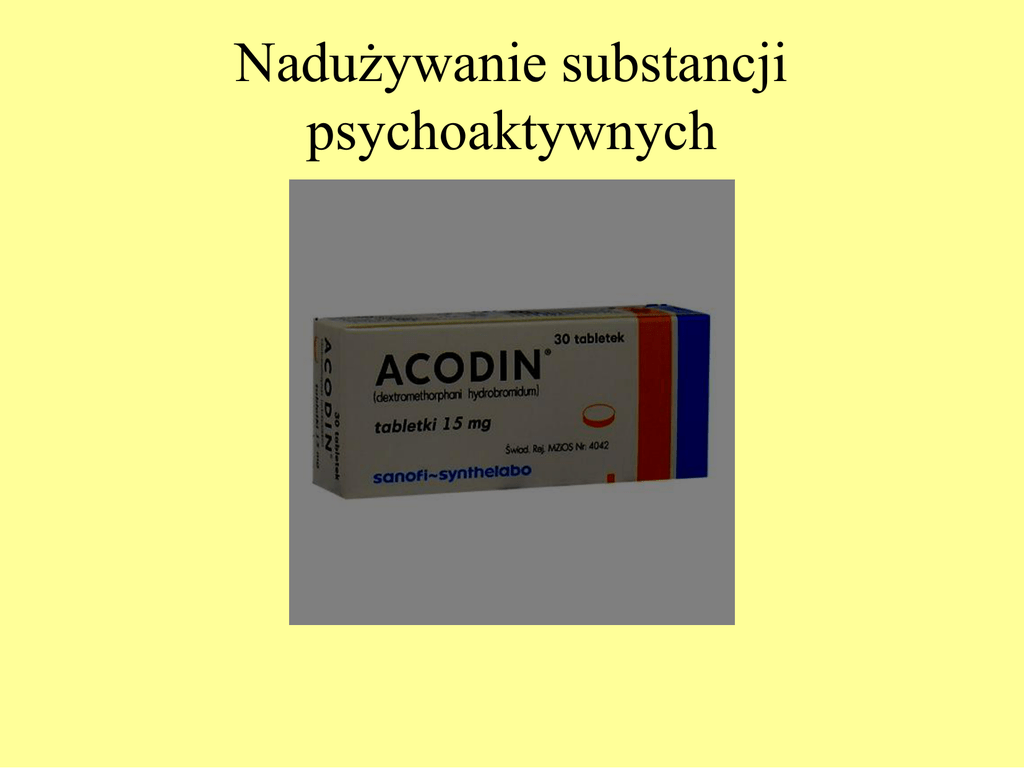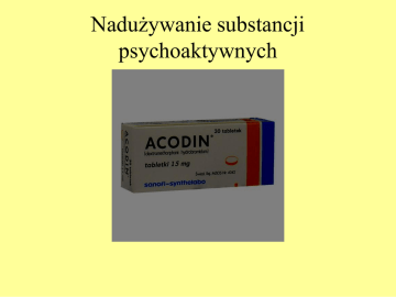 Nadużywanie substancji psychoaktywnych Acodin - co się dzieje po zażyciu dużych dawek: Lek może wywoływać stany euforyczne, uczucie błogostanu, niecodzienne doznania zmysłowe i halucynacje. Często powoduje także pobudzenie ruchowe i gadatliwość. Dekstrometorfan zawarty w Acodinie nie działa zawsze tak samo. Może spowodować niepokój, silne stany lękowe i ataki paniki oraz zaburzenia równowagi i niezborność ruchową. Nierzadkie są przypadki tzw. bad trip - kiedy zamiast przyjemnych doznań amator wrażeń doświadcza silnego lęku, ma urojenia zagrożenia życia, uczucie wyobcowania, oderwania od własnego ciała i utraty tożsamości. Dekstrometorfan powoduje także uwalnianie histaminy w organizmie, więc po zażyciu można cierpieć z powodu silnego swędzenia skóry. Nadużywanie substancji psychoaktywnych-c.d. : Ostre zatrucie ( przemijający stan po użyciu środka psychoaktywnego) Ostre zatrucie kanabinolami- prowadzi do zaburzeń percepcji czasu i przestrzeni, do odczuwania lekkości ciała, nastroju beztroskiego lub euforycznego. Doznania zmysłowe, szczególnie wzrokowe i słuchowe są wyostrzone. Często występuje zawyżona samoocena, poczucie głębszego, pełniejszego zrozumienia rzeczywistości, wielomówność, napady śmiechu. Część osób reaguje na kanabinole sennością. Czasem może prowadzić do rozwoju psychozy z omamami wzrokowymi i słuchowymi, urojeniami prześladowczymi. Nadużywanie substancji psychoaktywnych-c.d. : Ostre zatrucie-c.d. : Ostre zatrucie substancjami stymulującymi (amfetamina): Występuje wzmożone samopoczucie, podniecenie psychoruchowe, niepokój, zaburzenia snu, czasami lęk. Można zaobserwować rozszerzone źrenice, drżenia mięśniowe, podwyższoną temperaturę. Mogą pojawiać się zaburzenia psychotyczne, napady paniki, zachowania agresywne, znaczny niepokój psychoruchowy. Nadużywanie substancji psychoaktywnych-c.d. : Szkodliwe używanie substancji powoduje szkody zdrowotne): (używanie substancji Szkodliwe używanie kanabinoli: ● Zespoły lękowe ( głównie lęk napadowy) Zespół amotywacyjny ( zmniejszenie aspiracji i dynamizmu życiowego, zawężenie kręgu znajomych i kręgu zainteresowań) ● Szkodliwe używanie substancji stymulujących (amfetamina) Nadużywanie substancji psychoaktywnych-c.d. : Zespół uzależnienia ( silna potrzeba, „głód” narkotyku + występowanie tolerancji + zaniedbywanie zainteresowań, innych źródeł przyjemności z powodu przyjmowania substancji + zsp. Abstynencyjny + przyjmowanie substancji pomimo szkodliwych skutków) Kanabinole- objawy uzależnienia somatycznego są słabo nasilone, brak zjawiska tolerancji ● zsp. Amotywacyjny Amfetamina -W okresie używania może powodować zaburzenia nastroju, stany lękowe, urojenia prześladowcze i Nadużywanie substancji psychoaktywnych-c.d. : Zespół abstynencyjny: Kanabinole (występuje tylko u przyjmujących długo duże dawki ) psychiczny głód kanabinoli, zaburzenia snu, drażliwość, lęk, zmniejszenie apetytu, wzmożona potliwość, czasami podwyższenie temperatury i dreszcze, trwa zwykle kilka dni. Amfetamina- przez pierwsze 2-3 dni obserwuje się wzmożoną senność, obniżony nastrój, zmęczenie, potem te objawy mijają, a zwiększa się łaknienie. Dziękuję za uwagę!