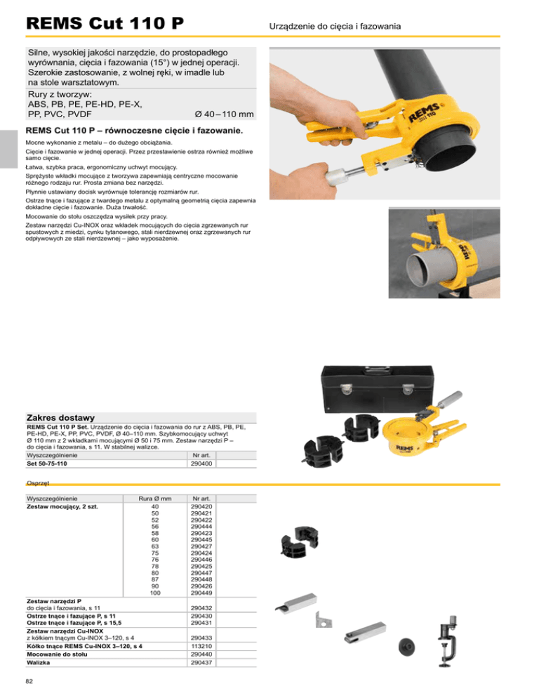 REMS Cut 110 P Urządzenie do cięcia i fazowania Silne, wysokiej jakości narzędzie, do prostopadłego wyrównania, cięcia i fazowania (15°) w jednej operacji. Szerokie zastosowanie, z wolnej ręki, w imadle lub na stole warsztatowym. Rury z tworzyw: ABS, PB, PE, PE-HD, PE-X, PP, PVC, PVDF Ø 40 – 110 mm REMS Cut 110 P – równoczesne cięcie i fazowanie. Mocne wykonanie z metalu – do dużego obciążania. Cięcie i fazowanie w jednej operacji. Przez przestawienie ostrza również możliwe samo cięcie. Łatwa, szybka praca, ergonomiczny uchwyt mocujący. Sprężyste wkładki mocujące z tworzywa zapewniają centryczne mocowanie różnego rodzaju rur. Prosta zmiana bez narzędzi. Płynnie ustawiany docisk wyrównuje tolerancję rozmiarów rur. Ostrze tnące i fazujące z twardego metalu z optymalną geometrią cięcia zapewnia dokładne cięcie i fazowanie. Duża trwałość. Mocowanie do stołu oszczędza wysiłek przy pracy. Zestaw narzędzi Cu-INOX oraz wkładek mocujących do cięcia zgrzewanych rur spustowych z miedzi, cynku tytanowego, stali nierdzewnej oraz zgrzewanych rur odpływowych ze stali nierdzewnej – jako wyposażenie. Zakres dostawy REMS Cut 110 P Set. Urządzenie do cięcia i fazowania do rur z ABS, PB, PE, PE-HD, PE-X, PP, PVC, PVDF, Ø 40–110 mm. Szybkomocujący uchwyt Ø 110 mm z 2 wkładkami mocującymi Ø 50 i 75 mm. Zestaw narzędzi P – do cięcia i fazowania, s 11. W stabilnej walizce. Wyszczególnienie Nr art. Set 50-75-110 290400 R Osprzęt Wyszczególnienie Zestaw mocujący, 2 szt. Rura Ø mm 40 50 52 56 58 60 63 75 76 78 80 87 90 100 Zestaw narzędzi P do cięcia i fazowania, s 11 Ostrze tnące i fazujące P, s 11 Ostrze tnące i fazujące P, s 15,5 Zestaw narzędzi Cu-INOX z kółkiem tnącym Cu-INOX 3–120, s 4 Kółko tnące REMS Cu-INOX 3–120, s 4 Mocowanie do stołu Walizka 82 Nr art. 290420 290421 290422 290444 290423 290445 290427 290424 290446 290425 290447 290448 290426 290449 290432 290430 290431 R 290433 113210 290440 290437 R R R