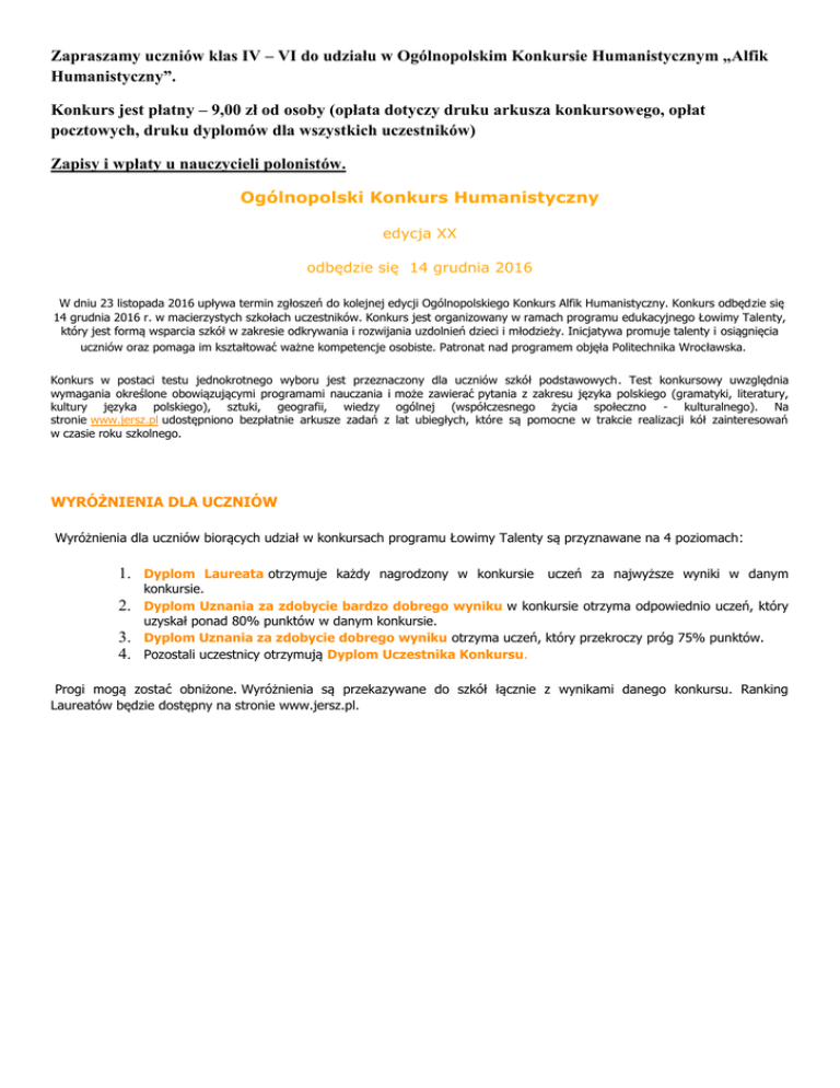 Zapraszamy uczniów klas IV – VI do udziału w Ogólnopolskim Konkursie Humanistycznym „Alfik Humanistyczny”. Konkurs jest płatny – 9,00 zł od osoby (opłata dotyczy druku arkusza konkursowego, opłat pocztowych, druku dyplomów dla wszystkich uczestników) Zapisy i wpłaty u nauczycieli polonistów. Ogólnopolski Konkurs Humanistyczny edycja XX odbędzie się 14 grudnia 2016 W dniu 23 listopada 2016 upływa termin zgłoszeń do kolejnej edycji Ogólnopolskiego Konkurs Alfik Humanistyczny. Konkurs odbędzie się 14 grudnia 2016 r. w macierzystych szkołach uczestników. Konkurs jest organizowany w ramach programu edukacyjnego Łowimy Talenty, który jest formą wsparcia szkół w zakresie odkrywania i rozwijania uzdolnień dzieci i młodzieży. Inicjatywa promuje talenty i osiągnięcia uczniów oraz pomaga im kształtować ważne kompetencje osobiste. Patronat nad programem objęła Politechnika Wrocławska. Konkurs w postaci testu jednokrotnego wyboru jest przeznaczony dla uczniów szkół podstawowych. Test konkursowy uwzględnia wymagania określone obowiązującymi programami nauczania i może zawierać pytania z zakresu języka polskiego (gramatyki, literatury, kultury języka polskiego), sztuki, geografii, wiedzy ogólnej (współczesnego życia społeczno - kulturalnego). Na stronie www.jersz.pl udostępniono bezpłatnie arkusze zadań z lat ubiegłych, które są pomocne w trakcie realizacji kół zainteresowań w czasie roku szkolnego. WYRÓŻNIENIA DLA UCZNIÓW Wyróżnienia dla uczniów biorących udział w konkursach programu Łowimy Talenty są przyznawane na 4 poziomach : 1. 2. 3. 4. Dyplom Laureata otrzymuje każdy nagrodzony w konkursie uczeń za najwyższe wyniki w danym konkursie. Dyplom Uznania za zdobycie bardzo dobrego wyniku w konkursie otrzyma odpowiednio uczeń, który uzyskał ponad 80% punktów w danym konkursie. Dyplom Uznania za zdobycie dobrego wyniku otrzyma uczeń, który przekroczy próg 75% punktów. Pozostali uczestnicy otrzymują Dyplom Uczestnika Konkursu. Progi mogą zostać obniżone. Wyróżnienia są przekazywane do szkół łącznie z wynikami danego konkursu. Ranking Laureatów będzie dostępny na stronie www.jersz.pl.