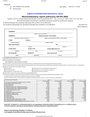 COMARCH w tys. zł SA-PS 2003 POCZTA Od : EM COMARCH Piotr Grzesiak Data odbioru : 2003-10-31 17:16:08 Do : EM Kancelaria KOMISJA PAPIERÓW WARTOŚCIOWYCH I GIEŁD Skonsolidowany raport półroczny SA-PS 2003 (zgodnie z § 57 ust. 2 Rozporządzenia Rady Ministrów z dnia 16 października 2001 r. - Dz. U. Nr 139, poz. 1569 i z 2002 r. Nr 31, poz. 280) (dla emitentów papierów wartościowych o działalności wytwórczej, budowlanej, handlowej lub usługowej) Za półrocze bieżącego roku obrotowego obejmujące okres od 2003-01-01 do 2003-06-30 oraz za półrocze poprzedniego roku obrotowego obejmujące okres od 2002-01-01 do 2002-06-30 dnia 2003-10-31 (data przekazania) COMARCH (pełna nazwa emitenta) COMARCH Telekomunikacja i Informatyka (skrócona nazwa emitenta) 31-864 (sektor wg klasyfikacji GPW w Warszawie) Kraków (kod pocztowy) (miejscowość) Aleja Jana Pawła II 39 a (ulica) 12 646 10 00 (numer) 12 646 11 00 (telefon) 677-00-65-406 [email protected] (fax) (e-mail) 350527377 (NIP) www.comarch.pl (REGON) (www) PricewaterhouseCoopers Sp. z o.o. (podmiot uprawniony do badania) Skonsolidowany raport półroczny zawiera : X Raport podmiotu uprawnionego do badania sprawozdań finansowych z przeglądu półrocznego skonsolidowanego sprawozdania finansowego Opinię i raport podmiotu uprawnionego do badania sprawozdań finansowych z badania półrocznego skonsolidowanego sprawozdania finansowego (§ 63 ust. 2 i § 62 ust. 6 pkt 2 ww. rozporządzenia) X Półroczne skonsolidowane sprawozdanie finansowe X Wprowadzenie X Zestawienie zmian w skonsolidowanym kapitale własnym X Skonsolidowany bilans X Skonsolidowany rachunek przepływów pieniężnych X Skonsolidowany rachunek zysków i strat X Dodatkowe informacje i objaśnienia X Sprawozdanie zarządu (sprawozdanie z działalności grupy kapitałowej emitenta) Półroczne skonsolidowane sprawozdanie finansowe wg MSR / US GAAP w przypadku emitenta będącego przedsiębiorstwem leasingowym wraz z Raportem podmiotu uprawnionego do badania sprawozdań finansowych z przeglądu / Opinią o badanym półrocznym skonsolidowanym sprawozdaniu finansowym (§ 59 ust. 2, § 63 ust. 2 i § 62 ust. 6 pkt 2 ww. rozporządzenia) WYBRANE DANE FINANSOWE I. Przychody netto ze sprzedaży produktów, towarów i materiałów II. Zysk (strata) z działalności operacyjnej III. Zysk (strata) brutto IV. Zysk (strata) netto V. Przepływy pieniężne netto z działalności operacyjnej VI. Przepływy pieniężne netto z działalności inwestycyjnej VII. Przepływy pieniężne netto z działalności finansowej VIII. Przepływy pieniężne netto, razem IX. Aktywa, razem X. Zobowiązania i rezerwy na zobowiązania XI. Zobowiązania długoterminowe XII. Zobowiązania krótkoterminowe XIII. Kapitał własny XIV. Kapitał zakładowy XV. Liczba akcji (w szt.) XVI. Zysk (strata) na jedną akcję zwykłą (w zł / EUR) XVIII. Wartość księgowa na jedną akcję (w zł / EUR) XX. Zadeklarowana lub wypłacona dywidenda na jedną akcję (w zł / EUR) tys. zł półrocze / 2003 88 752 3 306 1 674 -170 9 243 13 478 -22 139 582 188 221 91 396 39 884 41 265 93 764 7 228 6 726 600 -0,03 13,94 0,60 półrocze / 2002 70 442 2 189 2 704 396 348 -43 458 39 072 -4 038 188 779 72 264 39 838 27 578 113 964 7 228 7 228 000 0,05 15,77 tys. EUR półrocze / 2003 20 587 767 388 -39 2 144 3 126 -5 135 135 42 230 20 506 8 949 9 258 21 037 1 622 6 726 600 -0,01 3,13 0,13 półrocze / 2002 19 025 591 730 107 94 -11 737 10 553 -1 091 47 088 18 025 9 937 6 879 28 426 1 803 7 228 000 0,01 3,93 RAPORT PODMIOTU UPRAWNIONEGO DO BADANIA SPRAWOZDAŃ FINANSOWYCH Z PRZEGLĄDU PÓŁROCZNEGO SKONSOLIDOWANEGO SPRAWOZDANIA FINANSOWEGO Raport niezależnego biegłego rewidenta z przeglądu skonsolidowanego sprawozdania finansowego Komisja Papierów Wartościowych i Giełd 1 COMARCH SA-PS 2003 w tys. zł Dla Akcjonariuszy i Rady Nadzorczej ComArch S.A. Przeprowadziliśmy przegląd załączonego skonsolidowanego sprawozdania finansowego Grupy Kapitałowej ComArch S.A. (zwanej dalej „Grupą”) sporządzonego przez Zarząd ComArch S.A. (zwaną dalej „Jednostką dominującą”) z siedzibą w Krakowie przy al. Jana Pawła II 39a, obejmującego: (a) (b) (c) (d) (e) (f) wprowadzenie do skonsolidowanego sprawozdania finansowego; skonsolidowany bilans sporządzony na dzień 30 czerwca 2003 r., który po stronie aktywów i pasywów wykazuje sumę 188.221 tys. zł; skonsolidowany rachunek zysków i strat za okres od 1 stycznia do 30 czerwca 2003 r. wykazujący stratę netto w kwocie 170 tys. zł; zestawienie zmian w skonsolidowanym kapitale własnym za okres od 1 stycznia do 30 czerwca 2003 r. wykazujące zmniejszenie kapitału własnego o kwotę 25.393 tys. zł; skonsolidowany rachunek przepływów pieniężnych za okres od 1 stycznia do 30 czerwca 2003 r. wykazujący zwiększenie stanu środków pieniężnych o kwotę 582 tys. zł; dodatkowe informacje i objaśnienia. Za sporządzenie zgodnego z obowiązującymi przepisami skonsolidowanego sprawozdania finansowego odpowiedzialny jest Zarząd Jednostki dominującej. Naszym zadaniem było przedstawienie raportu o tym sprawozdaniu na podstawie dokonanego przeglądu. Przegląd przeprowadziliśmy stosownie do obowiązujących na terytorium Rzeczypospolitej Polskiej norm wykonywania zawodu biegłego rewidenta wydanych przez Krajową Radę Biegłych Rewidentów. Normy te nakładają na nas obowiązek zaplanowania i przeprowadzenia przeglądu w taki sposób, aby uzyskać odpowiednią pewność, że skonsolidowane sprawozdanie finansowe nie zawiera istotnych nieprawidłowości. Przeglądu dokonaliśmy drogą analizy wyżej wymienionego skonsolidowanego sprawozdania finansowego, wglądu w księgi rachunkowe oraz z wykorzystaniem informacji uzyskanych od Zarządu Jednostki dominującej i pracowników Grupy. Zakres wykonanych prac były znacząco mniejszy od zakresu badania skonsolidowanego sprawozdania finansowego, ponieważ celem przeglądu nie było wyrażenie opinii o prawidło