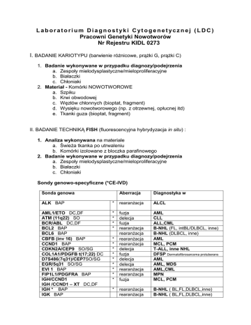 Laboratorium Diagnostyki Cytogenetycznej (LDC) Pracowni Genetyki Nowotworów Nr Rejestru KIDL 0273 I. BADANIE KARIOTYPU (barwienie różnicowe, prążki G, prążki C) 1. Badanie wykonywane w przypadku diagnozy/podejrzenia a. Zespoły mielodysplastyczne/mieloproliferacyjne b. Białaczki c. Chłoniaki 2. Materiał - Komórki NOWOTWOROWE a. Szpiku b. Krwi obwodowej c. Węzłów chłonnych (bioptat, fragment) d. Wysięku nowotworowego (np. z otrzewnej, opłucnej itd) e. Tkanki guza (bioptat, fragment) II. BADANIE TECHNIKĄ FISH (fluorescencyjna hybrydyzacja in situ) : 1. Analiza wykonywana na materiale a. Świeża tkanka po utrwaleniu b. Komórki izolowane z bloczka parafinowego 2. Badanie wykonywane w przypadku diagnozy/podejrzenia a. Zespoły mielodysplastyczne/mieloproliferacyjne b. Białaczki c. Chłoniaki Sondy genowo-specyficzne (*CE-IVD) Sonda genowa Aberracja Diagnostyka w ALK BAP * rearanżacja ALCL AML1/ETO DC,DF ATM (11q22) SO BCR/ABL DC,DF BCL2 BAP BCL6 BAP CBFB (inv 16) BAP CCND1 BAP CDKN2A/CEP9 SO/SG COL1A1/PDGFB t(17;22) DC D7S486(7q31)/CEP7SO/SG EGR/5q31 SO/SG EVI 1 BAP FIP1L1/PDGFRA BAP IGH/CCND1 IGH /CCND1 – XT DC,DF IGH * BAP IGK BAP * * * * fuzja delecja fuzja rearanżacja rearanżacja rearanżacja rearanżacja delecja fuzja delecja delecja rearanżacja rearanżacja fuzja AML CLL ALL,CML B-NHL (FL, intBL/DLBCL, inne) B-NHL (DLBCL, inne) AML MCL, PCM T-ALL, inne NHL DFSP Dermatofibrosarcoma protuberans AML AML, MDS AML,CML MPN MCL, PCM rearanżacja rearanżacja B-NHL ( BL,FL,DLBCL,inne) B-NHL ( BL,FL,DLBCL,inne) * * * * * * * * * * IGL BAP IGH/FGFR3 DC,DF IGH/MAF DC,DF IGH/ MYC DC,DF IGH/BCL2 DC,DF MALT1 BAP MLL BAP MYC BAP PDGFRB BAP PML/RARα α DC,DF TCR A/D** BAP TCR G** BAP TCRB** BAP TP53 SO 13q14.3 SO * * * * * * * * * * * * * * rearanżacja fuzja fuzja fuzja fuzja rearanżacja rearanżacja rearanżacja rearanżacja fuzja rearanżacja rearanżacja rearanżacja delecja delecja B-NHL ( BL,FL,DLBCL,inne) PCM PCM B-NHL ( BL,FL,DLBCL,inne) B-NHL ( BL,FL,DLBCL,inne) MZL ALL,AML B-NHL ( BL,FL,DLBCL,inne) MPN AML T-NHL T-NHL T-NHL NHL PCM,CLL rearanżacje IGH ujawniane w badaniu FISH np.w CLL NIE SĄ RÓWNOWAŻNE z. klonalnymi rearanżacjami IG wykrywanymi metodami molekularnymi ** rearanżacją TCR ujawniana w badaniu FISH w np. T-NHL NIE SĄ RÓWNOWAŻNE z klonalnymi rearanżacjami TCR wykrywanymi metodami molekularnymi 2. CZYNNIKI ROKOWNICZE (CE-IVD) 1. Panel CLL/SLL z sondami: D13S319/ 13q34 / CEP12/p53/ATM Wykrywa del(13q14), del(11q) ATM, del(17p) TP53, trisomia 12 2. Panel SZPICZAKOWY z sondami: D13S319/ 13q34 / IGH/MAF/ IGH/FGFR3 / IGH/CCND1/p53 Badanie FISH na wyodrębnionej populacji plazmocytów. Równoczesne znakowanie komórek plazmatycznych przeciwciałami Anti-Human λ/κ i sondami DNA Wykrywa istotne rearanżacje i delecje:IGH/MAF t(14;16), IGH/FGFR3 t(4;14), del(13)(q14~34), IGH/CCND1 t(11;14)(q13;q32), delTP53 del(17p). 3. Sondy centromerowo-specyficzne Określenie liczby kopii poszczególnych chromosomów w badanej populacji komórek: Sondy znakujące centromery chromosomów X i Y oraz sody centromerowe dla większości autosomów z wyjątkiem chromosomów13 i 21. 4. Sondy malujące (chromosomowo-specyficzne) Identyfikacja markerów chromosomowych: Sondy malujące każdy chromosom, dla zdefiniowania pochodzenia markerów stwierdzonych w badaniu kariotypu. W razie potrzeby ponadrutynowej analizy dysponujemy dodatkowo sondami: 1p36 Microdeletion, tel 3q SO, 6 q arm telomere SO, 8 q tel SO, tel 8p SG, 13q34 SG, ASS (9q34) SA, BCL3 (19q13) BAP, BCL 10 (1p22) BAP, CCND1 /CEP11 SO/SG, CKS1B/CDKN2C (1q21,1p32) SO/SG, D20S108 (20q12) SO, ETV 6 (12p13) BAP, IGH/CCND3 DC,DF, IGH/MAFB DC,DF , iso17q (MPO/p53) SO/SG, MYB (6q23) SA, MYH11 inv(16) BAP, ONMM 1q21/8p21 SO/SG, PAX5 (9p13) BAP, PBX1/ TCF3 (E2A) t(1;19) DCDF,SILTAL1(1p32) BAP, TCL1(14q32) BAP, TLX1(10q34) BAP, JAK2(9p24) BAP Obowiązuje od 1.04.2014