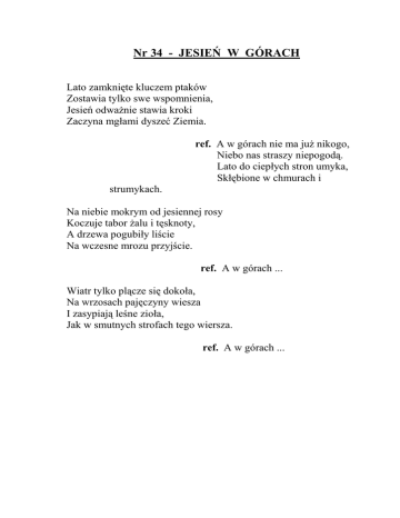 Nr 34 - JESIEŃ W GÓRACH Lato zamknięte kluczem ptaków Zostawia tylko swe wspomnienia, Jesień odważnie stawia kroki Zaczyna mgłami dyszeć Ziemia. ref. A w górach nie ma już nikogo, Niebo nas straszy niepogodą. Lato do ciepłych stron umyka, Skłębione w chmurach i strumykach. Na niebie mokrym od jesiennej rosy Koczuje tabor żalu i tęsknoty, A drzewa pogubiły liście Na wczesne mrozu przyjście. ref. A w górach ... Wiatr tylko plącze się dokoła, Na wrzosach pajęczyny wiesza I zasypiają leśne zioła, Jak w smutnych strofach tego wiersza. ref. A w górach ...