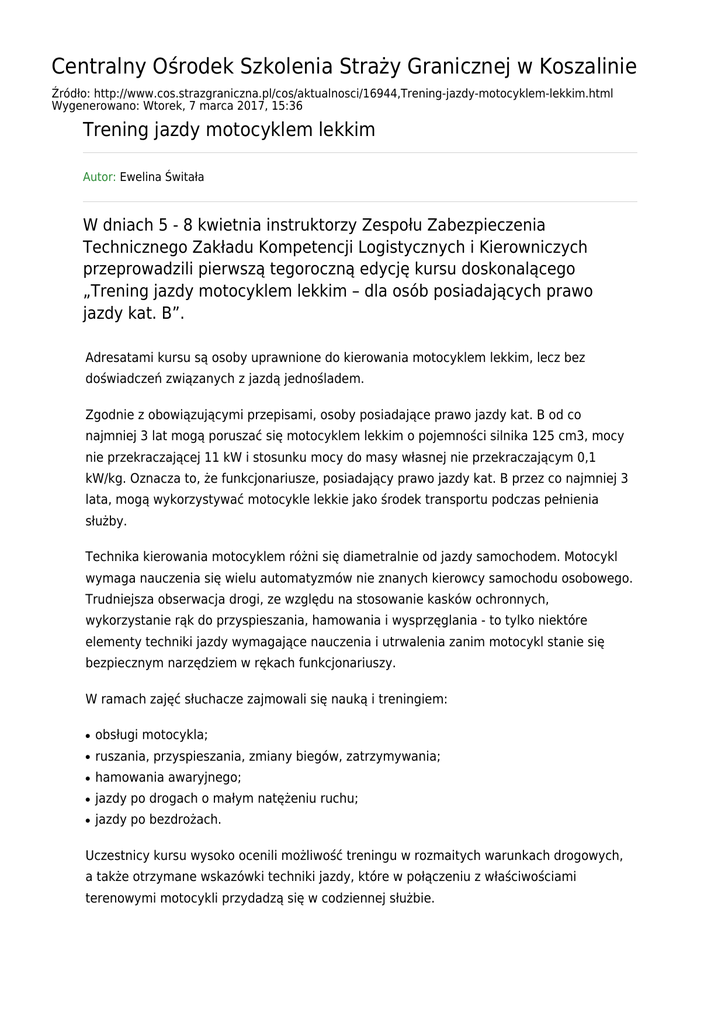 Centralny Ośrodek Szkolenia Straży Granicznej w Koszalinie Źródło: http://www.cos.strazgraniczna.pl/cos/aktualnosci/16944,Trening-jazdy-motocyklem-lekkim.html Wygenerowano: Wtorek, 7 marca 2017, 15:36 Trening jazdy motocyklem lekkim Autor: Ewelina Świtała W dniach 5 - 8 kwietnia instruktorzy Zespołu Zabezpieczenia Technicznego Zakładu Kompetencji Logistycznych i Kierowniczych przeprowadzili pierwszą tegoroczną edycję kursu doskonalącego „Trening jazdy motocyklem lekkim – dla osób posiadających prawo jazdy kat. B”. Adresatami kursu są osoby uprawnione do kierowania motocyklem lekkim, lecz bez doświadczeń związanych z jazdą jednośladem. Zgodnie z obowiązującymi przepisami, osoby posiadające prawo jazdy kat. B od co najmniej 3 lat mogą poruszać się motocyklem lekkim o pojemności silnika 125 cm3, mocy nie przekraczającej 11 kW i stosunku mocy do masy własnej nie przekraczającym 0,1 kW/kg. Oznacza to, że funkcjonariusze, posiadający prawo jazdy kat. B przez co najmniej 3 lata, mogą wykorzystywać motocykle lekkie jako środek transportu podczas pełnienia służby. Technika kierowania motocyklem różni się diametralnie od jazdy samochodem. Motocykl wymaga nauczenia się wielu automatyzmów nie znanych kierowcy samochodu osobowego. Trudniejsza obserwacja drogi, ze względu na stosowanie kasków ochronnych, wykorzystanie rąk do przyspieszania, hamowania i wysprzęglania - to tylko niektóre elementy techniki jazdy wymagające nauczenia i utrwalenia zanim motocykl stanie się bezpiecznym narzędziem w rękach funkcjonariuszy. W ramach zajęć słuchacze zajmowali się nauką i treningiem: ● obsługi motocykla; ● ruszania, przyspieszania, zmiany biegów, zatrzymywania; ● hamowania awaryjnego; ● jazdy po drogach o małym natężeniu ruchu; ● jazdy po bezdrożach. Uczestnicy kursu wysoko ocenili możliwość treningu w rozmaitych warunkach drogowych, a także otrzymane wskazówki techniki jazdy, które w połączeniu z właściwościami terenowymi motocykli przydadzą się w codziennej służbie.