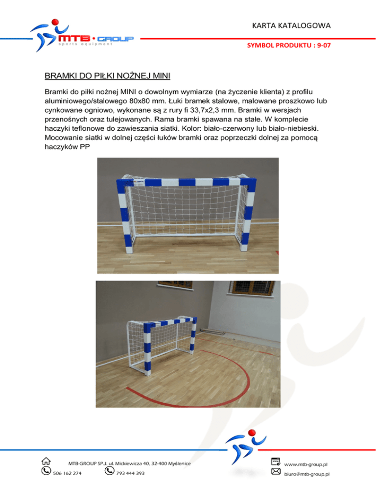 KARTA KATALOGOWA SYMBOL PRODUKTU : 9-07 BRAMKI DO PIŁKI NOŻNEJ MINI Bramki do piłki nożnej MINI o dowolnym wymiarze (na życzenie klienta) z profilu aluminiowego/stalowego 80x80 mm. Łuki bramek stalowe, malowane proszkowo lub cynkowane ogniowo, wykonane są z rury fi 33,7x2,3 mm. Bramki w wersjach przenośnych oraz tulejowanych. Rama bramki spawana na stałe. W komplecie haczyki teflonowe do zawieszania siatki. Kolor: biało-czerwony lub biało-niebieski. Mocowanie siatki w dolnej części łuków bramki oraz poprzeczki dolnej za pomocą haczyków PP MTB-GROUP SP.J. ul. Mickiewicza 40, 32-400 Myślenice 506 162 274 793 444 393 www.mtb-group.pl [email protected]