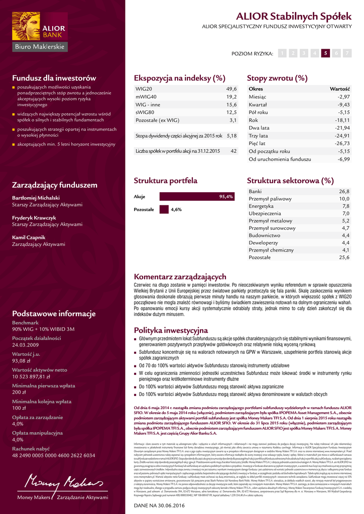 ALIOR Stabilnych Spółek ALIOR SPECJALISTYCZNY FUNDUSZ INWESTYCYJNY OTWARTY POZIOM RYZYKA: Fundusz dla inwestorów ■■ poszukujących możliwości uzyskania ponadprzeciętnych stóp zwrotu a jednocześnie akceptujących wysoki poziom ryzyka inwestycyjnego ■■ widzących największy potencjał wzrostu wśród spółek o silnych i stabilnych fundamentach 49,6 19,2 15,6 12,5 3,1 ■■ poszukujących strategii opartej na instrumentach o wysokiej płynności Stopa dywidendy części akcyjnej za 2015 rok 5,18 ■■ akceptujących min. 5 letni horyzont inwestycyjny Liczba spółek w portfelu akcji na 31.12.2015 Zarządzający funduszem Bartłomiej Michalski Starszy Zarządzający Aktywami 42 Struktura portfela Akcje Pozostałe 2 3 4 5 6 7 Stopy zwrotu (%) Ekspozycja na indeksy (%) WIG20 mWIG40 WIG - inne sWIG80 Pozostałe (ex WIG) 1 Okres Miesiąc Kwartał Pół roku Rok Dwa lata Trzy lata Pięć lat Od początku roku Od uruchomienia funduszu Wartość -2,97 -9,43 -5,15 -18,11 -21,94 -24,91 -26,73 -5,15 -6,99 Struktura sektorowa (%) 95,4% 4,6% Fryderyk Krawczyk Starszy Zarządzający Aktywami Kamil Czapnik Zarządzający Aktywami Banki Przemysł paliwowy Energetyka Ubezpieczenia Przemysł metalowy Przemysł surowcowy Budownictwo Deweloperzy Przemysł chemiczny Pozostałe 26,8 10,0 7,8 7,0 5,2 4,7 4,4 4,4 4,1 25,6 Komentarz zarządzających Podstawowe informacje Benchmark 90% WIG + 10% WIBID 3M Czerwiec na długo zostanie w pamięci inwestorów. Po nieoczekiwanym wyniku referendum w sprawie opuszczenia Wielkiej Brytanii z Unii Europejskiej przez światowe parkiety przetoczyła się fala paniki. Skalę zaskoczenia wynikiem głosowania doskonale obrazują pierwsze minuty handlu na naszym parkiecie, w których większość spółek z WIG20 początkowo nie mogła znaleźć równowagi i byliśmy świadkiem zawieszenia notowań na dolnym ograniczeniu wahań. Po opanowaniu emocji kursy akcji systematycznie odrabiały straty, jednak mimo to cały dzień zakończył się dla indeksów dużym minusem. Polityka inwestycyjna Początek działalności 24.03.2009 ■■ Głównym przedmiotem lokat Subfunduszu są akcje spółek charakteryzujących się stabilnymi wynikami finansowymi, generowaniem pozytywnych przepływów gotówkowych oraz relatywnie niską wyceną rynkową Wartość j.u. 93,08 zł ■■ Subfundusz koncentruje się na walorach notowanych na GPW w Warszawie, uzupełnienie portfela stanowią akcje spółek zagranicznych Wartość aktywów netto 10 523 897,81 zł Minimalna pierwsza wpłata 200 zł Minimalna kolejna wpłata 100 zł Opłata za zarządzanie 4,0% Opłata manipulacyjna 4,0% Rachunek nabyć 48 2490 0005 0000 4600 2622 6034 ■■ Od 70 do 100% wartości aktywów Subfunduszu stanowią instrumenty udziałowe ■■ W celu ograniczenia zmienności jednostki uczestnictwa Subfundusz może lokować środki w instrumenty rynku pieniężnego oraz krótkoterminowe instrumenty dłużne ■■ Do 100% wartości aktywów Subfunduszu mogą stanowić aktywa zagraniczne ■■ Do 100% wartości aktywów Subfunduszu mogą stanowić aktywa denominowane w walutach obcych Od dnia 6 maja 2014 r. nastąpiła zmiana podmiotu zarządzającego portfelami subfunduszy wydzielonych w ramach funduszu ALIOR SFIO. W okresie do 5 maja 2014 roku (włącznie), podmiotem zarządzającym była spółka IPOPEMA Asset Management S.A., obecnie podmiotem zarządzającym aktywami portfeli subfunduszy jest spółka Money Makers TFI S.A. Od dnia 1 sierpnia 2015 roku nastąpiła zmiana podmiotu zarządzającego funduszem ALIOR SFIO. W okresie do 31 lipca 2015 roku (włącznie), podmiotem zarządzającym była spółka IPOPEMA TFI S.A., obecnie podmiotem zarządzającym funduszem ALIOR SFIO jest spółka Money Makers TFI S.A. Money Makers TFI S.A. jest częścią Grupy Alior Banku S.A. Informacje i dane zawarte w tym materiale są udostępniane tylko i wyłącznie w celach informacyjnych i reklamowych i nie mogą stanowić podstawy do podjęcia decyzji inwestycyjnej. Nie należy traktować ich jako rekomendacji inwestowania w jakiekolwiek instrumenty finansowe lub formy doradztwa inwestycyjnego, jak również jako oferty zawarcia umowy w rozumieniu Kodeksu cywilnego. Informacje o ALIOR Specjalistycznym Funduszu Inwestycyjnym Otwartym zarządzanym przez Money Makers TFI S.A. oraz o jego ryzyku inwestycyjnym zawarte są w prospekcie informacyjnym dostępnym w siedzibie Money Makers TFI S.A. oraz na stronie internetowej www.moneymakers.pl. Przed nabyciem jednostek uczestnictwa należy zapoznać się z prospektem informacyjnym, który zawiera informacje niezbędne do oceny inwestycji oraz wskazuje ryzyka, koszty i opłaty. Ilekroć w materiałach jest mowa o subfunduszach oznacza to subfundusze wydzielone w ramach ALIOR SFIO. Stopa dywidendy dla części akcyjnej to suma stóp dywidendy dla poszczególnych akcji z portfela subfunduszu odniesionych do udziału tych akcji w portfelu akcji subfunduszu, na dzień sporządzenia karty. Źródło wartości stóp dywidendy poszczególnych akcji: gpw.pl. Przedstawione wyniki mają charakter historyczny (źródło: Money Makers TFI S.A.) i dotyczą jednostek uczestnictwa kategorii A. Money Makers TFI S.A. ani ALIOR SFIO nie gwarantują osiągnięcia celów inwestycyjnych funduszy lub subfunduszy ani uzyskania podobnych wyników w przyszłości. Inwestycje w fundusze obarczone są ryzykiem inwestycyjnym, a uczestnik musi liczyć się z możliwością utraty przynajmniej części zainwestowanych środków. Indywidualna stopa zwrotu z inwestycji nie jest tożsama z wynikami inwestycyjnymi danego funduszu i jest uzależniona od wartości jednostki uczestnictwa w momencie jej zbycia i odkupienia przez fundusz oraz od poziomu pobranych opłat manipulacyjnych i zapłaconego podatku bezpośrednio obciążającego dochód z inwestycji w fundusz, w szczególności podatku od dochodów kapitałowych. Tabele opłat znajdują się na stronie internetowej www.moneymakers.pl. Wartość aktywów ne