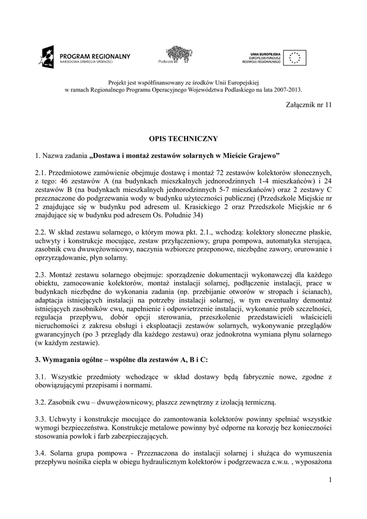 Projekt jest współfinansowany ze środków Unii Europejskiej w ramach Regionalnego Programu Operacyjnego Województwa Podlaskiego na lata 2007-2013. Załącznik nr 11 OPIS TECHNICZNY 1. Nazwa zadania „Dostawa i montaż zestawów solarnych w Mieście Grajewo” 2.1. Przedmiotowe zamówienie obejmuje dostawę i montaż 72 zestawów kolektorów słonecznych, z tego: 46 zestawów A (na budynkach mieszkalnych jednorodzinnych 1-4 mieszkańców) i 24 zestawów B (na budynkach mieszkalnych jednorodzinnych 5-7 mieszkańców) oraz 2 zestawy C przeznaczone do podgrzewania wody w budynku użyteczności publicznej (Przedszkole Miejskie nr 2 znajdujące się w budynku pod adresem ul. Krasickiego 2 oraz Przedszkole Miejskie nr 6 znajdujące się w budynku pod adresem Os. Południe 34) 2.2. W skład zestawu solarnego, o którym mowa pkt. 2.1., wchodzą: kolektory słoneczne płaskie, uchwyty i konstrukcje mocujące, zestaw przyłączeniowy, grupa pompowa, automatyka sterująca, zasobnik cwu dwuwężownicowy, naczynia wzbiorcze przeponowe, niezbędne zawory, orurowanie i oprzyrządowanie, płyn solarny. 2.3. Montaż zestawu solarnego obejmuje: sporządzenie dokumentacji wykonawczej dla każdego obiektu, zamocowanie kolektorów, montaż instalacji solarnej, podłączenie instalacji, prace w budynkach niezbędne do wykonania zadania (np. przebijanie otworów w stropach i ścianach), adaptacja istniejących instalacji na potrzeby instalacji solarnej, w tym ewentualny demontaż istniejących zasobników cwu, napełnienie i odpowietrzenie instalacji, wykonanie prób szczelności, regulacja przepływu, dobór opcji sterowania, przeszkolenie przedstawicieli właścicieli nieruchomości z zakresu obsługi i eksploatacji zestawów solarnych, wykonywanie przeglądów gwarancyjnych (po 3 przeglądy dla każdego zestawu) oraz jednokrotna wymiana płynu solarnego (w każdym zestawie). 3. Wymagania ogólne – wspólne dla zestawów A, B i C: 3.1. Wszystkie przedmioty wchodzące w skład dostawy będą fabrycznie nowe, zgodne z obowiązującymi przepisami i normami. 3.2. Zasobnik cwu – dwuwężownicowy, płaszcz zewnętrzny z izolacją termiczną. 3.3. Uchwyty i konstrukcje mocujące do zamontowania kolektorów powinny spełniać wszystkie wymogi bezpieczeństwa. Konstrukcje metalowe powinny być odporne na korozję bez konieczności stosowania powłok i farb zabezpieczających. 3.4. Solarna grupa pompowa - Przeznaczona do instalacji solarnej i służąca do wymuszenia przepływu nośnika ciepła w obiegu hydraulicznym kolektorów i podgrzewacza c.w.u. , wyposażona 1 w separator powietrza, zawór odcinający, - zawór zwrotny, zawór do napełniania i serwisowania, pompę obiegową, termometr, manometr 0-10 bar, regulator przepływu, solarny zawór bezpieczeństwa 6 bar, izolację cieplną. W układzie uzupełniania obiegu glikolowego zastosować ręczną pompę uzupełniającą. 3.5. Zastosowany układ automatyki winien spełniać następujące funkcje: a) Sterowanie pracą stacji pompowej w zależności od różnicy temperatur b) Ochrona przed przegrzaniem kolektorów c) Schładzanie rewersyjne (nadmiar energii odprowadzany jest w godzinach nocnych do kolektora celem wypromieniowania. Funkcja wykorzystywana w przypadku braku rozbioru ciepłej wody użytkowej) d) Funkcja uruchomienia systemu solarnego e) Funkcja zabezpieczenia przed zamarzaniem f) Zabezpieczenie odbiorników ciepła oraz urządzeń instalacji glikolowej przed przekroczeniem ich temperatury maksymalnej g) Sterowanie pracą układu mieszania c.w.u. h) Dezynfekcja temperaturowa zasobnika ciepłej wody użytkowej i) Wyliczenie dziennej oraz sumarycznej energii zgromadzonej przez kolektory słoneczne z funkcją zapamiętania uzysków solarnych przez okres min. 6 lat j) Czytelny wyświetlacz z symbolami k) Wskazanie stanu w celu natychmiastowego rozpoznania warunków nadzwyczajnych 3.6. Płyn solarny - wodny roztwór glikolu propylenowego, posiadający w składzie inhibitory o właściwościach antykorozyjnych; temperatura zamarzania – nie wyższa niż -25°C. Płyn solarny należy zapewnić w ilości niezbędnej do prawidłowego funkcjonowania instalacji solarnej. 3.7. Przeponowe naczynia i zawory bezpieczeństwa – do zabezpieczenia instalacji w obiegu glikolowym i po stronie wody zastosować membranowe zawory bezpieczeństwa, ciśnienie otwarcia zaworu: 6 bar. W obiegu glikolowym zastosować przeponowe naczynia zbiorcze na maksymalne ciśnienie ≥ 6bar. Wielkość naczyń dobrać zgodnie ze sztuką hydrauliczną dla odpowiednich zestawów. Zawory i naczynia powinny posiadać dopuszczenia i certyfikaty zgodnie z obowiązującymi przepisami Dozoru Technicznego. 3.8. Zestaw solarny powinien gwarantować niezmienną i nie wymagającą interwencji urzytkownika eksploatację po przerwach w dostawie energii elektrycznej 3.9. Wymagania Zamawiającego odnośnie parametrów kolektorów słonecznych opisano w Załączniku nr 2 do SIWZ. 4. Wymagania szczególne dla zestawów A, B i C: 4.1. Zestaw A: a. kolektory 2 szt. o powierzchni apertury min. 1,8 m2 każdy; b. zasobnik cwu dwuwężownicowy o pojemności min. 200 l; c. wymagania ogólne z pkt. 3 4.2. Zestaw B: a. kolektory 3 szt. o powierzchni apertury min. 1,8 m2 każdy; b. zasobnik cwu dwuwężownicowy o pojemności min. 300 l; c. wymagania ogólne z pkt. 3 2 4.3. Zestaw C: a. kolektory 10 szt. o powierzchni apertury min. 1,8 m2 każdy; b. zasobnik cwu dwuwężownicowy o pojemności min. 1000 l; c. termostatyczny zawór mieszający (antyoparzeniowy) na wyjściu ciepłej wody z zasobnika cwu; d. w zasobniku cwu zamontowana grzałkę elektryczną min. 2000W do podgrzewania cwu w warunkach niedostatecznego nasłonecznienia; e. wymagania ogólne z pkt. 3 Data sporządzenia oferty: …....................................... ….......................................................... podpis osoby (osób) uprawnionej(ych) do reprezentowania Wykonawcy 3