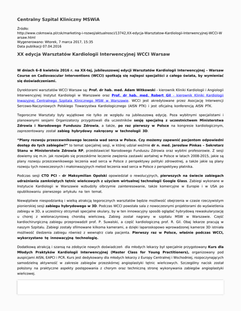Centralny Szpital Kliniczny MSWiA Źródło: http://www.cskmswia.pl/csk/marketing-i-rozwoj/aktualnosci/13742,XX-edycja-Warsztatow-Kardiologii-Interwencyjnej-WCCI-W arsaw.html Wygenerowano: Wtorek, 7 marca 2017, 15:35 Data publikacji 07.04.2016 XX edycja Warsztatów Kardiologii Interwencyjnej WCCI Warsaw W dniach 6–8 kwietnia 2016 r. na XX-tej, jubileuszowej edycji Warsztatów Kardiologii Interwencyjnej – Warsaw Course on Cadiovascular Interventions (WCCI) spotkają się najlepsi specjaliści z całego świata, by wymieniać się doświadczeniami. Dyrektorami warsztatów WCCI Warsaw są: Prof. dr hab. med. Adam Witkowski - kierownik Kliniki Kardiologii i Angiologii Interwencyjnej Instytut Kardiologii w Warszawie oraz Prof. dr hab. med. Robert Gil - kierownik Kliniki Kardiologii Inwazyjnej Centralnego Szpitala Klinicznego MSW w Warszawie. WCCI jest akredytowane przez Asocjację Interwencji Sercowo-Naczyniowych Polskiego Towarzystwa Kardiologicznego (AISN PTK) i jest oficjalną konferencją AISN PTK. Tegoroczne Warsztaty były wyjątkowe nie tylko ze względu na jubileuszową edycję. Poza wybitnymi specjalistami i planowanymi sesjami Organizatorzy przygotowali dla uczestników sesję specjalną z uczestnictwem Ministerstwa Zdrowia i Narodowego Funduszu Zdrowia, a także, po raz pierwszy w Polsce na kongresie kardiologicznym, zaprezentowany został zabieg hybrydowy nakręcony w technologii 3D. “Plany rozwoju przezcewnikowego leczenia wad serca w Polsce. Czy możemy zapewnić pacjentom odpowiedni dostęp do tych zabiegów?” to temat specjalnej sesji, w której udział weźmie dr n. med. Jarosław Pinkas – Sekretarz Stanu w Ministerstwie Zdrowia RP, przedstawiciel Narodowego Funduszu Zdrowia oraz wybitni profesorowie. Z sesji dowiemy się m.in. jak rozwijało się przezskórne leczenie zwężenia zastawki aortalnej w Polsce w latach 2008-2015, jakie są plany rozwoju przezcewnikowego leczenia wad serca w Polsce z perspektywy polityki zdrowotnej, a także jakie są plany rozwoju tych nowoczesnych i małoinwazyjnych metod leczenia wad serca w Polsce z perspektywy płatnika. Podczas sesji CTO PCI - dr Maksymilian Opolski opowiedział o rewolucyjnych, pierwszych na świecie zabiegach udrażniania zamkniętych tętnic wieńcowych z użyciem wirtualnej technologii Google Glass. Zabiegi wykonane w Instytucie Kardiologii w Warszawie wzbudziły olbrzymie zainteresowanie, także komercyjne w Europie i w USA po opublikowaniu pierwszego artykułu na ten temat. Niewątpliwie niespodzianką i wielką atrakcją tegorocznych warsztatów będzie możliwość obejrzenia w czasie rzeczywistym pionierskiej sesji zabiegu hybrydowego w 3D. Podczas WCCI powstała sala z nowoczesnymi projektorami do wyświetlenia zabiegu w 3D, a uczestnicy otrzymali specjalne okulary, by w ten innowacyjny sposób oglądać hybrydową rewaskularyzację u chorej z wielonaczyniową chorobą wieńcową. Zabieg został nagrany w szpitalu MSW w Warszawie. Część kardiochirurgiczną zabiegu przeprowadził prof. P. Suwalski, a część kardiologiczną prof. R. Gil. Obaj lekarze pracują w naszym Szpitalu. Zabiegi zostały sfilmowane kilkoma kamerami, a dzięki laparoskopowo wprowadzonej kamerze 3D istniała możliwość śledzenia zabiegu również z wewnątrz ciała pacjenta. Pierwszy raz w Polsce, właśnie podczas WCCI, wykorzystano tę innowacyjną technologię. Dodatkową atrakcją i szansą na zdobycie nowych doświadczeń dla młodych lekarzy był specjalnie przygotowany Kurs dla Młodych Praktyków Kardiologii Interwencyjnej (Master Class for Young Practitioners), organizowany pod auspicjami AISN, EAPCI i PCR. Kurs jest dedykowany dla młodych lekarzy z Europy Centralnej i Wschodniej, rozpoczynających samodzielną aktywność w zakresie zabiegów przezskórnej angioplastyki tętnic wieńcowych. Szczególny nacisk został położony na praktyczne aspekty postępowania z chorym oraz techniczną stronę wykonywania zabiegów angioplastyki wieńcowej. Tętnica wieńcowa w działaniu. Trwa zabieg angioplastyki #wołoska137 #cskmswia Film zamieszczony przez użytkownika CSK MSWiA w Warszawie (@cskmswia) 6 Kwi, 2016 o 7:02 PDT Tematami przewodnimi tegorocznej edycji były: ● przezskórna angioplastyka w wielonaczyniowej chorobie wieńcowej ● leczenie ostrych zespołów wieńcowych ● zabiegi hybrydowe ● przezcewnikowe leczenie wad zastawkowych serca ● zamykanie uszka lewego przedsionka oraz nieprawidłowych połączeń wewnątrzsercowych ● postępy w przezskórnym leczeniu chorób tętnic obwodowych, ze szczególnym uwzględnieniem angioplastyki tętnic szyjnych. Multimedialne prezentacje, symultaniczne konferencje oraz interaktywne warsztaty praktyczne organizowane są przez Fundację Wspierania Kardiologii Interwencyjnej i odbywały się pod patronatem Kliniki Kardiologii Inwazyjnej CSK MSW oraz Kliniki Kardiologii i Angiologii Interwencyjnej Instytutu Kardiologii w Warszawie. Drukuj Generuj PDF Powiadom znajomego Wstecz
