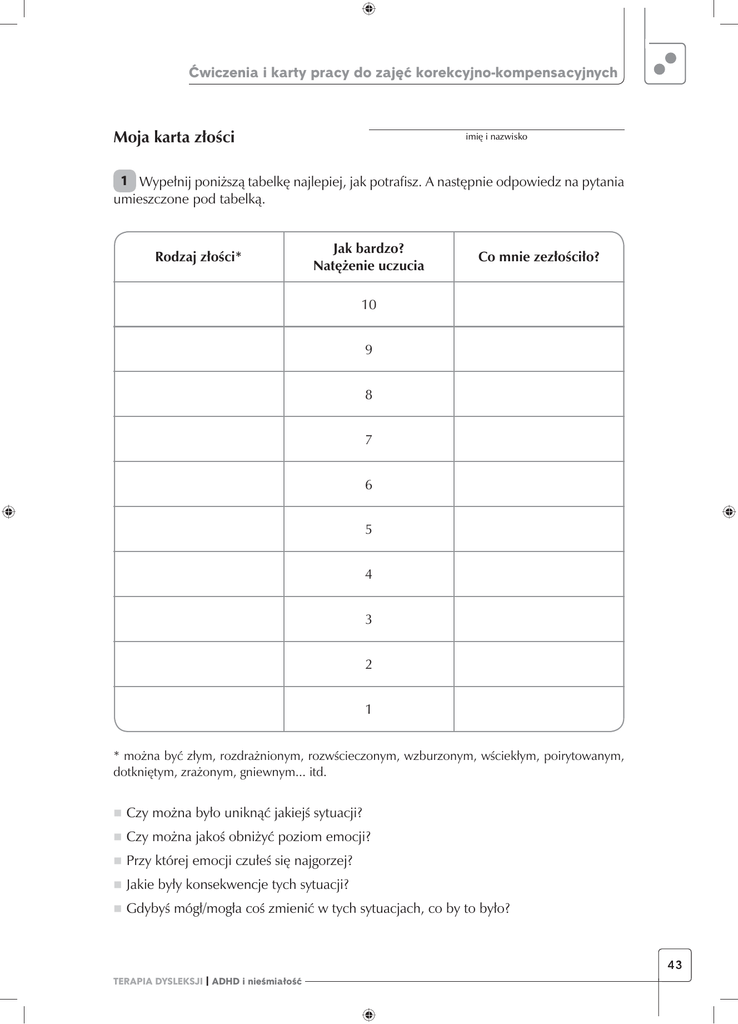 Ćwiczenia i karty pracy do zajęć korekcyjno-kompensacyjnych Moja karta złości imię i nazwisko 1 Wypełnij poniższą tabelkę najlepiej, jak potrafisz. A następnie odpowiedz na pytania umieszczone pod tabelką. Rodzaj złości* Jak bardzo? Natężenie uczucia Co mnie zezłościło? 10 9 8 7 6 5 4 3 2 1 * można być złym, rozdrażnionym, rozwścieczonym, wzburzonym, wściekłym, poirytowanym, dotkniętym, zrażonym, gniewnym... itd. Czy można było uniknąć jakiejś sytuacji? Czy można jakoś obniżyć poziom emocji? Przy której emocji czułeś się najgorzej? Jakie były konsekwencje tych sytuacji? Gdybyś mógł/mogła coś zmienić w tych sytuacjach, co by to było? 43 TERAPIA DYSLEKSJI | ADHD i nieśmiałość ADHD Wyrażanie emocji imię i nazwisko (ćwiczenie strona 17) 1 Przeczytaj poniższe zdania za każdym razem inaczej. Zmieniaj ton głosu, jego barwę, głośność, intonację. 1. Jestem głodny. 2. Nie odrobiłem lekcji. 3. Zostawiłem plecak w domu. 4. Czytam interesującą książkę. 5. Nie lubię owocowych lodów. 6. Przepraszam, że nie posprzątałam tego pokoju. 2 Teraz przeczytaj te zdania, używając tylko głosu, tak jakbyś był/była: a) zdziwiony/zdziwiona; b) smutny/smutna; c) zły/zła; d) przestraszony/przestraszona; e) szczęśliwy/szczęśliwa. 3 Przeczytaj powyższe zdania według instrukcji powyżej. Tym razem oprócz modulacji głosu użyj również gestu. 4 Odpowiedz na pytania: Co było trudne w tym ćwiczeniu? Co było łatwe w tym ćwiczeniu? Który sposób był najtrudniejszy do prezentacji? Dlaczego? 52 TERAPIA DYSLEKSJI | ADHD i nieśmiałość Ćwiczenia i karty pracy do zajęć korekcyjno-kompensacyjnych Funkcje przedmiotów imię i nazwisko (ćwiczenie strona 75) 1 Pomyśl, do czego jeszcze mogą służyć te przedmioty. Wpisz tyle różnych zastosowań każdego z nich, ile tylko przyjdzie ci do głowy. Pamiętaj! Każdy pomysł jest dobry. Nowe zastosowania: ołówek Nowe zastosowania: łyżka spinacz biurowy Nowe zastosowania: Nowe zastosowania: młotek szczotka do włosów Nowe zastosowania: Nowe zastosowania: kubek Nowe zastosowania: kaganiec psa Nowe zastosowania: klucz pasta do zębów Nowe zastosowania: Nowe zastosowania: słoik 93 TERAPIA DYSLEKSJI | ADHD i nieśmiałość
