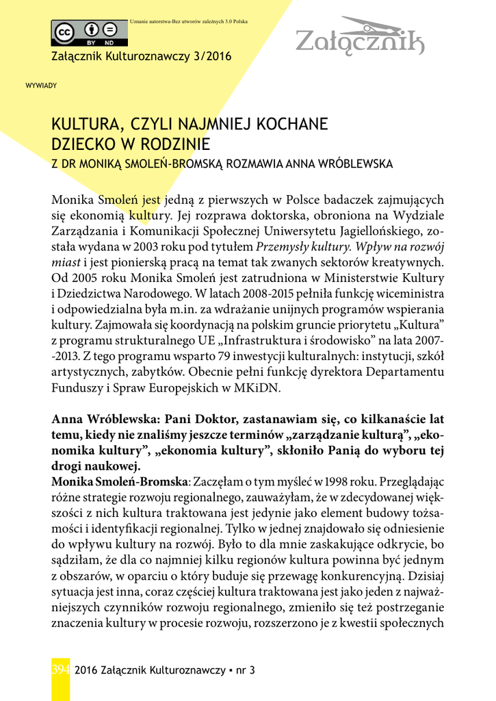 Uznanie autorstwa-Bez utworów zależnych 3.0 Polska Załącznik Kulturoznawczy 3/2016 Załącznik WYWIADY KULTURA, CZYLI NAJMNIEJ KOCHANE DZIECKO W RODZINIE Z DR MONIKĄ SMOLEŃ-BROMSKĄ ROZMAWIA ANNA WRÓBLEWSKA Monika Smoleń jest jedną z pierwszych w Polsce badaczek zajmujących się ekonomią kultury. Jej rozprawa doktorska, obroniona na Wydziale Zarządzania i Komunikacji Społecznej Uniwersytetu Jagiellońskiego, została wydana w 2003 roku pod tytułem Przemysły kultury. Wpływ na rozwój miast i jest pionierską pracą na temat tak zwanych sektorów kreatywnych. Od 2005 roku Monika Smoleń jest zatrudniona w Ministerstwie Kultury i Dziedzictwa Narodowego. W latach 2008-2015 pełniła funkcję wiceministra i odpowiedzialna była m.in. za wdrażanie unijnych programów wspierania kultury. Zajmowała się koordynacją na polskim gruncie priorytetu „Kultura” z programu strukturalnego UE „Infrastruktura i środowisko” na lata 2007‑2013. Z tego programu wsparto 79 inwestycji kulturalnych: instytucji, szkół artystycznych, zabytków. Obecnie pełni funkcję dyrektora Departamentu Funduszy i Spraw Europejskich w MKiDN. Anna Wróblewska: Pani Doktor, zastanawiam się, co kilkanaście lat temu, kiedy nie znaliśmy jeszcze terminów „zarządzanie kulturą”, „ekonomika kultury”, „ekonomia kultury”, skłoniło Panią do wyboru tej drogi naukowej. Monika Smoleń-Bromska: Zaczęłam o tym myśleć w 1998 roku. Przeglądając różne strategie rozwoju regionalnego, zauważyłam, że w zdecydowanej większości z nich kultura traktowana jest jedynie jako element budowy tożsamości i identyfikacji regionalnej. Tylko w jednej znajdowało się odniesienie do wpływu kultury na rozwój. Było to dla mnie zaskakujące odkrycie, bo sądziłam, że dla co najmniej kilku regionów kultura powinna być jednym z obszarów, w oparciu o który buduje się przewagę konkurencyjną. Dzisiaj sytuacja jest inna, coraz częściej kultura traktowana jest jako jeden z najważniejszych czynników rozwoju regionalnego, zmieniło się też postrzeganie znaczenia kultury w procesie rozwoju, rozszerzono je z kwestii społecznych 394 2016 Załącznik Kulturoznawczy ▪ nr 3 Kultura, czyli najmniej kochane dziecko w rodzinie także na ekonomiczne. Trafnie oddają to słowa Marshalla McLuhana, który powiedział, że „z ery, w której biznes był naszą kulturą, znaleźliśmy się w erze, w której kultura staje się naszym biznesem”. Odzwierciedlenie tej zmiany widzimy także w systemie planowania rozwoju kraju i regionów. Rola kultury w rozwoju została uwzględniona w Długookresowej Strategii Rozwoju Kraju do 2030 roku, jak również w większości strategii zintegrowanych, m.in. Rozwoju Regionalnego i Rozwoju Kapitału Społecznego. W tej ostatniej, za którą zresztą miałam przyjemność odpowiadać, szeroko rozumiana kultura stanowi oś, wokół której zbudowana jest cała narracja. Kapitał społeczny, którego deficyt uznany został za jeden z dziewięciu największych wyzwań rozwojowych Polski, zdefiniowaliśmy jako fuzję trzech „K”: kreatywności, komunikacji i kooperacji. A.W.: Ten sposób myślenia ewoluuje od lat. W odniesieniu do kultury coraz rzadziej cytuje się liberalne koncepcje z lat 90., gdyż uznawane są dzisiaj za dowód zwykłego nieuctwa, nieznajomości praw, jakimi rządzą się przemysły kreatywne. M.S.-B.: To prawda, nadal jest jednak wiele do zrobienia, zwłaszcza w obszarze rozwoju wspomnianych przez Panią przemysłów kreatywnych. Pojęcie to jest modne, natomiast gdy przyjrzeć się sferze działań w tym obszarze zarówno na poziomie centralnym, jak i regionalnym czy lokalnym, to ciągle napotykamy kwestie wymagające pilnego rozwiązania. Niewątpliwie najważniejszą z nich jest walka z piractwem i ochrona własności intelektualnej, tworzenie zachęt podatkowych i innych mechanizmów ułatwiających funkcjonowanie twórcom i animatorom kultury, wzmocnienie w procesie edukacji powszechnej znaczenia i miejsca edukacji kulturalnej i medialnej. Badania wskazują, że przemysły kreatywne są jedną z najszybciej rozwijających się branż, tworzącą znaczący wkład w PKB, wysoką wartość dodaną. Tak jest też w Polsce. Popatrzmy chociażby na osiągnięcia branży wzornictwa czy gier komputerowych, które doceniane są na całym świecie i idą w parze z ogromnymi pieniędzmi. Pod koniec roku 2011 wartość rynku gier szacowana była na 52 miliardy dolarów, szacowano wtedy, że jego wartość wzrośnie do 2017 roku do około 70 miliardów dolarów. Jednak według najnowszych danych już w ubiegłym roku [2015 – przyp. A.W.] wartość światowego rynku gier szacowano na 82,5 miliardy dolarów, a polskiego na 280 milionów dolarów. Załącznik ▪ www.zalacznik.uksw.edu.pl 395 Rozmowa Z dr Moniką Smoleń-Bromską A.W.: Czy to znaczy, że obecnie przemysły kreatywne należą do kluczowych dla narodowego rozwoju „inteligentnych specjalizacji”? M.S.-B.: W 2014 roku Ministerstwo Gospodarki ogłosiło listę tak zwanych krajowych inteligentnych specjalizacji, to jest takich branż przemysłu, które mają największe szanse na budowę przewagi konkurencyjnej i marki Polski. Było ich osiemnaście, wśród nich technologie inżynierii medycznej, automatyka i robotyka, a także inne ciekawe specjalizacje, ale nie było niczego związanego z kulturą. Podjęliśmy starania, by na tę listę wpisać przemysły kreatywne – przemysł audiowizualny i muzyczny, produkcję gier wideo, wzornictwo. Udało się przygotować na tyle przekonujące uzasadnienie dla włączenia tych właśnie obszarów w strategię rozwojową Polski, że resort gospodarki ostatecznie zdecydował się listę rozszerzyć, dodając dziewiętnastą specjalizację – technologie kreacyjne. Nie był to proces prosty i łatwy także dlatego, że trudno było znaleźć ekspertów, którzy są w stanie wyjść mentalnie poza własną specjalność czy projekt i spojrzeć strat