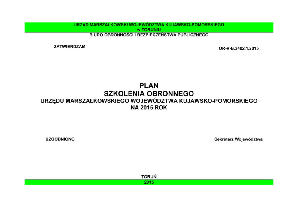 URZĄD MARSZAŁKOWSKI WOJEWÓDZTWA KUJAWSKO-POMORSKIEGO w TORUNIU BIURO OBRONNOŚCI i BEZPIECZEŃSTWA PUBLICZNEGO ZATWIERDZAM OR-V-B.2402.1.2015 PLAN SZKOLENIA OBRONNEGO URZĘDU MARSZAŁKOWSKIEGO WOJEWÓDZTWA KUJAWSKO-POMORSKIEGO NA 2015 ROK Sekretarz Województwa UZGODNIONO TORUŃ 2015 CZĘŚĆ I – Opisowa 1. Dokumenty odniesienia: Ustawa z dnia 21 listopada 1967 r. o powszechnym obowiązku obrony Rzeczypospolitej Polskiej (Dz. U. z 2012 r. Nr 241, poz. 416, z późn. zm.); Rozporządzenie Rady Ministrów z dnia 13 stycznia 2004 r. w sprawie szkolenia obronnego (Dz. U. Nr 16, poz.150); Rozporządzenie Rady Ministrów z dnia 13 stycznia 2004 r. w sprawie ogólnych zasad wykonywania zadań w ramach powszechnego obowiązku obrony (Dz. U. Nr 16 poz. 152 z późn. zm.); Rozporządzenie Rady Ministrów z dnia 27 czerwca 2011 r. w sprawie warunków i sposobu przygotowania oraz wykorzystania podmiotów leczniczych na potrzeby obronne państwa oraz właściwości organów w tych sprawach (Dz. U. z 2011 r. poz. 741); Rozporządzenie Rady Ministrów z dnia 15 czerwca 2004 r. w sprawie warunków i trybu planowania i finansowania zadań wykonywanych w ramach przygotowań obronnych państwa przez organy administracji rządowej i organy administracji samorządu terytorialnego (Dz. U. Nr 152, poz. 1599); Plan szkolenia obronnego Wojewody Kujawsko-Pomorskiego na 2015 r.; Program szkolenia obronnego Województwa Kujawsko-Pomorskiego na lata 2013-2018; Program szkolenia obronnego Marszałka Województwa Kujawsko-Pomorskiego na lata 2014 – 2016; Plan Operacyjny i Tabela realizacji zadań operacyjnych Urzędu Marszałkowskiego; Zarządzenie Nr 10/2014 Marszałka Województwa Kujawsko-Pomorskiego z dnia 24 lutego 2014 r. w sprawie określenia podległych i nadzorowanych jednostek organizacyjnych województwa kujawsko-pomorskiego, w których mają funkcjonować stałe dyżury oraz punkty kontaktowe; Instrukcja „Stałego Dyżuru i „Punktu kontaktowego”; Instrukcje alarmowe (terrorystyczna i bioterrorystyczny oraz procedury postępowania podczas zagrożeń). 2 2. Cele szkolenia: 1) Głównym celem szkolenia obronnego w roku 2015 jest: Przygotowanie kadry kierowniczej i zespołów zadaniowych (grup operacyjnych), wchodzących w skład stanowiska kierowania do działania w sytuacji wystąpienia zagrożenia bezpieczeństwa i w czasie wojny. Doskonalenie procedur współdziałania pozamilitarnego struktur obronnych państwa na różnych szczeblach. 2) Pozostałe cele szkolenia to: przygotowanie kadry kierowniczej Urzędu Marszałkowskiego i wojewódzkich samorządowych jednostek organizacyjnych do wykonania zadań obronnych; dążenie do zgrywania elementów uniwersalnego modelu kierowania, jak również innych elementów systemu obronnego, w szczególności zapewniających sprawne współdziałanie organów administracji samorządowej z organami administracji wojskowej; doskonalenie funkcjonowania systemu stałych dyżurów i punktów kontaktowych podczas podwyższonej gotowości obronnej w ramach ćwiczenia wojewódzkiego. Aktualizacja dokumentacji stałego dyżuru. Rola i zadania stałego dyżuru (całodobowego dyżuru) w Samorządzie Województwa Kujawsko-Pomorskiego. 3 CZĘŚĆ II – Planowane przedsięwzięcia szkoleniowe: Szczebla wojewódzkiego realizowane przez Urząd Marszałkowski Lp. 1 Temat szkolenia 2 Forma szkolenia Termin Miejsce Uczestnicy szkolenia Odpowiedzialny 3 4 5 6 Wykłady ćwiczenia Wg oddzielnego planu organizatora AON WYŻSZE KURSY OBRONNE 1. Przygotowanie kierowniczej kadry administracji samorządowej do wykonywania zadań obronnych oraz podniesienia kwalifikacji w zakresie wykonywania tych zadań. Realizacja przez Akademię Obrony Narodowej wg planu WKO Akademia Obrony Narodowej ĆWICZENIA, GRY, TRENINGI, KONFERENCJE WOJEWÓDZKIE 1. Trening sztabowy pk. OCHNA-15 Doskonalenie indywidualnych i zbiorowych umiejętności obsady wzmocnienia struktur sł. dyż. WSzW w realizacji rozwiązywania problemów kryzysu niemilitarnego. 2. Ćwiczenie dowódczo-sztabowe SZAFIR-15 Doskonalenie współdziałania WSZW z elementami pozamilitarnymi struktur obronnych województwa w realizacji zadań w warunkach kryzysu polityczo-militarnego. Trening II kwartał Wg oddzielnego planu organizatora Grupa szkoleniowa G-0/1 Szef WSZW, KW Policji, KW PSP Trening IV kwartał Wg oddzielnego planu organizatora Grupa szkoleniowa G-0/1 Szef WSZW, KW Policji, KW PSP 4 Szczebla samorządowego realizowanego przez Urząd Marszałkowski i wojewódzkie samorządowe jednostki organizacyjne i spółki Lp. Temat szkolenia 1 2 1. T: Rola pracowników obsługujących kancelarie i sekretariaty w utrwalaniu bezpieczeństwa departamentów, urzędu w sytuacji wystąpienia zagrożeń terrorystycznych. Ewakuacja: Rola pracowników sekretariatu podczas ewakuacji. 2. T: Rola Punktu Kontaktowego w sytuacji wystąpienia zdarzeń kryzysowych Prowadzenie dokumentacji w sytuacji otrzymania informacji. Forma szkolenia Termin Miejsce Uczestnicy szkolenia Odpowiedzialny 3 4 5 6 wykład 25.02.2015 r. UM sala PATIO I Grupa „KS” Sekretarz Województwa Kierownik BOiBP wykład 25.02.2015 r. UM Sala PATIO I Portiernia Grupa „PK” Kierownik BOiBP wykład 02.03.2015 r. UM sala PATIO I Grupa „P-2” Sekretarz Województwa Kierownik BOiBP Odprawa instruktarzowo-szkoleniowa pracowników WSJO i Spółek realizujących zagadnienia obronne i obrony cywilnej: 3. T: Współdziałanie służb ratowniczych, Sił Zbrojnych w sytuacjach kryzysowych. Realizacja zadań obronnych ujętych w tabeli realizacji zadań operacyjnych WSJO. 5 1 4. 2 T: Wytyczne Marszałka Województwa w zakresie realizacji zadań obronnych. Przedsięwzięcia i procedury związane z aktualizacją, tabel i kart realizacji zadań operacyjnych po wprowadzeniu nowego regulaminu organizacyjnego 3 4 5 6 Wykład ćwiczenie praktyczne 25.03.2015 r. UM sala 208 Grupa „P-1” Kierownik i Główny Specjalista BOiBP Grupa szkoleniowa „N-1” i „N-2” Marszałek Województwa Se