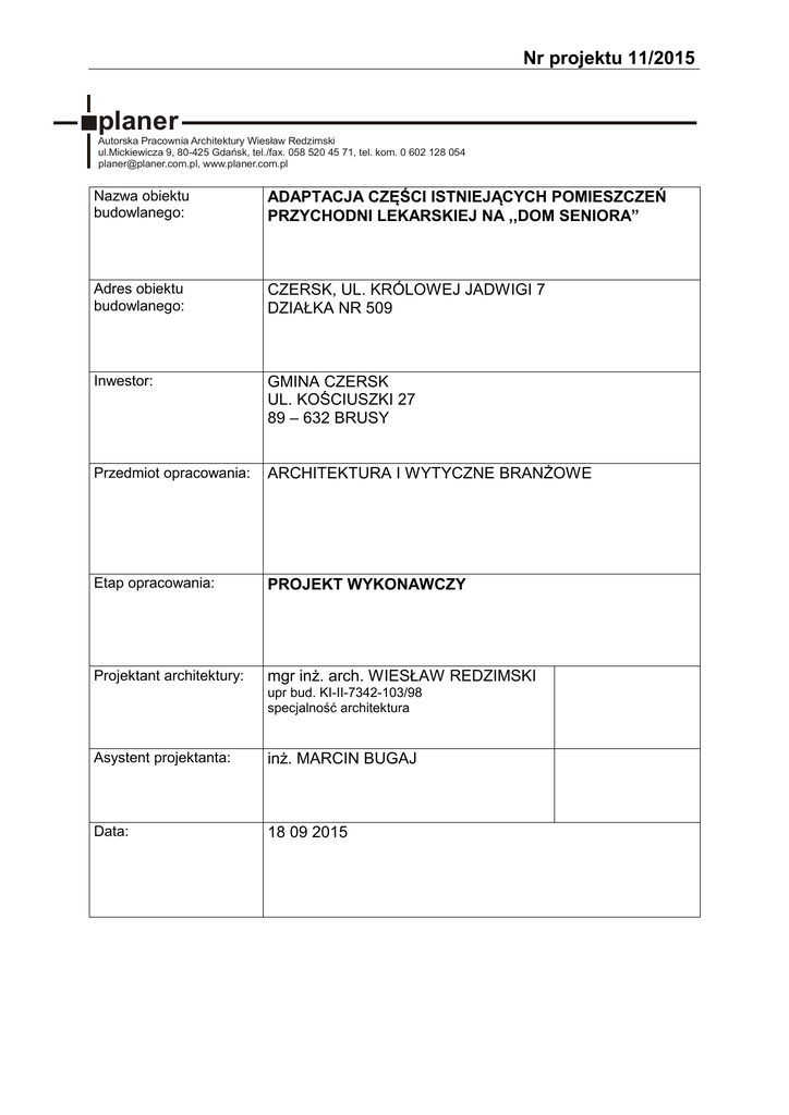 Nr projektu 11/2015 planer Autorska Pracownia Architektury Wiesław Redzimski ul.Mickiewicza 9, 80-425 Gdańsk, tel./fax. 058 520 45 71, tel. kom. 0 602 128 054 [email protected], www.planer.com.pl Nazwa obiektu budowlanego: ADAPTACJA CZĘŚCI ISTNIEJĄCYCH POMIESZCZEŃ PRZYCHODNI LEKARSKIEJ NA ,,DOM SENIORA” Adres obiektu budowlanego: CZERSK, UL. KRÓLOWEJ JADWIGI 7 DZIAŁKA NR 509 Inwestor: GMINA CZERSK UL. KOŚCIUSZKI 27 89 – 632 BRUSY Przedmiot opracowania: ARCHITEKTURA I WYTYCZNE BRANŻOWE Etap opracowania: PROJEKT WYKONAWCZY Projektant architektury: mgr inż. arch. WIESŁAW REDZIMSKI upr bud. KI-II-7342-103/98 specjalność architektura Asystent projektanta: inż. MARCIN BUGAJ Data: 18 09 2015 Adaptacja części istniejących pomieszczeń przychodni lekarskiej na Dom Seniora, Czersk, ul.Królowej Jadwigi 7, działka nr 509 SPIS ZAWARTOŚCI PROJEKTU str. I. CZĘŚĆ OPISOWA 1. 2. 3. Strona tytułowa Spis zawartości projektu Opis techniczny II. CZĘŚĆ RYSUNKOWA Rys. IN-01 Rys. A-01 Rys. S9 Rzut piwnicy – inwentaryzacja skala 1:100 Rzut piwnicy - projekt skala 1:100 Rzut piwnic – instalacja c.o. skala 1:100 (fragment dokumentacji projektowej nr 34/2008 (0910H.iw) z dnia 30 X 2009 wykonanej przez APA PLANER Wiesław Redzimski) PLANER Autorska Pracownia Architektury Wiesław Redzimski, ul.Mickiewicza 9, 80-425 Gdańsk, tel/fax. 058 520 45 71 Adaptacja części istniejących pomieszczeń przychodni lekarskiej na Dom Seniora, Czersk, ul.Królowej Jadwigi 7, działka nr 509 OPIS TECHNICZNY 1. PRZEDMIOT OPRACOWANIA Przedmiotem niniejszego opracowania jest dokumentacja projektowa dotycząca robót budowlanych związanych z adaptacją części istniejących pomieszczeń w budynku przychodni lekarskiej w Czersku na Dom Seniora. Adaptowane będą wszystkie pomieszczenia po byłym pogotowiu oraz dodatkowo 2 pomieszczenia z poza lokalu ,,starego pogotowia”. 2. LOKALIZACJA Budynek zlokalizowany jest na działce nr 509 położonej w Czersku przy ul.Królowej Jadwigi 7. Przedmiotowe pomieszczenia znajdują się na 1 kondygnacji nadziemnej (kondygnacja piwniczna). 3. OPIS BUDYNKU Przychodnia lekarska zlokalizowana jest w trzech połączonych ze sobą budynkach – budynek starszy, łącznik i budynek nowszy. Przedmiotem niniejszego opracowania jest pierwsza kondygnacja nadziemna (piwniczna) budynku nowszego. Budynek trójkondygnacyjny w całości podpiwniczony, wykonany w technologii tradycyjnej. Ściany kondygnacji murowane z cegły ceramicznej, wszystkie stropy żelbetowe (płyty kanałowe). Dach dwuspadowy kryty blachodachówką. Budynek o prostej bryle. Wejście do kondygnacji piwnicznej znajduje się od strony elewacji wschodniej. Część objęta niniejszym opracowaniem wyposażona jest w instalację wody zimnej, kanalizacji sanitarnej, c.o., elektrycznej, teleinformatycznej. Woda ciepła z bojlera. C.o. z kotłowni na paliwo gazowe. Podłogi w piwnicy wykończone gresem, terakotą, wykładziną (zgodnie z częścią graficzną). 4. ZAŁOŻENIA FUNKCJONALNO–PRZESTRZENNE Projekt zakłada adaptację pomieszczeń po byłym pogotowiu na pomieszczenia „Domu seniora” w skład których będą wchodzić: • pomieszczenie ogólnodostępne z aneksem kuchennym, • pomieszczenie do zwiększenia aktywności • pomieszczenie odpoczynku • pomieszczenie do prasowania i porządkowe • pomieszczenie klubowe • pomieszczenie do terapii indywidualnej • pomieszczenie dla pielęgniarek • szatnia • wc • komunikacja PLANER Autorska Pracownia Architektury Wiesław Redzimski, ul.Mickiewicza 9, 80-425 Gdańsk, tel/fax. 058 520 45 71 Adaptacja części istniejących pomieszczeń przychodni lekarskiej na Dom Seniora, Czersk, ul.Królowej Jadwigi 7, działka nr 509 Adaptacja będzie wymagała przeprowadzenia następujących robót budowlanych: 1) przygotowawcze 2) rozbiórkowe 3) murarskie 4) montaż ścian w suchej zabudowie z płyt gkb 5) tynkarskie 6) instalacyjne 7) związane z montażem stolarki drzwiowej wewnętrznej 8) wykończeniowe 9) związane z instalacją wyposażenia 5. OPIS BUDOWLANY 5.1. Roboty przygotowawcze: ― przygotowanie ścian do malowania, ― w pomieszczeniach dodatkowych głuche i luźne tynki ścienne i sufitowe należy skuć, ― luźne posadzki należy odspoić i na nowo przykleić (luźne płytki terakoty/gresu) ― istniejące posadzki i podkłady, które będą wymienianie należy skuć 5.2. Roboty rozbiórkowe ― rozbiórki ścian działowych ― rozbiórka przejść w ścianach nośnych, dla rozbiórek w ścianach nośnych należy zainstalować nadproża stalowe nad drzwiami/przejściem ― rozbiórka progu na posadzce w którym przebiega trasa instalacji c.o. (pomieszczenie do zwiększania aktywności ruchowej 1.06, część korytarza 1.05, część pomieszczeniach 1.07 i pomieszczenia 1.08) ― rozbiórka okładzin ściennych ceramicznych (glazura) oraz okładzin ceramicznych podłogowych (terakota) w pomieszczeniu 1.08 (projekt) 5.3. Roboty murarskie Wszystkie ściany wewnętrzne oraz obudowy pionów kanalizacyjnych i innych „wystających elementów” ze ścian i sufitu wykonać w systemie suchej zabudowy z płyt gr. 12.5mm na stelażu stalowym. Nowe ściany oraz zabudowanie istniejących otworów o gr. 12, 25 i 38cm, wytyczne dla ścian i obudów: ― opłytowanie mocowane do stelaży stalowych C100 ― w przestrzeni stelaży stalowych należy wykonać izolację z wełny mineralnej min.10cm zabezpieczoną obustronnie paraizolacją ― należy stosować systemowe izolacje akustyczne ― opłytowanie ścian pod glazurę należy wykonać z 2x 12.5mm płyta GKBI Ściana zewnętrzna – zamurowania z bloczków gazobetonowych na gr. 30cm. – zamurowanie po demontażu istniejących drzwi (nowe okno w aneksie kuchennym) PLANER Autorska Pracownia Architektury Wiesław Redzimski, ul.Mickiewicza 9, 80-425 Gdańsk, tel/fax. 058 520 45 71 Adaptacja części istniejących pomieszczeń przychodni lekarskiej na Dom Seniora, Czersk, ul.Królowej Jadwigi 7, działka