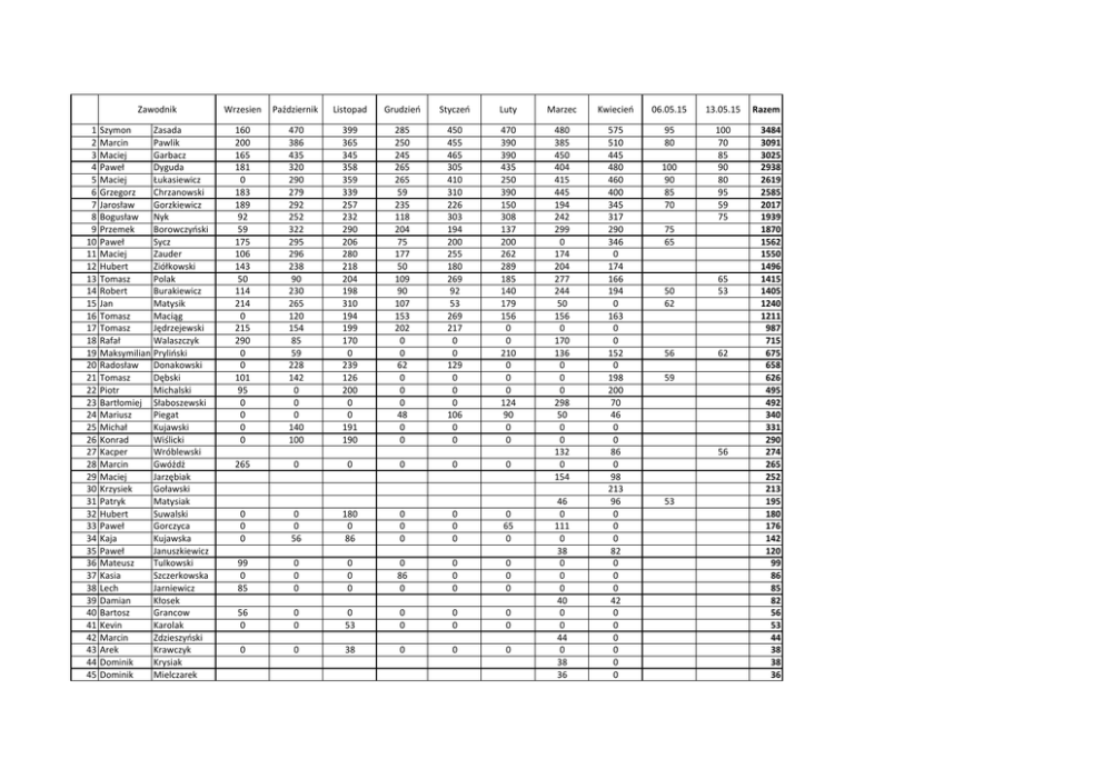 1 2 3 4 5 6 7 8 9 10 11 12 13 14 15 16 17 18 19 20 21 22 23 24 25 26 27 28 29 30 31 32 33 34 35 36 37 38 39 40 41 42 43 44 45 Zawodnik Wrzesien Październik Listopad Grudzień Styczeń Luty Marzec Kwiecień 06.05.15 13.05.15 Szymon Zasada Marcin Pawlik Maciej Garbacz Paweł Dyguda Maciej Łukasiewicz Grzegorz Chrzanowski Jarosław Gorzkiewicz Bogusław Nyk Przemek Borowczyński Paweł Sycz Maciej Zauder Hubert Ziółkowski Tomasz Polak Robert Burakiewicz Jan Matysik Tomasz Maciąg Tomasz Jędrzejewski Rafał Walaszczyk Maksymilian Pryliński Radosław Donakowski Tomasz Dębski Piotr Michalski Bartłomiej Słaboszewski Mariusz Piegat Michał Kujawski Konrad Wiślicki Kacper Wróblewski Marcin Gwóźdź Maciej Jarzębiak Krzysiek Goławski Patryk Matysiak Hubert Suwalski Paweł Gorczyca Kaja Kujawska Paweł Januszkiewicz Mateusz Tulkowski Kasia Szczerkowska Lech Jarniewicz Damian Kłosek Bartosz Grancow Kevin Karolak Marcin Zdzieszyński Arek Krawczyk Dominik Krysiak Dominik Mielczarek 160 200 165 181 0 183 189 92 59 175 106 143 50 114 214 0 215 290 0 0 101 95 0 0 0 0 470 386 435 320 290 279 292 252 322 295 296 238 90 230 265 120 154 85 59 228 142 0 0 0 140 100 399 365 345 358 359 339 257 232 290 206 280 218 204 198 310 194 199 170 0 239 126 200 0 0 191 190 285 250 245 265 265 59 235 118 204 75 177 50 109 90 107 153 202 0 0 62 0 0 0 48 0 0 450 455 465 305 410 310 226 303 194 200 255 180 269 92 53 269 217 0 0 129 0 0 0 106 0 0 470 390 390 435 250 390 150 308 137 200 262 289 185 140 179 156 0 0 210 0 0 0 124 90 0 0 100 70 85 90 80 95 59 75 0 0 0 0 0 0 0 0 0 0 56 180 0 86 0 0 0 0 0 0 0 65 0 99 0 85 0 0 0 0 0 0 0 86 0 0 0 0 0 0 0 56 0 0 0 0 53 0 0 0 0 0 0 0 0 38 0 0 0 575 510 445 480 460 400 345 317 290 346 0 174 166 194 0 163 0 0 152 0 198 200 70 46 0 0 86 0 98 213 96 0 0 0 82 0 0 0 42 0 0 0 0 0 0 95 80 265 480 385 450 404 415 445 194 242 299 0 174 204 277 244 50 156 0 170 136 0 0 0 298 50 0 0 132 0 154 46 0 111 0 38 0 0 0 40 0 0 44 0 38 36 100 90 85 70 75 65 50 62 56 65 53 62 59 56 53 Razem 3484 3091 3025 2938 2619 2585 2017 1939 1870 1562 1550 1496 1415 1405 1240 1211 987 715 675 658 626 495 492 340 331 290 274 265 252 213 195 180 176 142 120 99 86 85 82 56 53 44 38 38 36