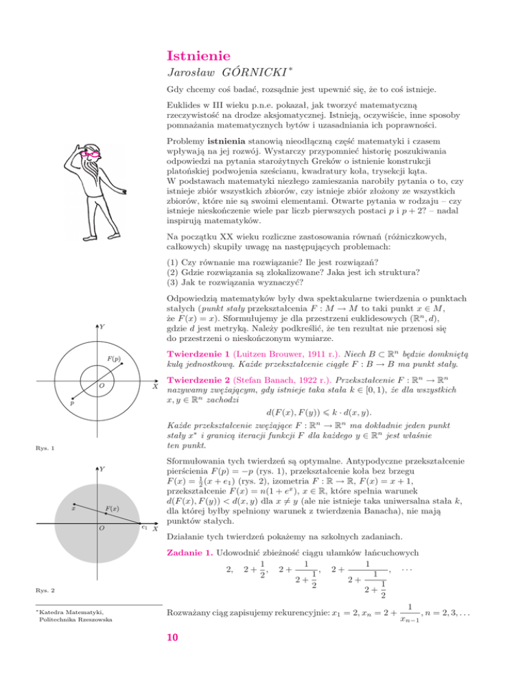 Istnienie Jarosław GÓRNICKI * Gdy chcemy coś badać, rozsądnie jest upewnić się, że to coś istnieje. Euklides w III wieku p.n.e. pokazał, jak tworzyć matematyczną rzeczywistość na drodze aksjomatycznej. Istnieją, oczywiście, inne sposoby pomnażania matematycznych bytów i uzasadniania ich poprawności. Problemy istnienia stanowią nieodłączną część matematyki i czasem wpływają na jej rozwój. Wystarczy przypomnieć historię poszukiwania odpowiedzi na pytania starożytnych Greków o istnienie konstrukcji platońskiej podwojenia sześcianu, kwadratury koła, trysekcji kąta. W podstawach matematyki niezłego zamieszania narobiły pytania o to, czy istnieje zbiór wszystkich zbiorów, czy istnieje zbiór złożony ze wszystkich zbiorów, które nie są swoimi elementami. Otwarte pytania w rodzaju – czy istnieje nieskończenie wiele par liczb pierwszych postaci p i p + 2? – nadal inspirują matematyków. Na początku XX wieku rozliczne zastosowania równań (różniczkowych, całkowych) skupiły uwagę na następujących problemach: (1) Czy równanie ma rozwiązanie? Ile jest rozwiązań? (2) Gdzie rozwiązania są zlokalizowane? Jaka jest ich struktura? (3) Jak te rozwiązania wyznaczyć? Odpowiedzią matematyków były dwa spektakularne twierdzenia o punktach stałych (punkt stały przekształcenia F : M → M to taki punkt x ∈ M , że F (x) = x). Sformułujemy je dla przestrzeni euklidesowych (Rn , d), gdzie d jest metryką. Należy podkreślić, że ten rezultat nie przenosi się do przestrzeni o nieskończonym wymiarze. Twierdzenie 1 (Luitzen Brouwer, 1911 r.). Niech B ⊂ Rn będzie domkniętą kulą jednostkową. Każde przekształcenie ciągłe F : B → B ma punkt stały. Twierdzenie 2 (Stefan Banach, 1922 r.). Przekształcenie F : Rn → Rn nazywamy zwężającym, gdy istnieje taka stała k ∈ [0, 1), że dla wszystkich x, y ∈ Rn zachodzi d(F (x), F (y)) ¬ k · d(x, y). Rys. 1 Każde przekształcenie zwężające F : Rn → Rn ma dokładnie jeden punkt stały x∗ i granicą iteracji funkcji F dla każdego y ∈ Rn jest właśnie ten punkt. Sformułowania tych twierdzeń są optymalne. Antypodyczne przekształcenie pierścienia F (p) = −p (rys. 1), przekształcenie koła bez brzegu F (x) = 12 (x + e1 ) (rys. 2), izometria F : R → R, F (x) = x + 1, przekształcenie F (x) = n(1 + ex ), x ∈ R, które spełnia warunek d(F (x), F (y)) < d(x, y) dla x 6= y (ale nie istnieje taka uniwersalna stała k, dla której byłby spełniony warunek z twierdzenia Banacha), nie mają punktów stałych. Działanie tych twierdzeń pokażemy na szkolnych zadaniach. Rys. 2 ∗ Katedra Matematyki, Politechnika Rzeszowska Zadanie 1. Udowodnić zbieżność ciągu ułamków łańcuchowych 1 1 1 2, 2 + , 2 + , ··· , 2+ 1 1 2 2+ 2+ 1 2 2+ 2 1 , n = 2, 3, . . . Rozważany ciąg zapisujemy rekurencyjnie: x1 = 2, xn = 2 + xn−1 10 Z oszacowań x1 ¬ 52 , x2 ¬ 5 2 oraz z warunku 1 , n = 3, 4, . . . , xn = 2 + 1 2+ xn−2 5 wynika, że 2 ¬ xn ¬ 2 dla każdego n = 1, 2, . . . Ponieważ przekształcenie F (x) = 2 + x1 odwzorowuje przedział [2, 52 ] w siebie i jest zwężające, 1 1 1 1 |F (x) − F (y)| = − = |x − y| ¬ |x − y|, x y |xy| 4 więc na podstawie twierdzenia Banacha F ma dokładnie jeden punkt stały 1 , n 2. Rozwiązując x∗ = limn→∞ xn , gdzie xn = F (xn−1 ) = 2 + xn−1 √ 1 ∗ ∗ równanie x = 2 + x∗ , otrzymujemy x = 1 + 2. Uwaga. Każda liczba niewymierna ma dokładnie jedno rozwinięcie na ułamek łańcuchowy arytmetyczny (wszystkie liczniki są równe 1) nieskończony: 1 a0 + =: a0 + 1/a1 + 1/a2 + 1/ . . . 1 a1 + 1 a2 + ... Leonhard Euler wykazał, że e = 2 + 1/1 + 1/2 + 1/1 + 1/1 + 1/4 + 1/1 + . . . + 1/1 + 1/2k + 1/1 + / . . . Dla liczby π takie rozwinięcie nie jest znane! Wiadomo jedynie, jaka jest wartość ak dla k ¬ 5 821 569 425 (Eric Weisstein, 2011 r.): π = 3 + 1/7 + 1/15 + 1/1 + 1/292 + 1/1 + 1/1 + 1/2 + 1/3 + 1/1 + 1/14 + / . . . Od wiedzy, że „coś” istnieje, do wiedzy, jak to „coś” wygląda, droga czasem jest bardzo długa (jeśli w ogóle można ją przebyć). Zadanie 2. Na płaszczyźnie euklidesowej danych jest n 2 prostych l1 , l2 , . . . , ln . Niech A1 ∈ l1 . Rzut prostopadły punktu A1 na prostą l2 wyznacza punkt A2 ∈ l2 , rzut prostopadły punktu A2 na prostą l2 wyznacza punkt A3 ∈ l3 , itd. Rzut prostopadły punktu An ∈ ln na prostą l1 wyznacza punkt An+1 ∈ l1 . Czy istnieje taki punkt A1 ∈ l1 , że A1 = An+1 ? Rys. 3 Jeśli proste l1 , l2 , . . . , ln są równoległe, to każdy punkt A1 ∈ l1 spełnia warunki zadania. Gdy istnieje para kolejnych prostych lk i lk+1 , które nie są równoległe, to rzutowanie prostopadłe lk na lk+1 jest przekształceniem zwężającym (rys. 3) |P (a) − P (b)| = |a − b| · cos α. W tym przypadku przekształcenie F : l1 → l1 , opisane w zadaniu, jest zwężające ze stałą k = cos γ, gdzie γ ∈ 0, π2 jest miarą jednego z kątów między dwiema kolejnymi nierównoległymi prostymi. Zatem na podstawie twierdzenia Banacha istnieje taki punkt A1 ∈ l1 , że A1 = An+1 . Kolejne zadanie jest (chyba?) trudniejsze. Skoro łatwo wskazać przekształcenie ciągłe koła z dziurą (pierścienia) na siebie bez punktu stałego, to dla koła z większą liczbą dziur. . . Zadanie 3. Niech Dn oznacza figurę domkniętą otrzymaną z koła, w którym zrobiono n 2 dziur (rys. 4). Wskazać przekształcenie ciągłe zbioru Dn na siebie bez punktu stałego. Rys. 4 Rozwiązanie jest na odwrocie tej kartki, ale najpierw spróbuj rozwiązać je sam. ∗ ∗ ∗ Zastosowania twierdzeń Brouwera i Banacha w zaawansowanych działach matematyki, m.in. w teorii równań różniczkowych, całkowych, przyczyniły się do pojawienia się kolejnych wyników Juliusza Schaudera, Solomona Lefschetza, Karola Borsuka i wielu innych. Doprowadziło to do powstania użytecznej teorii punktów stałych, na którą dzisiaj można patrzeć z topologicznego lub metrycznego