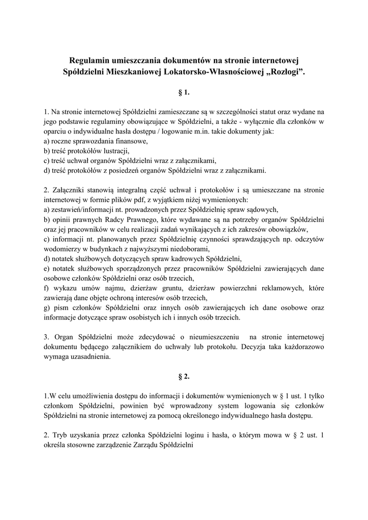 Regulamin umieszczania dokumentów na stronie internetowej Spółdzielni Mieszkaniowej Lokatorsko-Własnościowej „Rozłogi”. § 1. 1. Na stronie internetowej Spółdzielni zamieszczane są w szczególności statut oraz wydane na jego podstawie regulaminy obowiązujące w Spółdzielni, a także - wyłącznie dla członków w oparciu o indywidualne hasła dostępu / logowanie m.in. takie dokumenty jak: a) roczne sprawozdania finansowe, b) treść protokółów lustracji, c) treść uchwał organów Spółdzielni wraz z załącznikami, d) treść protokółów z posiedzeń organów Spółdzielni wraz z załącznikami. 2. Załączniki stanowią integralną część uchwał i protokołów i są umieszczane na stronie internetowej w formie plików pdf, z wyjątkiem niżej wymienionych: a) zestawień/informacji nt. prowadzonych przez Spółdzielnię spraw sądowych, b) opinii prawnych Radcy Prawnego, które wydawane są na potrzeby organów Spółdzielni oraz jej pracowników w celu realizacji zadań wynikających z ich zakresów obowiązków, c) informacji nt. planowanych przez Spółdzielnię czynności sprawdzających np. odczytów wodomierzy w budynkach z najwyższymi niedoborami, d) notatek służbowych dotyczących spraw kadrowych Spółdzielni, e) notatek służbowych sporządzonych przez pracowników Spółdzielni zawierających dane osobowe członków Spółdzielni oraz osób trzecich, f) wykazu umów najmu, dzierżaw gruntu, dzierżaw powierzchni reklamowych, które zawierają dane objęte ochroną interesów osób trzecich, g) pism członków Spółdzielni oraz innych osób zawierających ich dane osobowe oraz informacje dotyczące spraw osobistych ich i innych osób trzecich. 3. Organ Spółdzielni może zdecydować o nieumieszczeniu na stronie internetowej dokumentu będącego załącznikiem do uchwały lub protokołu. Decyzja taka każdorazowo wymaga uzasadnienia. § 2. 1.W celu umożliwienia dostępu do informacji i dokumentów wymienionych w § 1 ust. 1 tylko członkom Spółdzielni, powinien być wprowadzony system logowania się członków Spółdzielni na stronie internetowej za pomocą określonego indywidualnego hasła dostępu. 2. Tryb uzyskania przez członka Spółdzielni loginu i hasła, o którym mowa w § 2 ust. 1 określa stosowne zarządzenie Zarządu Spółdzielni § 3. Spółdzielnia, z powodu interesów osób trzecich oraz ochrony danych osobowych nie ujawnia danych osobowych członków Spółdzielni lub osób posiadających tytuł prawny do lokalu, zawartych w uchwałach organów Spółdzielni, protokołach z posiedzeń organów Spółdzielni oraz sporządzonych do nich załącznikach. § 4. Za obsługę strony internetowej odpowiada Zarząd Spółdzielni SML-W „Rozłogi”. § 5. Regulamin wchodzi w życie z dniem 1 lipca 2013 roku. Regulamin został uchwalony Uchwałą Rady Nadzorczej nr 14/2013 z dnia 04.06.2013 r.