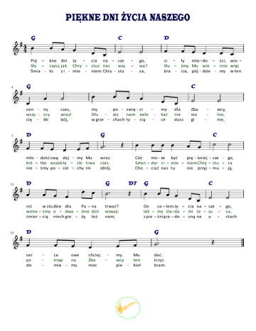 PIĘKNE DNI ŻYCIA NASZEGO G C 4 4 D sze wzy stu go, wa? sa, si Słu bra ły mlo do żmy Mu wie cia, pój dzie ści, wio rnie więc my w ten Pię Sły Śmia kne dni szysz, jak ło zi ży Chry mie cia na stus nas niem Chry G 4 C sen wszy cię ny scy żki czas, wraz! bój, my Dłu w grze D 7 mło kró nie po swię ci żej nam zwle chach ty sią my kać ce dla nie dusz Zba wo gi wcy, lno, nie, G dość swą daj tko wszak ła śmy po cie C my Mu ski trwa chy im wraz. czas. zdrój. D 11 Cóż Sztan Cho mo że być dar z i mie ciaż nas tu pię kniej niem Chry nie przyj G D7 G sze stu mu go, sa ją, C niż wznie śmier w słu żbie dla śmy o dwa cią niech gro Pa na żnie dziś żą też trwać? wzwyż; nam, On Idź z pie D 15 ce lem ży my śla da śnią ra do cia na mi Je sną na sze zu u go, sa, stach G ser pa zła ce trząc mie swe na my chciej Zba moc my wcy pie Mu ten kieł dać. krzyż. bram. C