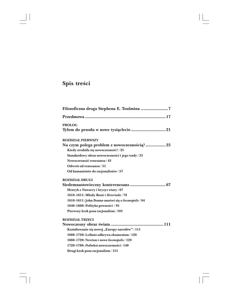 Spis treœci Filozoficzna droga Stephena E. Toulmina ........................ 7 Przedmowa ........................................................................ 17 PROLOG Ty³em do przodu w nowe tysi¹clecie ............................... 21 ROZDZIA£ PIERWSZY Na czym polega problem z nowoczesnoœci¹? .................. 25 Kiedy zrodzi³a siê nowoczesnoœæ? / 25 Standardowy obraz nowoczesnoœci i jego wady / 33 Nowoczesnoœæ renesansu / 43 Odwrót od renesansu / 51 Od humanistów do racjonalistów / 57 ROZDZIA£ DRUGI Siedemnastowieczny kontrrenesans ................................ 67 Henryk z Nawarry i kryzys wiary / 67 1610 - 1611: M³ody René i Henriada / 78 1610 - 1611: John Donne martwi siê o kosmopolis / 84 1640 - 1660: Polityka pewnoœci / 91 Pierwszy krok poza racjonalizm / 103 ROZDZIA£ TRZECI Nowoczesny obraz œwiata ............................................... 111 Kszta³towanie siê nowej „Europy narodów” / 111 1660 - 1720: Leibniz odkrywa ekumenizm / 120 1660 - 1720: Newton i nowe kosmopolis / 128 1720 - 1780: Podtekst nowoczesnoœci / 140 Drugi krok poza racjonalizm / 151 ROZDZIA£ CZWARTY Na drugim krañcu nowoczesnoœci ................................ 161 Czas suwerennych narodów / 161 1750 - 1914: Rozbiórka rusztowania / 167 1920 - 1960: Re-renesans od³o¿ony na póŸniej / 174 1965 - 1975: Humanizm na nowo odkryty / 182 BliŸniacze trajektorie nowoczesnoœci / 190 ROZDZIA£ PI¥TY Droga przed nami ........................................................... 198 Mit czystej tablicy / 198 Humanizacja nowoczesnoœci / 203 Powrót filozofii praktycznej / 209 Od Lewiatana do Liliputu / 215 Racjonalnoœæ a rozumnoœæ / 221 EPILOG Wychodz¹c ku przysz³oœci .............................................. 226 Uwagi bibliograficzne .................................................... 233 T³o ogólne / 233 Kartezjusz i Henryk z Nawarry / 234 Przypisy i bibliografia / 235 Indeks .............................................................................. 244