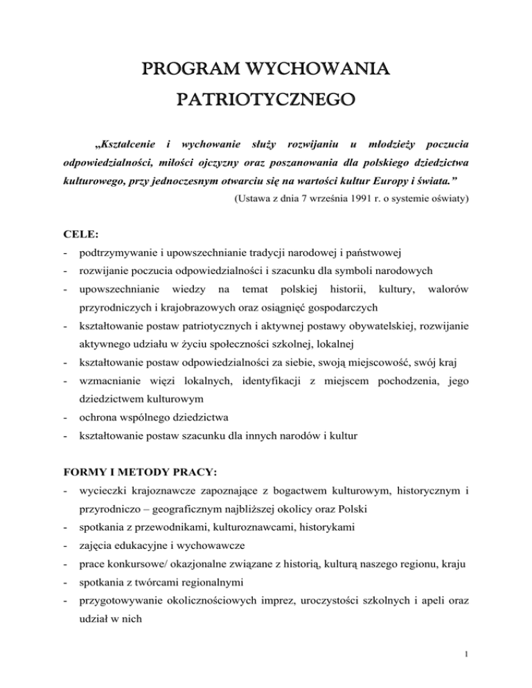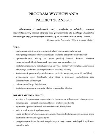PROGRAM WYCHOWANIA PATRIOTYCZNEGO „Kształcenie i wychowanie służy rozwijaniu u młodzieży poczucia odpowiedzialności, miłości ojczyzny oraz poszanowania dla polskiego dziedzictwa kulturowego, przy jednoczesnym otwarciu się na wartości kultur Europy i świata.” (Ustawa z dnia 7 września 1991 r. o systemie oświaty) CELE: - podtrzymywanie i upowszechnianie tradycji narodowej i państwowej - rozwijanie poczucia odpowiedzialności i szacunku dla symboli narodowych - upowszechnianie wiedzy na temat polskiej historii, kultury, walorów przyrodniczych i krajobrazowych oraz osiągnięć gospodarczych - kształtowanie postaw patriotycznych i aktywnej postawy obywatelskiej, rozwijanie aktywnego udziału w życiu społeczności szkolnej, lokalnej - kształtowanie postaw odpowiedzialności za siebie, swoją miejscowość, swój kraj - wzmacnianie więzi lokalnych, identyfikacji z miejscem pochodzenia, jego dziedzictwem kulturowym - ochrona wspólnego dziedzictwa - kształtowanie postaw szacunku dla innych narodów i kultur FORMY I METODY PRACY: - wycieczki krajoznawcze zapoznające z bogactwem kulturowym, historycznym i przyrodniczo – geograficznym najbliższej okolicy oraz Polski - spotkania z przewodnikami, kulturoznawcami, historykami - zajęcia edukacyjne i wychowawcze - prace konkursowe/ okazjonalne związane z historią, kulturą naszego regionu, kraju - spotkania z twórcami regionalnymi - przygotowywanie okolicznościowych imprez, uroczystości szkolnych i apeli oraz udział w nich 1 - zajęcia kultywujące tradycje regionalne, narodowe - odwiedzanie, dbanie o lokalne miejsca pamięci narodowej - kronika i strona internetowa szkoły TEMATYKA: - wielcy Polacy - znani z naszego regionu - pamiątki przeszłości w naszej okolicy, w Polsce - święto Patrona szkoły - tradycje, zwyczaje, obrzędy - Sanok – mieszanka wielu kultur - piękno ziemi sanockiej, regionu, ojczyzny - ważne daty z historii Polski (1.09, 17.09, 11.11, 3.05) - symbole narodowe PRZEWIDYWANE OSIĄGNIĘCIA: - znajomość i szacunek względem symboli narodowych - prezentowanie odpowiedniego, godnego zachowania w czasie uroczystości szkolnych, państwowych - pogłębienie wiedzy dotyczącej historii, kultury, przyrody, geografii rejonu, kraju - ukształtowanie świadomości tożsamości narodowej 2