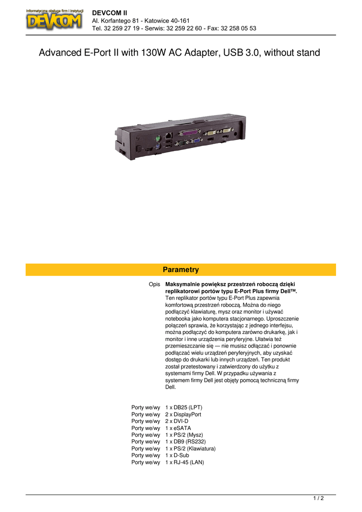 DEVCOM II Al. Korfantego 81 - Katowice 40-161 Tel. 32 259 27 19 - Serwis: 32 259 22 60 - Fax: 32 258 05 53 Advanced E-Port II with 130W AC Adapter, USB 3.0, without stand Parametry Opis Maksymalnie powiększ przestrzeń roboczą dzięki replikatorowi portów typu E-Port Plus firmy Dell™. Ten replikator portów typu E-Port Plus zapewnia komfortową przestrzeń roboczą. Można do niego podłączyć klawiaturę, mysz oraz monitor i używać notebooka jako komputera stacjonarnego. Uproszczenie połączeń sprawia, że korzystając z jednego interfejsu, można podłączyć do komputera zarówno drukarkę, jak i monitor i inne urządzenia peryferyjne. Ułatwia też przemieszczanie się — nie musisz odłączać i ponownie podłączać wielu urządzeń peryferyjnych, aby uzyskać dostęp do drukarki lub innych urządzeń. Ten produkt został przetestowany i zatwierdzony do użytku z systemami firmy Dell. W przypadku używania z systemem firmy Dell jest objęty pomocą techniczną firmy Dell. Porty we/wy Porty we/wy Porty we/wy Porty we/wy Porty we/wy Porty we/wy Porty we/wy Porty we/wy Porty we/wy 1 x DB25 (LPT) 2 x DisplayPort 2 x DVI-D 1 x eSATA 1 x PS/2 (Mysz) 1 x DB9 (RS232) 1 x PS/2 (Klawiatura) 1 x D-Sub 1 x RJ-45 (LAN) 1/2 DEVCOM II Al. Korfantego 81 - Katowice 40-161 Tel. 32 259 27 19 - Serwis: 32 259 22 60 - Fax: 32 258 05 53 Porty we/wy Porty we/wy Porty we/wy Porty we/wy Pasuje do 1 x 3,5 mm minijack (Słuchawki) 1 x 3,5 mm minijack (Mikrofon) 1 x USB 2.0 Type A 2 x USB 3.0 Type A - Latitude 2120 - Latitude E5420 - Latitude E5430 - Latitude E5520 - Latitude E5530 - Latitude E6230 - Latitude E6320 - Latitude E6330 - Latitude E6420 - Latitude E6420 XFR - Latitude E6430 - Latitude E6430 ATG - Latitude E6430s - Latitude E6520 - Latitude E6530 - Latitude ST - Latitude XT3 - Latitude E5270 - Latitude E5470 - Latitude E5570 - Latitude E7270 - Latitude E7470 Akcesoria w zestawie - Stacja dokująca - Zasilacz Kolor Czarny Wymiary 288 x 170 x 53.7 mm Waga 1.05 Pozostałe parametry - Napięcie wejściowe 100-240 V - Częstotliwość 50/60 Hz - Pobór mocy 130 W - Wskaźniki LED - Zgodność z dyrektywą RoHS 2/2 Powered by TCPDF (www.tcpdf.org)