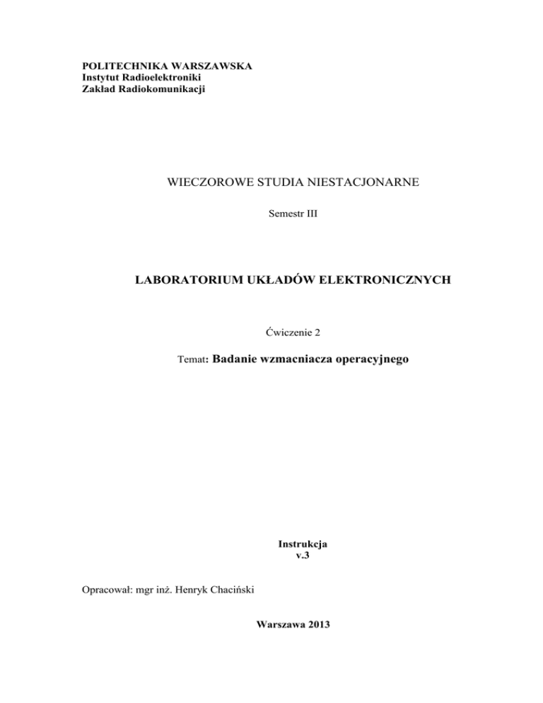POLITECHNIKA WARSZAWSKA Instytut Radioelektroniki Zakład Radiokomunikacji WIECZOROWE STUDIA NIESTACJONARNE Semestr III LABORATORIUM UKŁADÓW ELEKTRONICZNYCH Ćwiczenie 2 Temat: Badanie wzmacniacza operacyjnego Instrukcja v.3 Opracował: mgr inŜ. Henryk Chaciński Warszawa 2013 Badanie wzmacniacza operacyjnego 1. Cel ćwiczenia Celem ćwiczenia jest zapoznanie słuchaczy z budową i właściwościami wzmacniacza operacyjnego. Zapoznanie się z wpływem poszczególnych elementów wzmacniacza na jego parametry oraz pomiar tychŜe parametrów. 2. Wymagane wiadomości Wymagane są następujące wiadomości: - zasada działania wzmacniacza operacyjnego, - znajomość parametrów wzmacniacza, - znajomość właściwości podstawowych układów pracy wzmacniacza. 3. Podstawy teoretyczne 3.1. Wstęp ogólny Wzmacniacz operacyjny jest analogowym układem scalonym o sprzęŜeniach bezpośrednich. Charakteryzuje się bardzo duŜym wzmocnieniem. Najczęściej przeznaczony jest do pracy z zewnętrznym obwodem sprzęŜenia zwrotnego. Właściwości obwodu sprzęŜenia zwrotnego mają decydujący wpływ na właściwości całego układu. Większość wzmacniaczy operacyjnych ma symetryczne (róŜnicowe) wejścia i niesymetryczne wyjście. Na rys. 1a przedstawiono symbol wzmacniacza operacyjnego, natomiast na rys. 1b przedstawiono jego schemat zastępczy. a) we- - we+ + wy b) + UI2 Ud R Id Au U d + - UO + U I1 - - Rys. 1. Wzmacniacz operacyjny a) symbol wzmacniacza, b) schemat zastępczy. 2 Badanie wzmacniacza operacyjnego Przedstawiony wzmacniacz ma dwa wejścia: wejście „+”, które nosi nazwę wejście nieodwracające, wejście „–” wejście odwracające. Sygnał wejściowy doprowadzony do wejścia „+” i „–” wzmacniacza operacyjnego jest nazwany sygnałem róŜnicowym. Napięcie wyjściowe wzmacniacza operacyjnego jest proporcjonalne do wartości sygnału róŜnicowego, czyli do róŜnicy napięć na wejściu „+” i na wejściu „–”. Wzmacniacz operacyjny charakteryzuje się następującymi parametrami: - wzmocnienie przy otwartej pętli sprzęŜenia zwrotnego, - napięcie niezrównowaŜenia, - wejściowe prądy polaryzacyjne, - współczynnik tłumienia sygnału współbieŜnego (CMRR), - szybkość zmian napięcia wyjściowego, - maksymalne pasmo przenoszonych częstotliwości, - rezystancja wejściowa, - maksymalny zakres zmian napięcia na wejściu, - maksymalny zakres zmian napięcia na wyjściu, Wzmacniacze operacyjne są stosowane przede wszystkim w układach z zewnętrznym ujemnym sprzęŜeniem zwrotnym. Ujemne sprzęŜenie zwrotne polepsza właściwości wzmacniacza, między innymi: - poszerza pasmo przenoszonych częstotliwości, - zmniejsza nieliniowości charakterystyki wzmocnienia, - zmniejsza wpływ napięcia i prądu niezrównowaŜenia, - poprawia stałość parametrów, - umoŜliwia dobór wzmocnienia. Pole wzmocnienia fT wzmacniacza operacyjnego moŜna obliczyć ze wzoru: fT = fg kuo) gdzie: kuo – wzmocnienie wzmacniacza dla częstotliwości zerowej fg – częstotliwość dla której wartość wzmocnienia wzmacniacza zmniejsza się o 3 dB ZaleŜność pomiędzy polem wzmocnienia fT wzmacniacza a górną częstotliwością graniczną fgf wzmacniacza z zamkniętą pętlą sprzęŜenia zwrotnego dla wzmacniacza odwracającego jest określona wzorem fgf = fT /(1 + |kuf|) gdzie: kuf – wzmocnienie wzmacniacza z zamkniętą pętlą sprzęŜenia zwrotnego, |kuf| = R2/ R1 gdzie: = R1, R2 – rezystory w obwodzie sprzęŜenia zwrotnego (patrz rys.4.1.) Dla wzmacniacza nieodwracającego zaleŜność pomiędzy polem wzmocnienia fT wzmacniacza a górną częstotliwością graniczną fgf wzmacniacza z zamkniętą pętlą sprzęŜenia zwrotnego jest określona wzorem fgf = fT / |kuf| gdzie: kuf – wzmocnienie wzmacniacza z zamkniętą pętlą sprzęŜenia zwrotnego, |kuf| = (R2/ R1 ) +1 3 Badanie wzmacniacza operacyjnego 4. Przykładowe pytania Warunkiem dopuszczenia do realizacji ćwiczenia jest pozytywne zaliczenie sprawdzianu wejściowego. PoniŜej podano przykładowe zagadnienia na sprawdzianie wejściowym: 1. Podać określenie prąd niezrównowaŜenia. 2. Podać określenie napięcia niezrównowaŜenia. 3. Podstawowe układy pracy wzmacniacza operacyjnego. 4. Podać wartość wzmocnienia napięciowego dla poszczególnych układów pracy wzmacniacza operacyjnego. 5. Podać określenie dolnej częstotliwości granicznej. 6. Podać określenie górnej częstotliwości granicznej. 7. Narysować przykładową charakterystykę przenoszenia sygnału w funkcji częstotliwości wzmacniacza zrealizowanego z wykorzystaniem wzmacniacza operacyjnego. 5. Badania i pomiary 5.1. Opis badanego układu Schemat ideowy badanego wzmacniacza operacyjnego przedstawiono na rys. 5.1. WE1 1 W1 R1 2 4.8k 3 WE2 R2 4.8k 1 550k 2 46k 3 C 1nF 1 W4 W3 2 100nF 3 -15V C1 5 4 2 550k 4.8k 2 1 6 741 1 7 R4 46k 4.8k WE4 3 Us + R3 - WE3 +15V 3 W2 D1 +15V Z1 BYP 401-100 1 2 3 D2 C2 + C3 100nF 100uF C4 + C5 100nF 100uF -15V BYP 401-100 Rys. 5.1. Schemat ideowy badanego wzmacniacza operacyjnego 4 27pF WY Badanie wzmacniacza operacyjnego Przełącznik W1 umoŜliwia dołączenie wejścia „-” wzmacniacza do wejść WE1 i WE2 (przełącznik W1 w połoŜeniu 1, W1-1). Jeśli przełącznik W1 jest w połoŜeniu 2 to wejście „-” wzmacniacza jest nigdzie nie podłączone. Przełącznik W1 w połoŜeniu 3 powoduje dołączenie wejścia „- ” wzmacniacza operacyjnego do masy. Za pomocą przełącznika W2 jest zmieniana wartość rezystora łączącego wejście „+” układu scalonego US z masą. Jeśli przełącznik W2 jest w połoŜeniu 1 to dołączony jest d masy rezystor o wartości 4.8kΩ, W2 w połoŜeniu 2 to dołączony jest do masy rezystor o wartości 550kΩ, W2 w połoŜeniu 3 to dołączony jest do masy rezystor o wartości 46kΩ. Za pomocą przełącznika W4 jest zmieniana wartość rezystora włączonego pomiędzy wyjście układu scalonego a jego wejście „-”.Jeśli przełącz