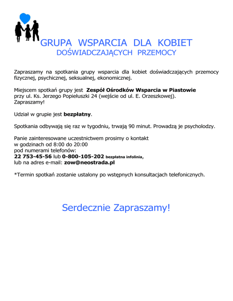 GRUPA WSPARCIA DLA KOBIET DOŚWIADCZAJĄCYCH PRZEMOCY Zapraszamy na spotkania grupy wsparcia dla kobiet doświadczających przemocy fizycznej, psychicznej, seksualnej, ekonomicznej. Miejscem spotkań grupy jest Zespół Ośrodków Wsparcia w Piastowie przy ul. Ks. Jerzego Popiełuszki 24 (wejście od ul. E. Orzeszkowej). Zapraszamy! Udział w grupie jest bezpłatny. Spotkania odbywają się raz w tygodniu, trwają 90 minut. Prowadzą je psycholodzy. Panie zainteresowane uczestnictwem prosimy o kontakt w godzinach od 8:00 do 20:00 pod numerami telefonów: 22 753-45-56 lub 0-800-105-202 bezpłatna infolinia, lub na adres e-mail: [email protected] *Termin spotkań zostanie ustalony po wstępnych konsultacjach telefonicznych. Serdecznie Zapraszamy!