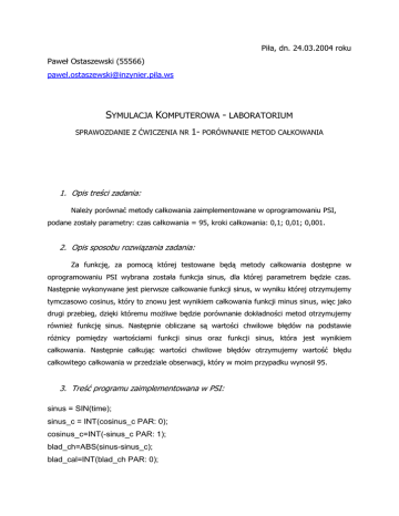 Piła, dn. 24.03.2004 roku Paweł Ostaszewski (55566) [email protected] SYMULACJA KOMPUTEROWA - LABORATORIUM SPRAWOZDANIE Z ĆWICZENIA NR 1- PORÓWNANIE METOD CAŁKOWANIA 1. Opis treści zadania: Należy porównać metody całkowania zaimplementowane w oprogramowaniu PSI, podane zostały parametry: czas całkowania = 95, kroki całkowania: 0,1; 0,01; 0,001. 2. Opis sposobu rozwiązania zadania: Za funkcję, za pomocą której testowane będą metody całkowania dostępne w oprogramowaniu PSI wybrana została funkcja sinus, dla której parametrem będzie czas. Następnie wykonywane jest pierwsze całkowanie funkcji sinus, w wyniku której otrzymujemy tymczasowo cosinus, który to znowu jest wynikiem całkowania funkcji minus sinus, więc jako drugi przebieg, dzięki któremu możliwe będzie porównanie dokładności metod otrzymujemy również funkcję sinus. Następnie obliczane są wartości chwilowe błędów na podstawie różnicy pomiędzy wartościami funkcji sinus oraz funkcji sinus, która jest wynikiem całkowania. Następnie całkując wartości chwilowe błędów otrzymujemy wartość błędu całkowitego całkowania w przedziale obserwacji, który w moim przypadku wynosił 95. 3. Treść programu zaimplementowana w PSI: sinus = SIN(time); sinus_c = INT(cosinus_c PAR: 0); cosinus_c=INT(-sinus_c PAR: 1); blad_ch=ABS(sinus-sinus_c); blad_cal=INT(blad_ch PAR: 0); 4. Tabela z wynikami pomiarów: metoda całkowania Euler Adams-Bashfort 2 Runge-Kutta 2 Runge-Kutta 3 Runge-Kutta 4 Runge-Kutta 2-3 Runge-Kutta 4VR krok całkowania 0,1 0,01 0,001 0,01 0,01 0,001 0,1 0,01 0,001 0,1 0,01 0,001 0,1 0,01 0,001 0,1 0,01 0,001 0,1 0,01 0,001 błąd obliczeń 1713,14 16,6687 1,4472 13,7471 0,1188 1,19*e-4 5,4843 4,77*e-2 4,74*e-4 2,7384 2,39*e-2 3,04*e-4 5,9*e-2 5,56*e-4 1,63*e-4 7,95*e-2 2,39*e-2 2,39*e-2 1,95*e-2 5,56*e-4 5,45*e-4 czas obliczeń [sek] 0,05 0,11 0,31 0,05 0,17 1,31 0,05 0,16 1,86 0,06 0,33 2,53 0,05 0,33 2,97 0,27 0,28 0,33 0,32 0,33 0,39 5. Wnioski: Po przeanalizowaniu dostępnych w oprogramowaniu PSI metod całkowania mogę stwierdzić iż rezultaty otrzymane w wyniku pomiarów różnią się zarówno czasem realizacji jak i błędem jakim obarczone jest rozwiązanie. Parametrem, który najbardziej rzutuje na rezultat pomiaru jest krok całkowania, wykryłem pewną zależność, która jest wspólna dla wszystkich testowanych metod całkowania, a mianowicie wraz ze zmniejszeniem kroku całkowania wielkość błędu jakim obarczone jest rozwiązanie znacznie się obniża nawet o dwa rzędy wielkości co oczywiście rzutuje na jakość rozwiązania, ale co za tym idzie wydłużaczas obliczeń. Czas w jakim generowane były rozwiązania przez oprogramowanie PSI dla podanych wartości kroku całkowania był jednak stosunkowo niewielki, nie większy niż 3 sekundy więc akceptowalny. Pomiary wykonywane były na komputerach z procesorem Intel Pentium IV 1,4 GHz z zainstalowanym systemem operacyjnym Microsoft Windows 2000. Przyglądając się bliżej badanym metodom całkowania możemy stwierdzić iż najdokładniejszą metodą całkowania jest niewątpliwie metoda Runge-Kutta 4VR, gdyż w wyniku jej działania powstawał najmniejszy błąd, dodatkowo ta metoda jest dość efektywna jeżeli rozważyć kryterium jakim jest czas realizacji obliczeń. Metoda Eulera natomiast jest metodą najmniej dokładną lecz jest stosunkowo szybką metodą. Metody Runge-Kutta 2, Runge-Kutta 3, Runge-Kutta 4 są zbliżone do siebie zarówno pod względem efektywności działania jak i skuteczności.