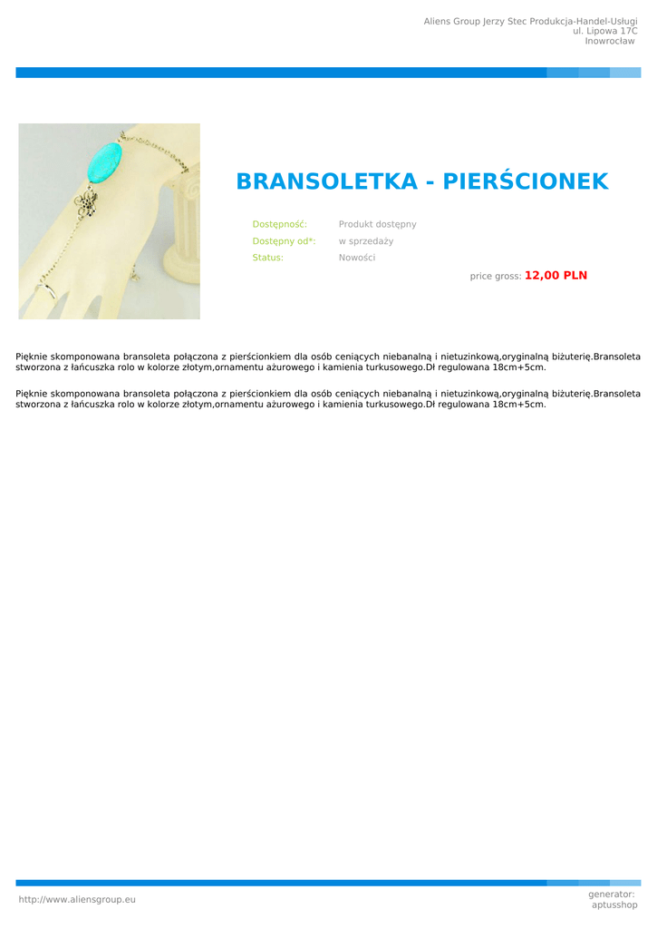 Aliens Group Jerzy Stec Produkcja-Handel-Usługi ul. Lipowa 17C Inowrocław BRANSOLETKA - PIERŚCIONEK Dostępność: Produkt dostępny Dostępny od*: w sprzedaży Status: Nowości price gross: 12,00 PLN Pięknie skomponowana bransoleta połączona z pierścionkiem dla osób ceniących niebanalną i nietuzinkową,oryginalną biżuterię.Bransoleta stworzona z łańcuszka rolo w kolorze złotym,ornamentu ażurowego i kamienia turkusowego.Dł regulowana 18cm+5cm. Pięknie skomponowana bransoleta połączona z pierścionkiem dla osób ceniących niebanalną i nietuzinkową,oryginalną biżuterię.Bransoleta stworzona z łańcuszka rolo w kolorze złotym,ornamentu ażurowego i kamienia turkusowego.Dł regulowana 18cm+5cm. http://www.aliensgroup.eu generator: aptusshop