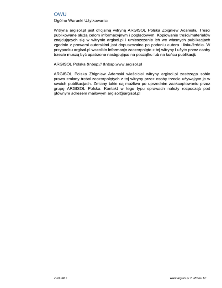 OWU Ogólne Warunki Użytkowania Witryna argisol.pl jest oficjalną witryną ARGISOL Polska Zbigniew Adamski. Treści publikowane służą celom informacyjnym i poglądowym. Kopiowanie treści/materiałów znajdujących się w witrynie argisol.pl i umieszczanie ich we własnych publikacjach zgodnie z prawami autorskimi jest dopuszczalne po podaniu autora i linku/źródła. W przypadku argisol.pl wszelkie informacje zaczerpnięte z tej witryny i użyte przez osoby trzecie muszą być opatrzone następująco na początku lub na końcu publikacji: ARGISOL Polska // www.argisol.pl ARGISOL Polska Zbigniew Adamski właściciel witryny argisol.pl zastrzega sobie prawo zmiany treści zaczerpniętych z tej witryny przez osoby trzecie używające je w swoich publikacjach. Zmiany takie są możliwe po uprzednim zaakceptowaniu przez grupę ARGISOL Polska. Kontakt w tego typu sprawach należy rozpocząć pod głównym adresem mailowym [email protected] 7.03.2017 www.argisol.pl // strona 1/1
