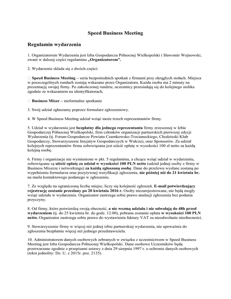 Speed Business Meeting Regulamin wydarzenia 1. Organizatorem Wydarzenia jest Izba Gospodarcza Północnej Wielkopolski i Sławomir Wojnowski, zwani w dalszej części regulaminu „Organizatorem”. 2. Wydarzenie składa się z dwóch części: Speed Business Meeting – seria bezpośrednich spotkań z firmami przy okrągłych stołach. Miejsca w poszczególnych rundach zostają wskazane przez Organizatora. Każda osoba ma 2 minuty na prezentację swojej firmy. Po zakończonej rundzie, uczestnicy przesiadają się do kolejnego stolika zgodnie ze wskazaniem na identyfikatorach, Business Mixer – nieformalne spotkanie 3. Swój udział zgłaszamy poprzez formularz zgłoszeniowy. 4. W Speed Business Meeting udział wziąć może trzech reprezentantów firmy. 5. Udział w wydarzeniu jest bezpłatny dla jednego reprezentanta firmy zrzeszonej w Izbie Gospodarczej Północnej Wielkopolski, firm członków organizacji partnerskich pierwszej edycji Wydarzenia (tj. Forum Gospodarcze Powiatu Czarnkowsko-Trzcianeckiego, Chodzieski Klub Gospodarczy, Stowarzyszenie Inicjatyw Gospodarczych w Wałczu), oraz Sponsorów. Za udział kolejnych reprezentantów firma zobowiązana jest uiścić opłatę w wysokości 100 zł netto za każdą kolejną osobę. 6. Firmy i organizacje nie wymienione w pkt. 5 regulaminu, a chcące wziąć udział w wydarzeniu, zobowiązane są uiścić opłatę za udział w wysokości 100 PLN netto (udział jednej osoby z firmy w Business Mixerze i networkingu) za każdą zgłoszoną osobę. Dane do przelewu wysłane zostaną po wypełnieniu formularza oraz pozytywnej weryfikacji zgłoszenia, nie później niż do 21 kwietnia br. na maila kontaktowego podanego w zgłoszeniu. 7. Ze względu na ograniczoną liczbę miejsc, liczy się kolejność zgłoszeń. E-mail potwierdzający rejestrację zostanie przesłany po 20 kwietnia 2016 r. Osoby niezarejestrowane, nie będą mogły wziąć udziału w wydarzeniu. Organizator zastrzega sobie prawo anulacji zgłoszenia bez podania przyczyny. 8. Od firmy, które potwierdzą swoją obecność, a nie wezmą udziału i nie odwołają do 48h przed wydarzeniem (tj. do 25 kwietnia br. do godz. 12.00), pobrana zostanie opłata w wysokości 100 PLN netto. Organizator zastrzega sobie prawo do wystawienia faktury VAT za nieodwołanie nieobecności. 9. Stowarzyszenie firmy w więcej niż jednej izbie partnerskiej wydarzenia, nie upoważnia do zgłoszenia bezpłatnie więcej niż jednego przedstawiciela. 10. Administratorem danych osobowych zebranych w związku z uczestnictwem w Speed Business Meeting jest Izba Gospodarcza Północnej Wielkopolski. Dane osobowe Uczestników będą przetwarzane zgodnie z przepisami ustawy z dnia 29 sierpnia 1997 r. o ochronie danych osobowych (tekst jednolity: Dz. U. z 2015r. poz. 2135). 11. Zgłoszenie uczestnictwa w wydarzeniu i podanie swoich danych osobowych (w ramach procedury rejestracji, poprzez przekazanie wizytówki lub w innej formie) będzie traktowane jako potwierdzenie zgody Zgłaszającego na umieszczenie jego danych osobowych w bazie danych IGPW w celach kontaktowych, przesyłania informacji reklamowo-komercyjnych drogą elektroniczną na podany w zgłoszeniu adres e-mail w przypadku wyrażenia dobrowolnej zgody, a także w celu udostępnienia i umożliwienia uczestnikom, sponsorom i partnerom wydarzenia kontaktu ze Zgłaszającym (w celu zaprezentowania informacji reklamowo-komercyjnych lub propozycji współpracy). 12. Biorąc udział w wydarzeniu, uczestnicy wyrażają zgodę na wykorzystywanie przez Izbę Gospodarczą Północnej Wielkopolski, Partnerów oraz Sponsorów zdjęć i filmów z ich wizerunkiem w relacji z wydarzenia i materiałach promocyjnych ww. podmiotów.